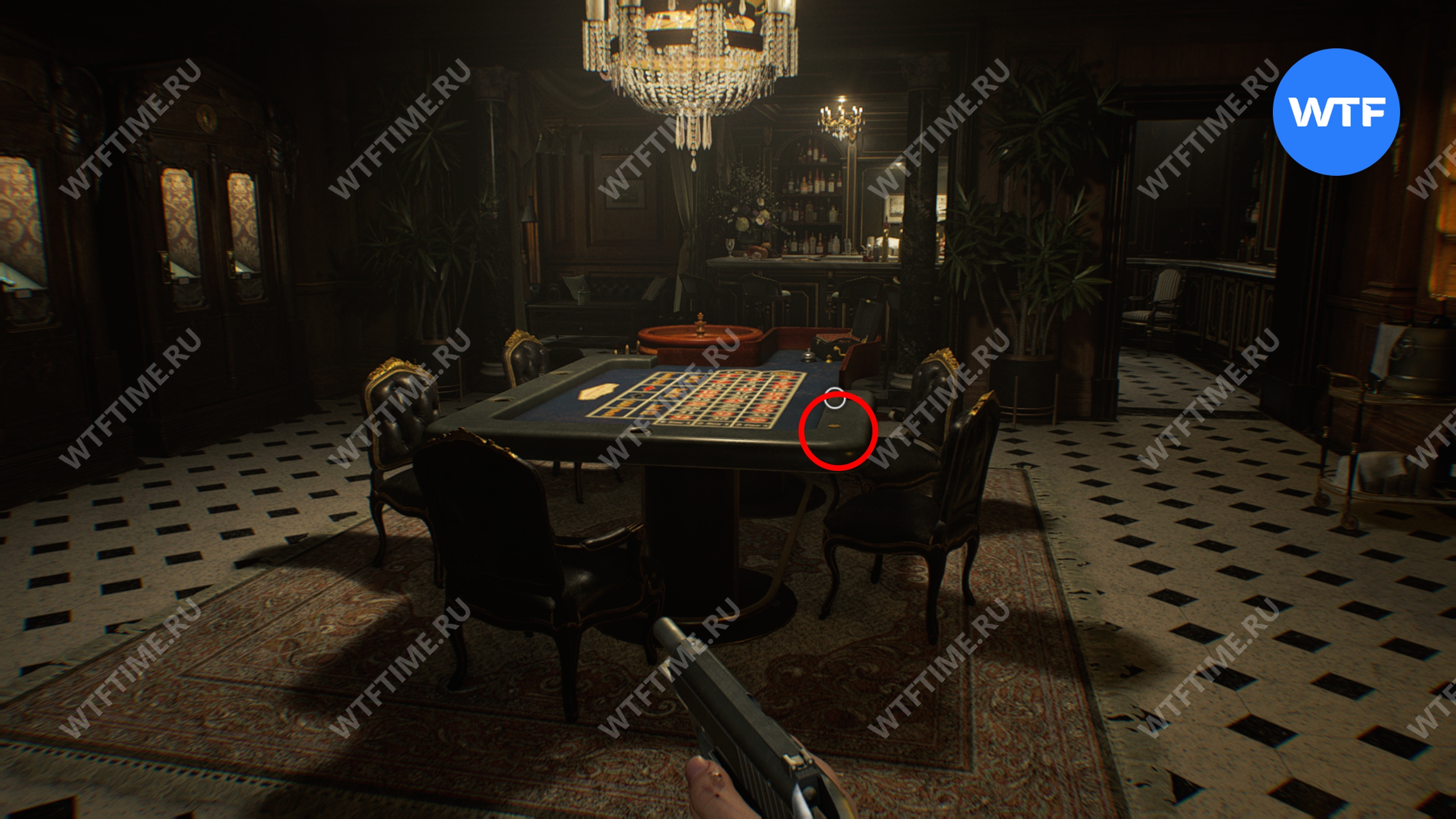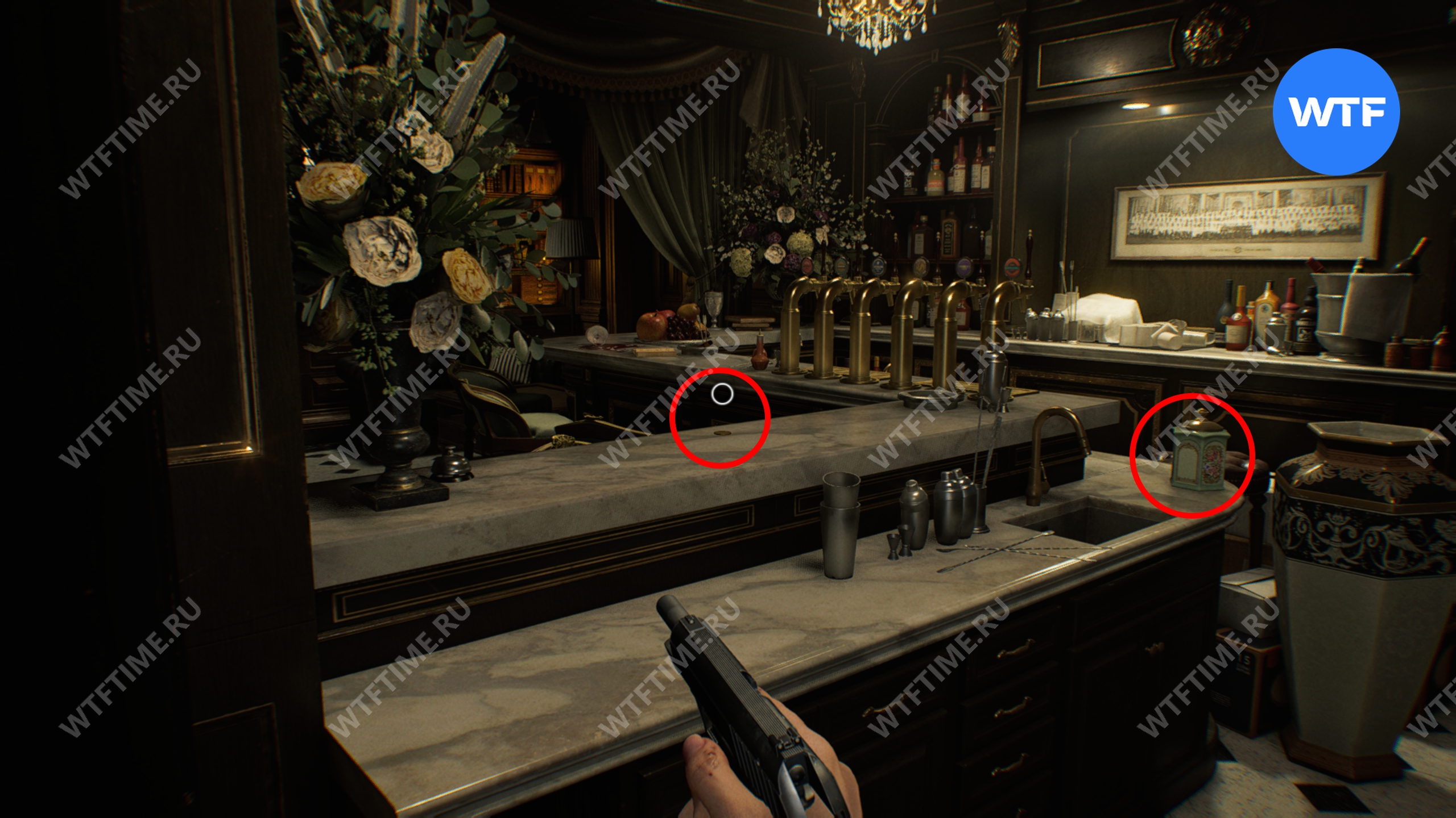 В этой же гостиной на барной стойке в правом дальнем углу можно найти еще две монеты: одна лежит прямо на виду, а вторая спрятана внутри стеклянного фонарика, который нужно разбить.