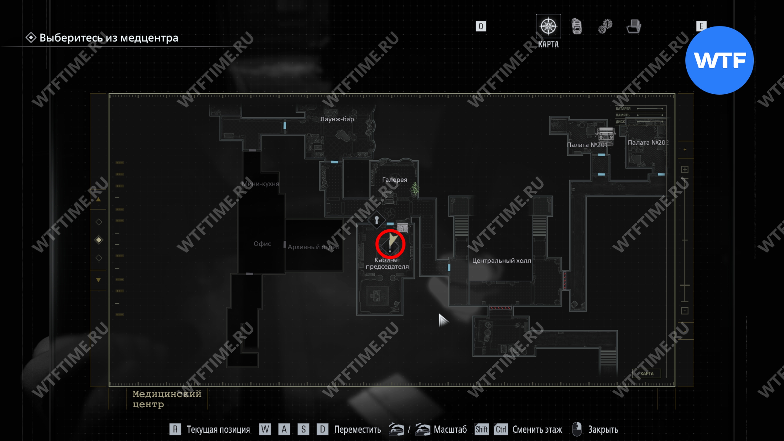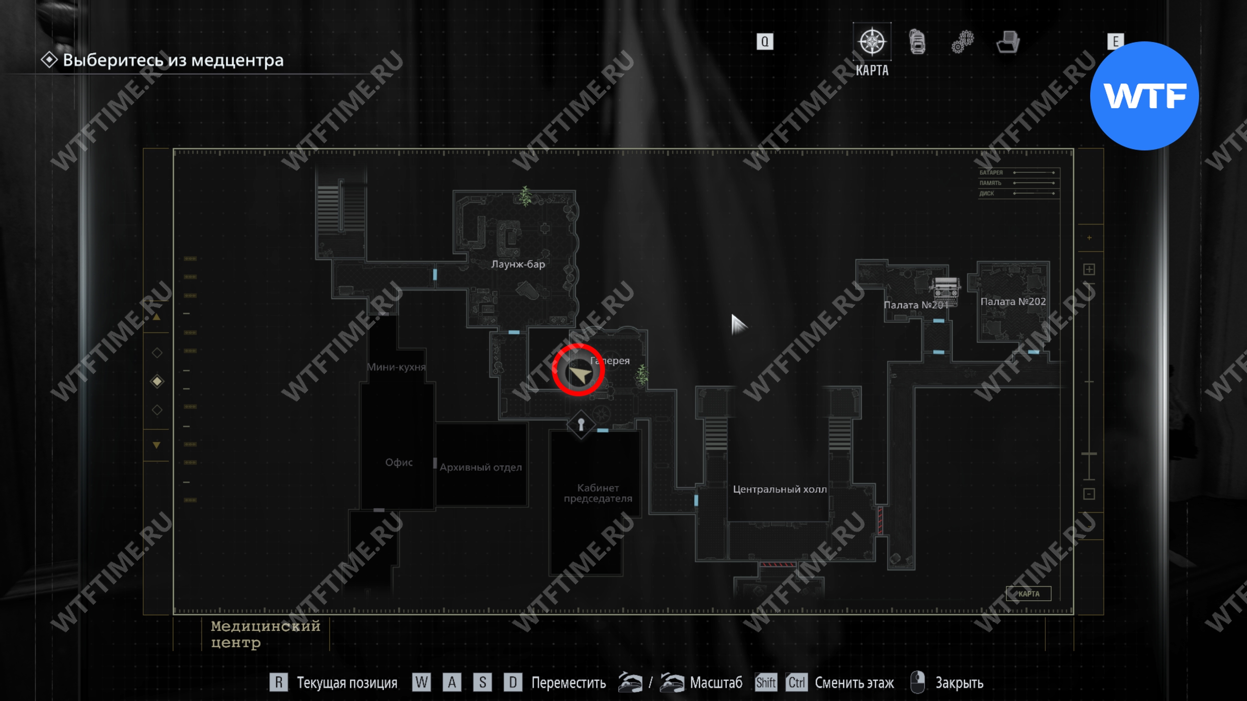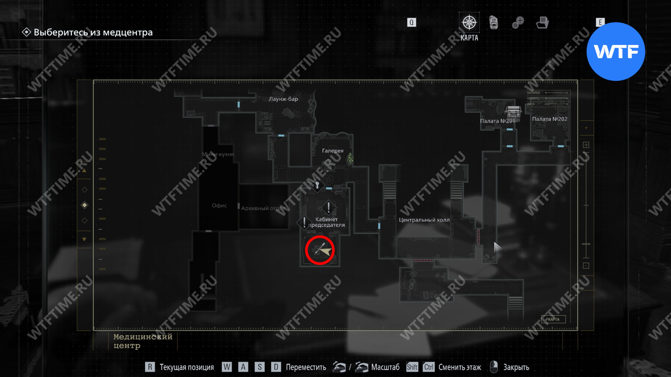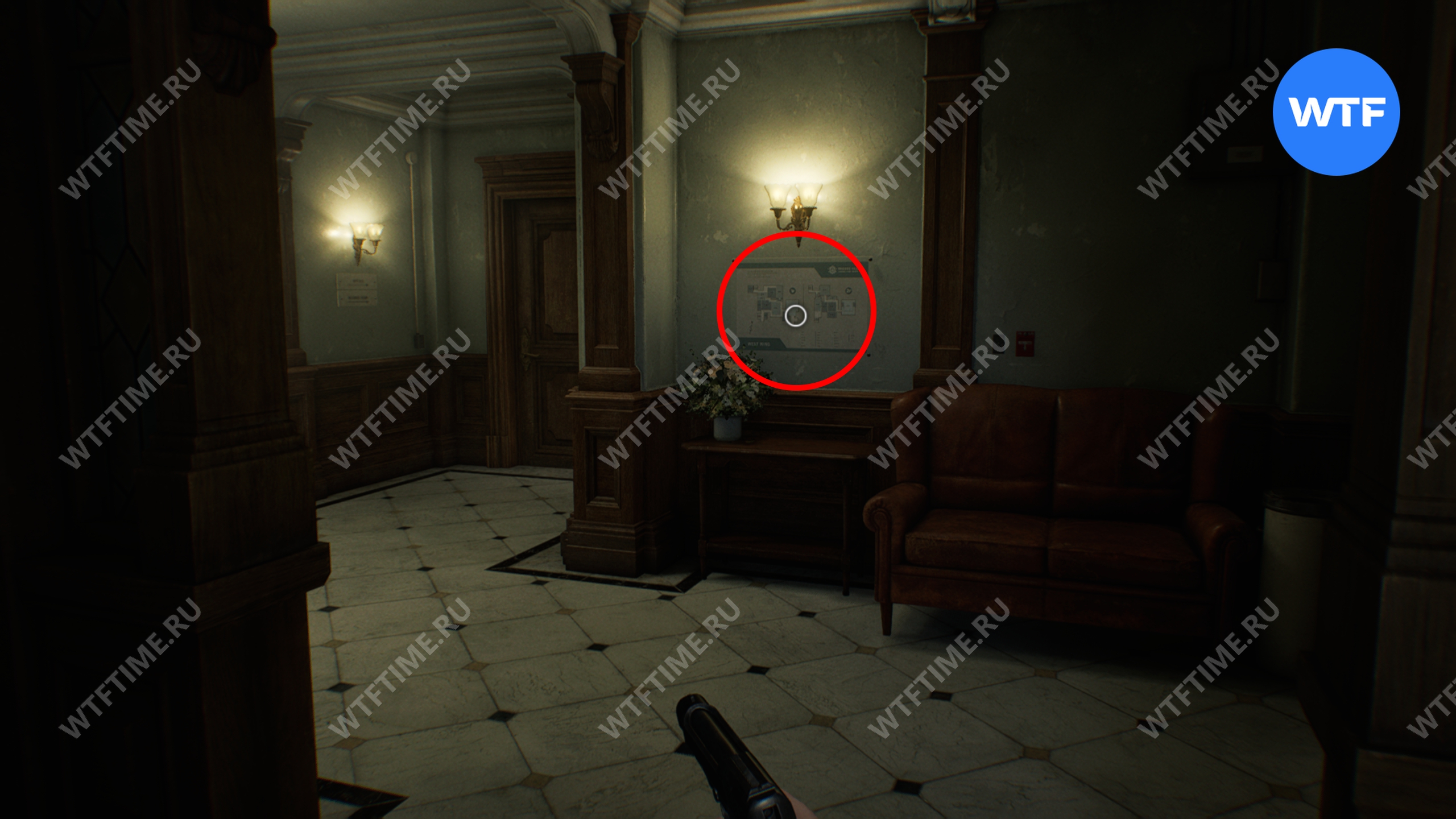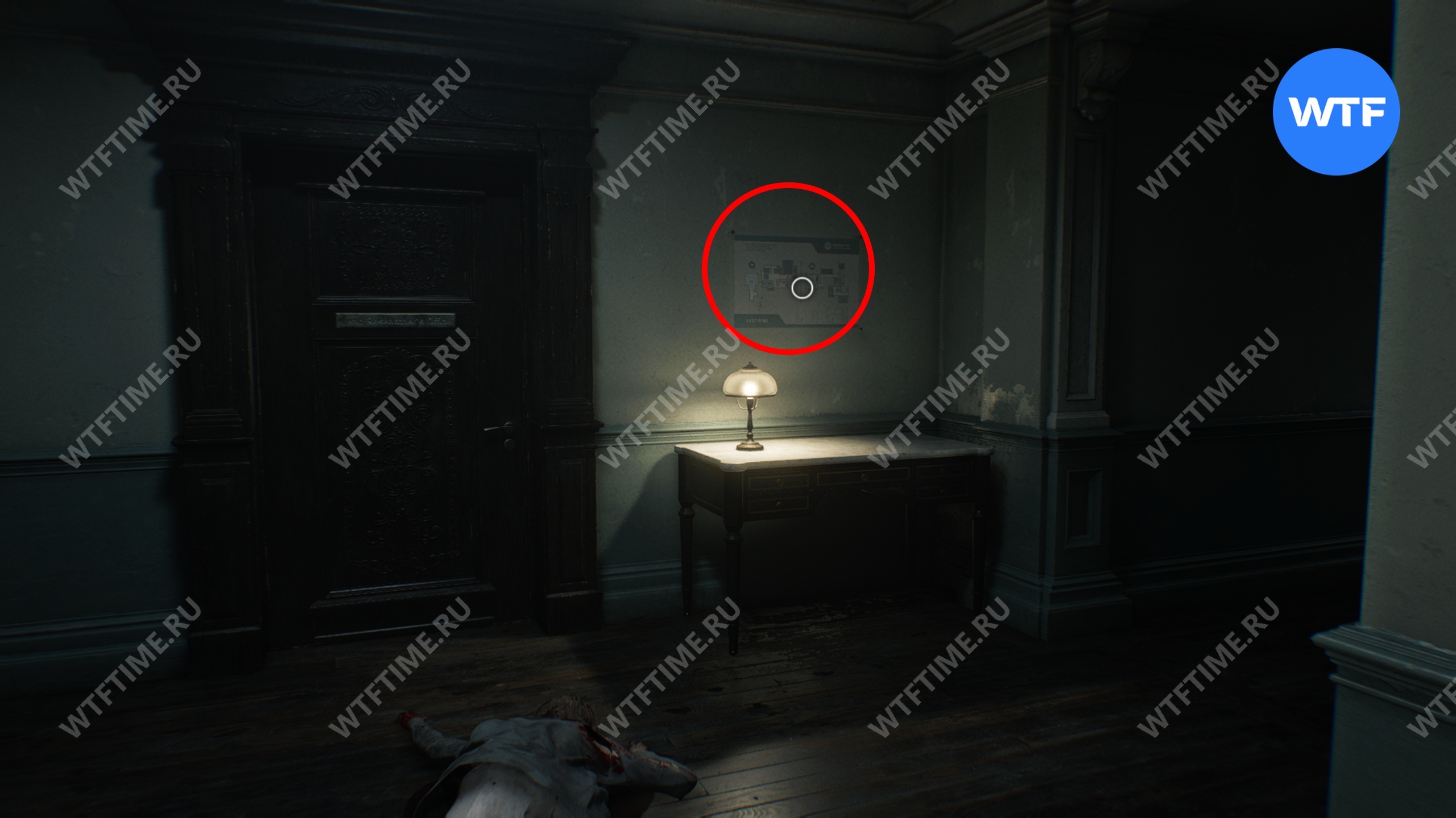 Теперь поднимитесь по лестнице и на стене прямо перед вами увидите карту восточного крыла.