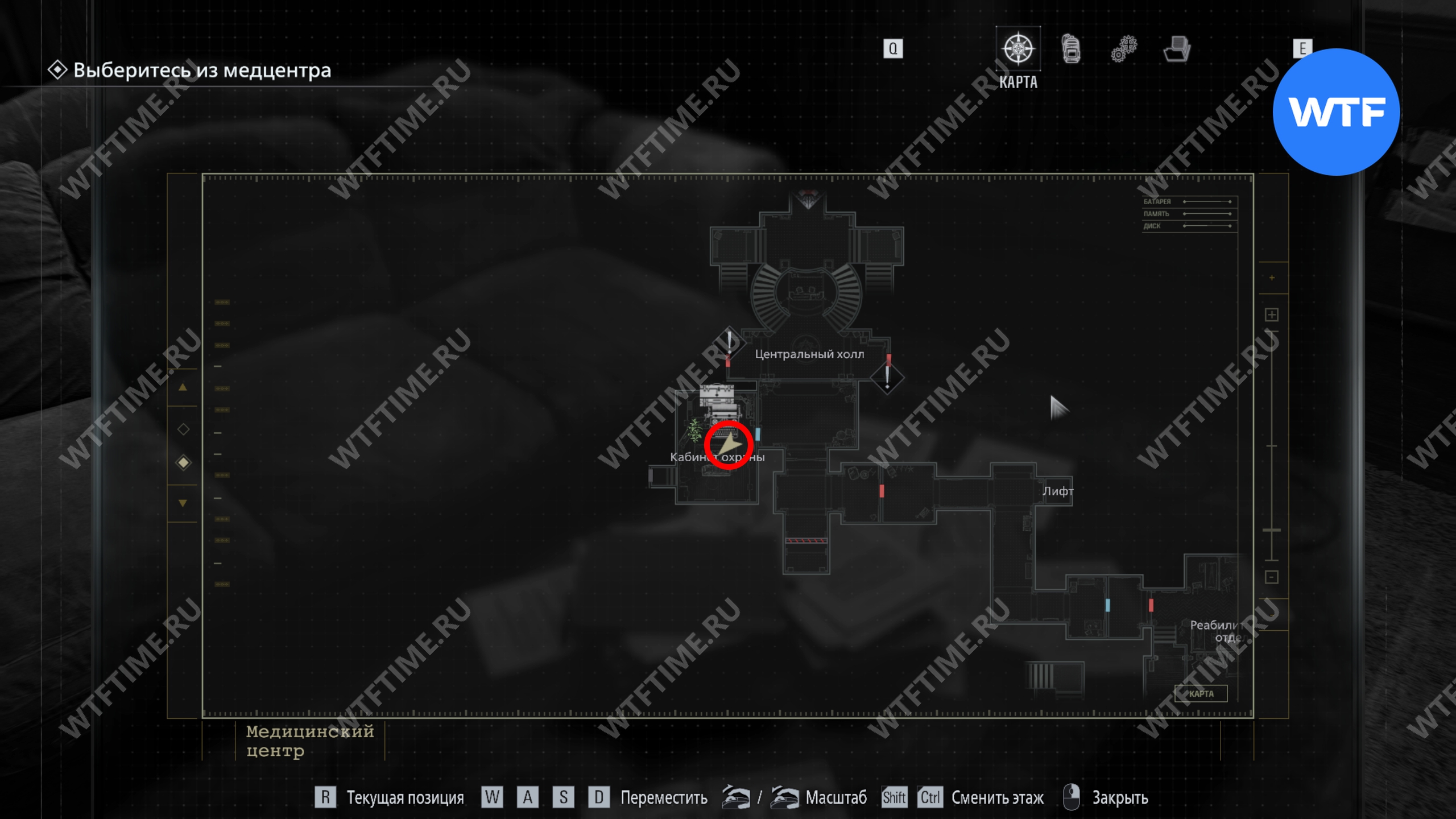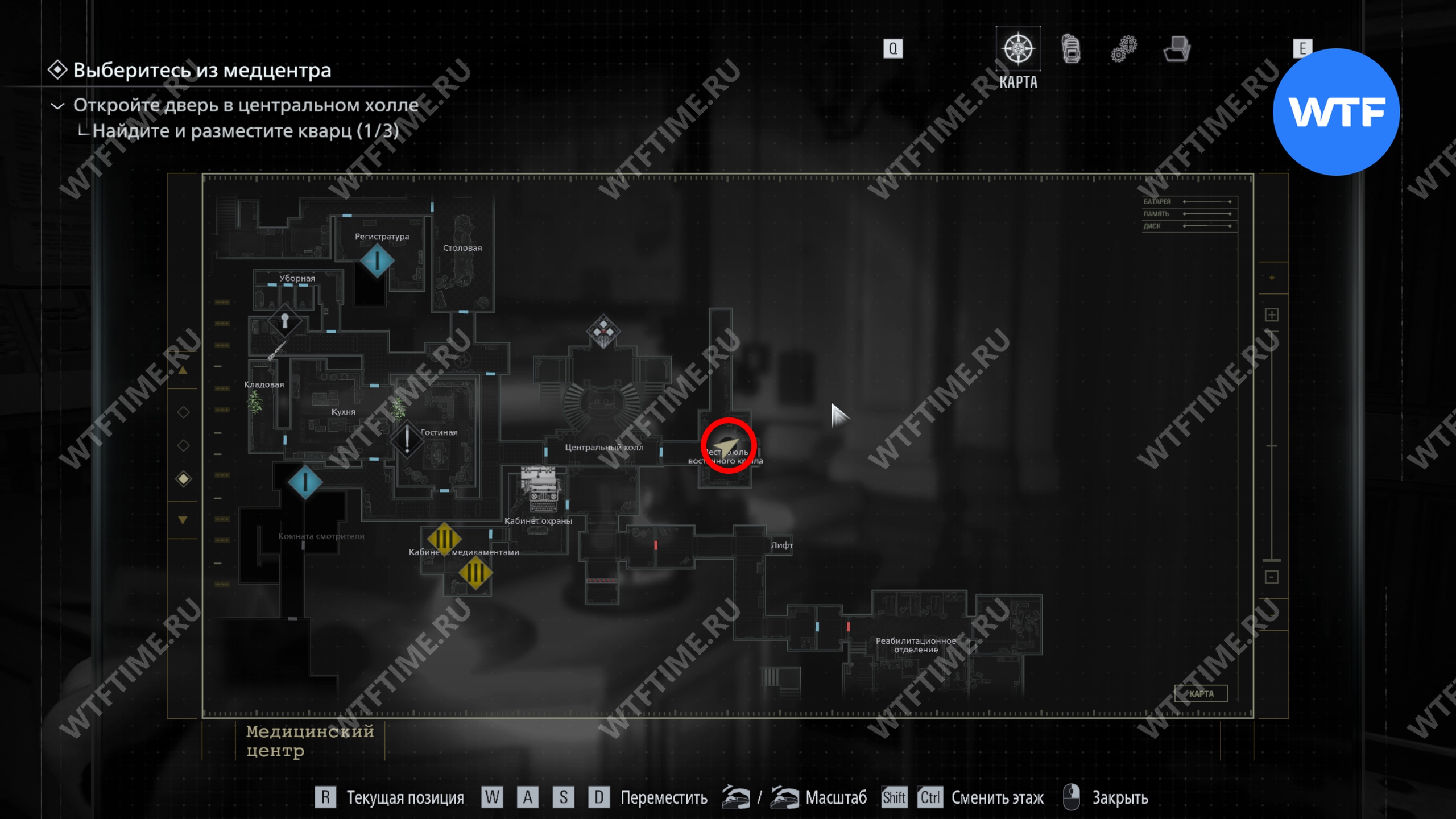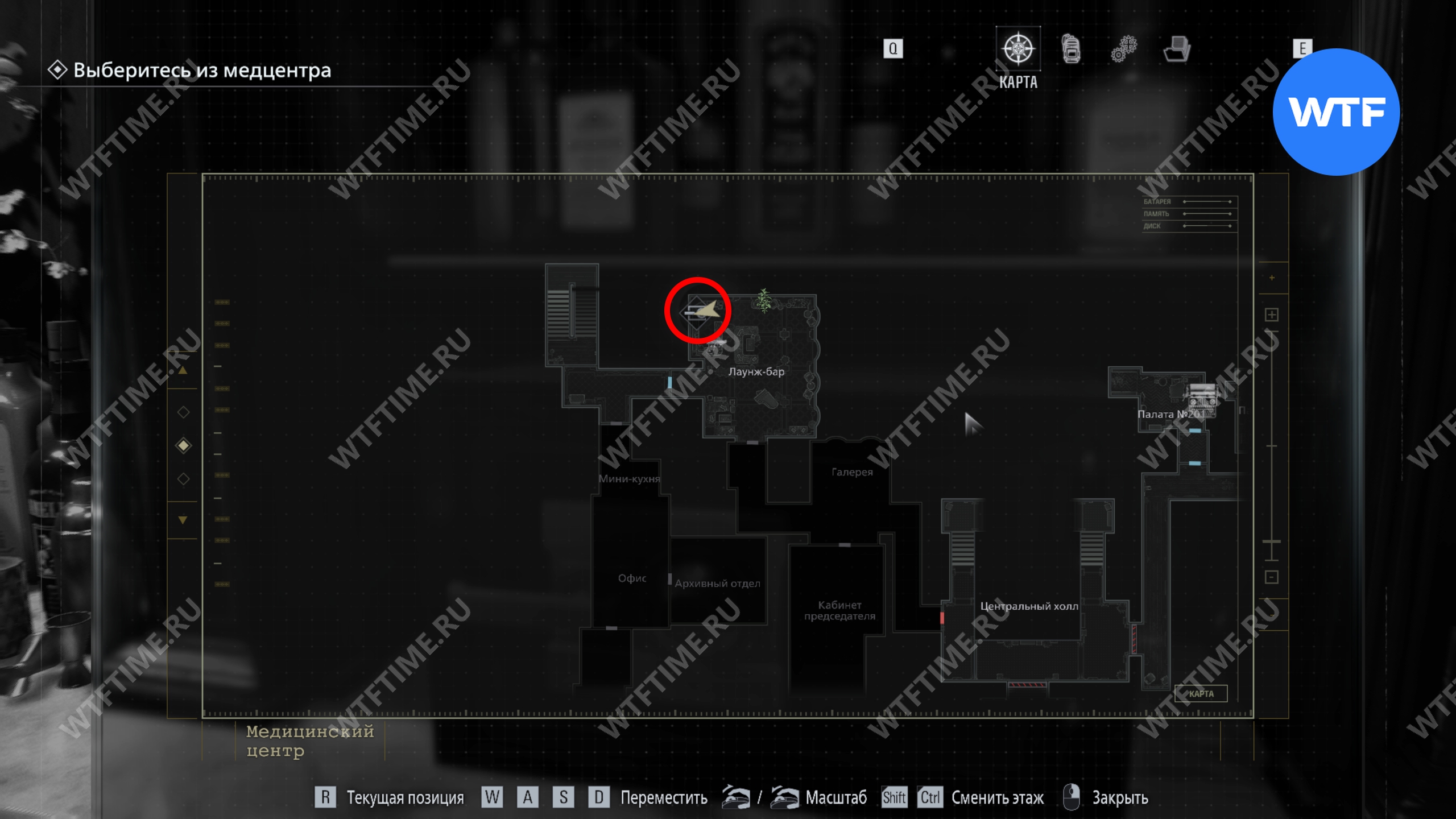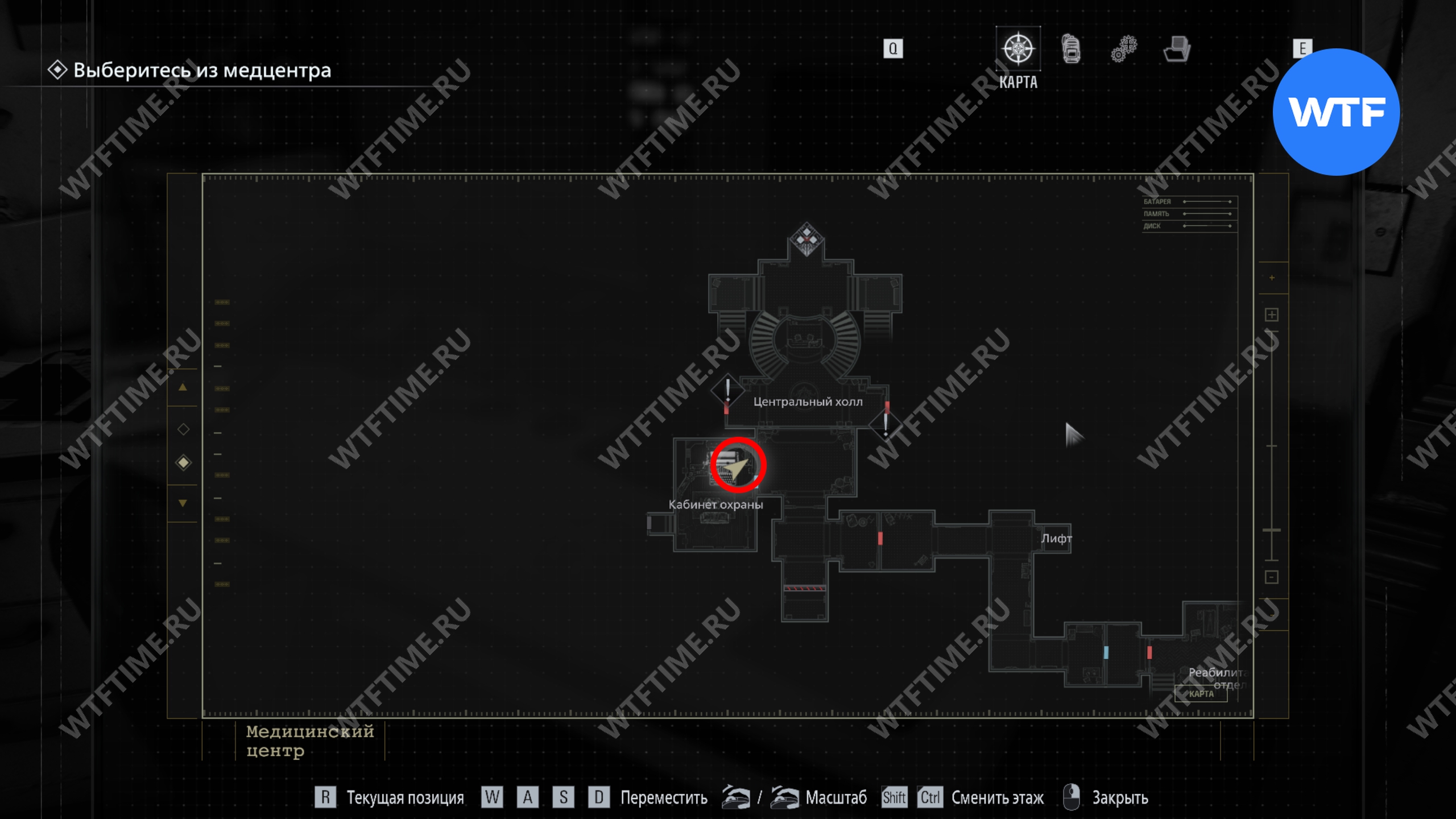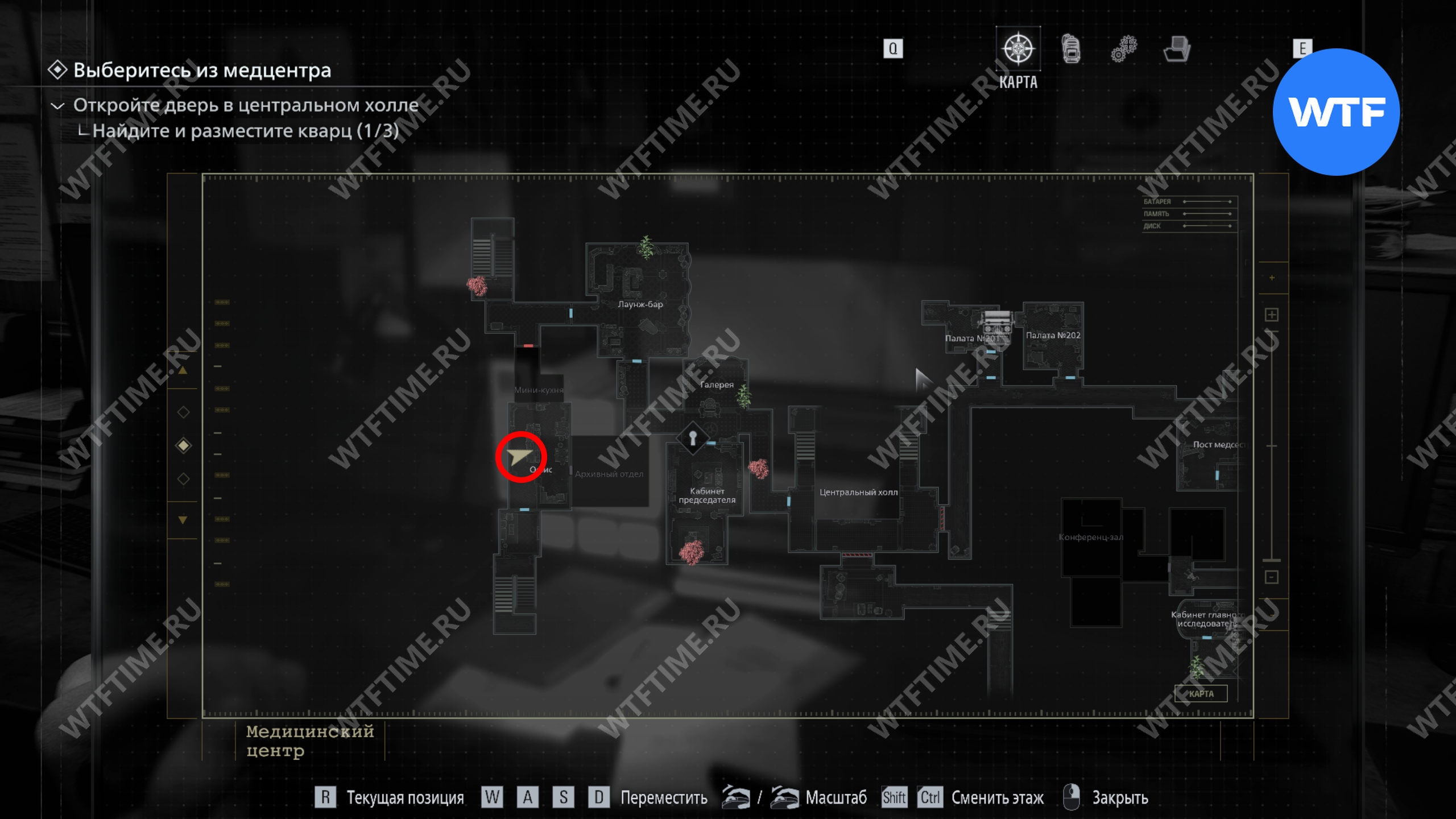 Теперь поднимитесь по лестнице и на стене прямо перед вами увидите карту восточного крыла.
