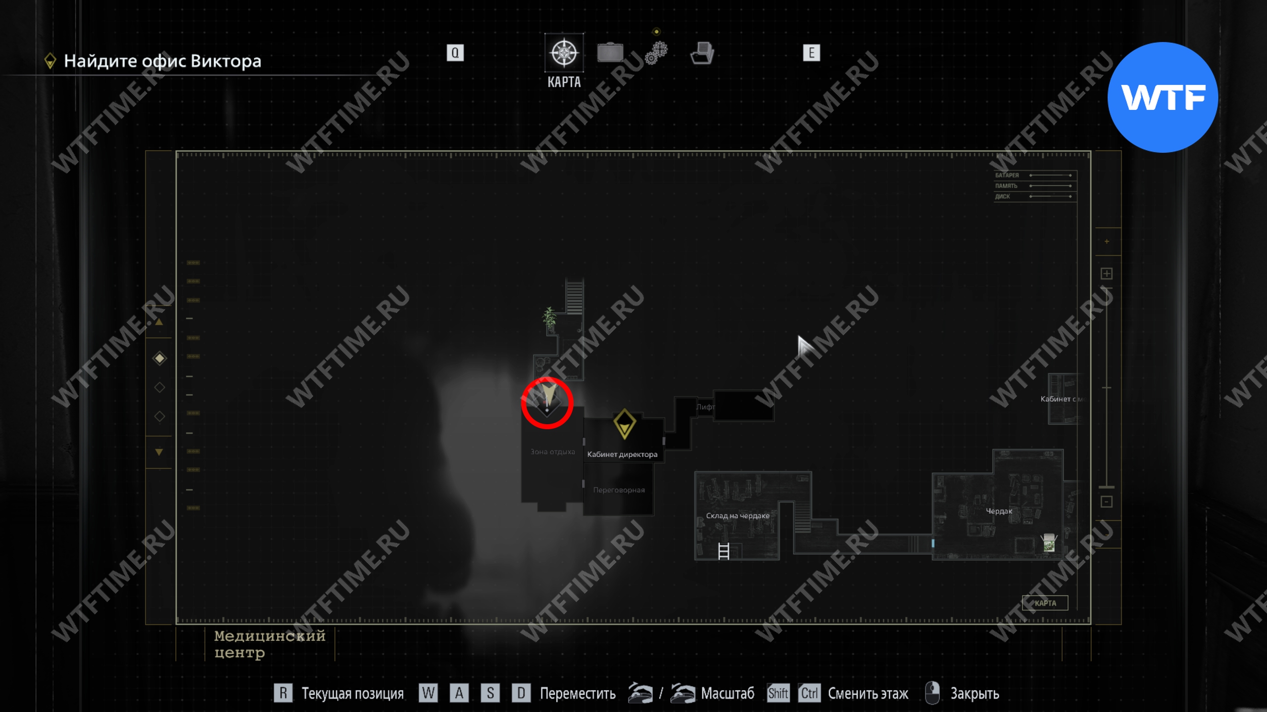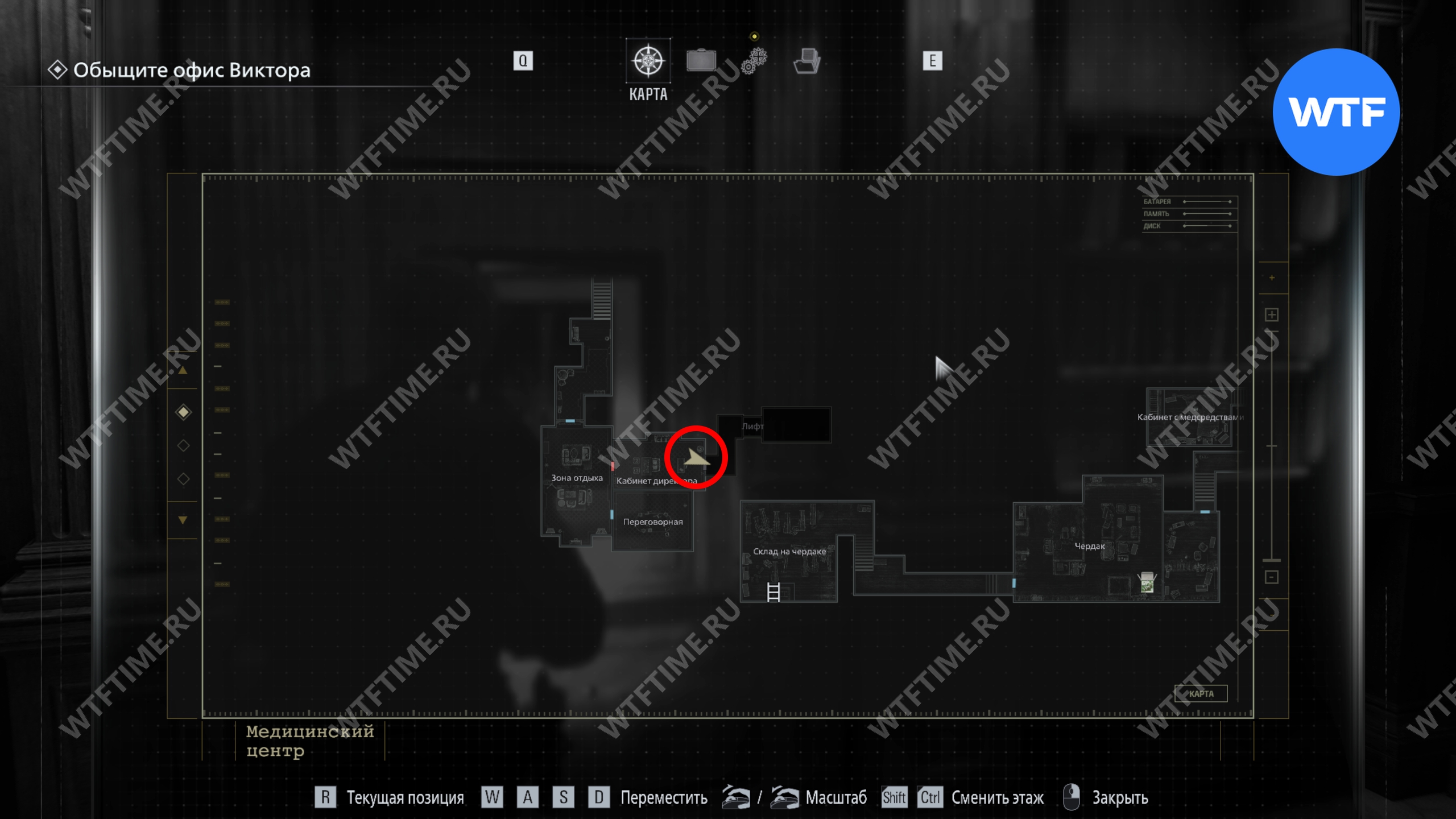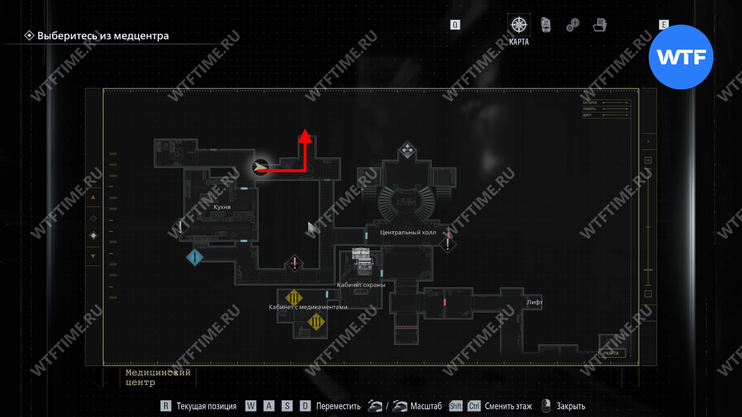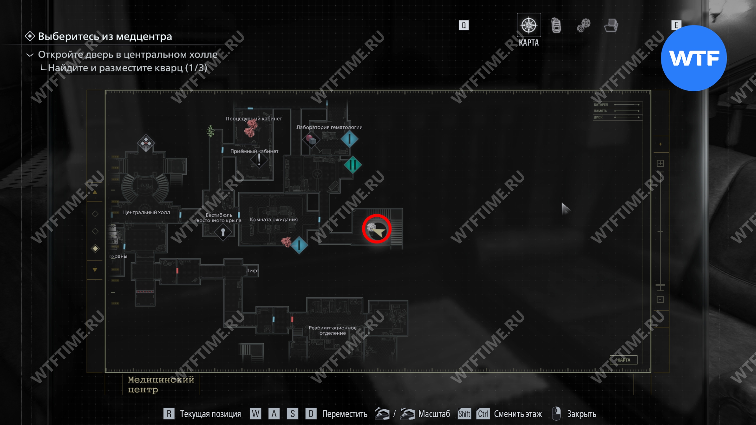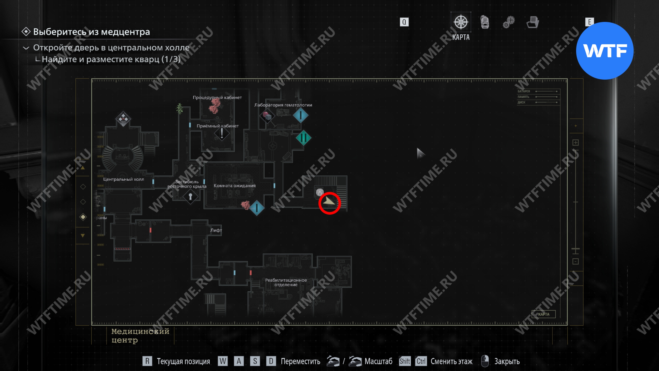Теперь поднимитесь по лестнице и на стене прямо перед вами увидите карту восточного крыла.