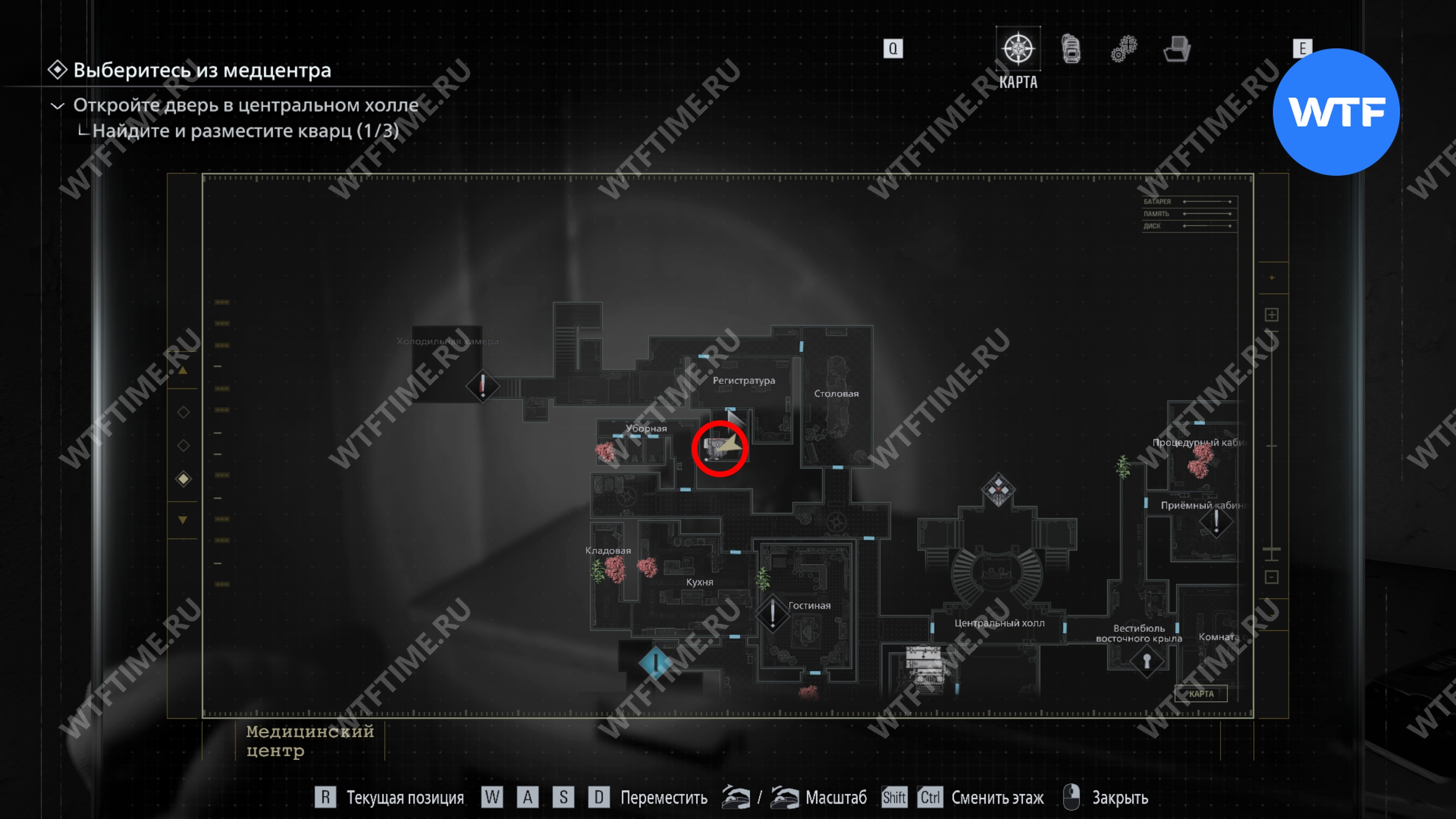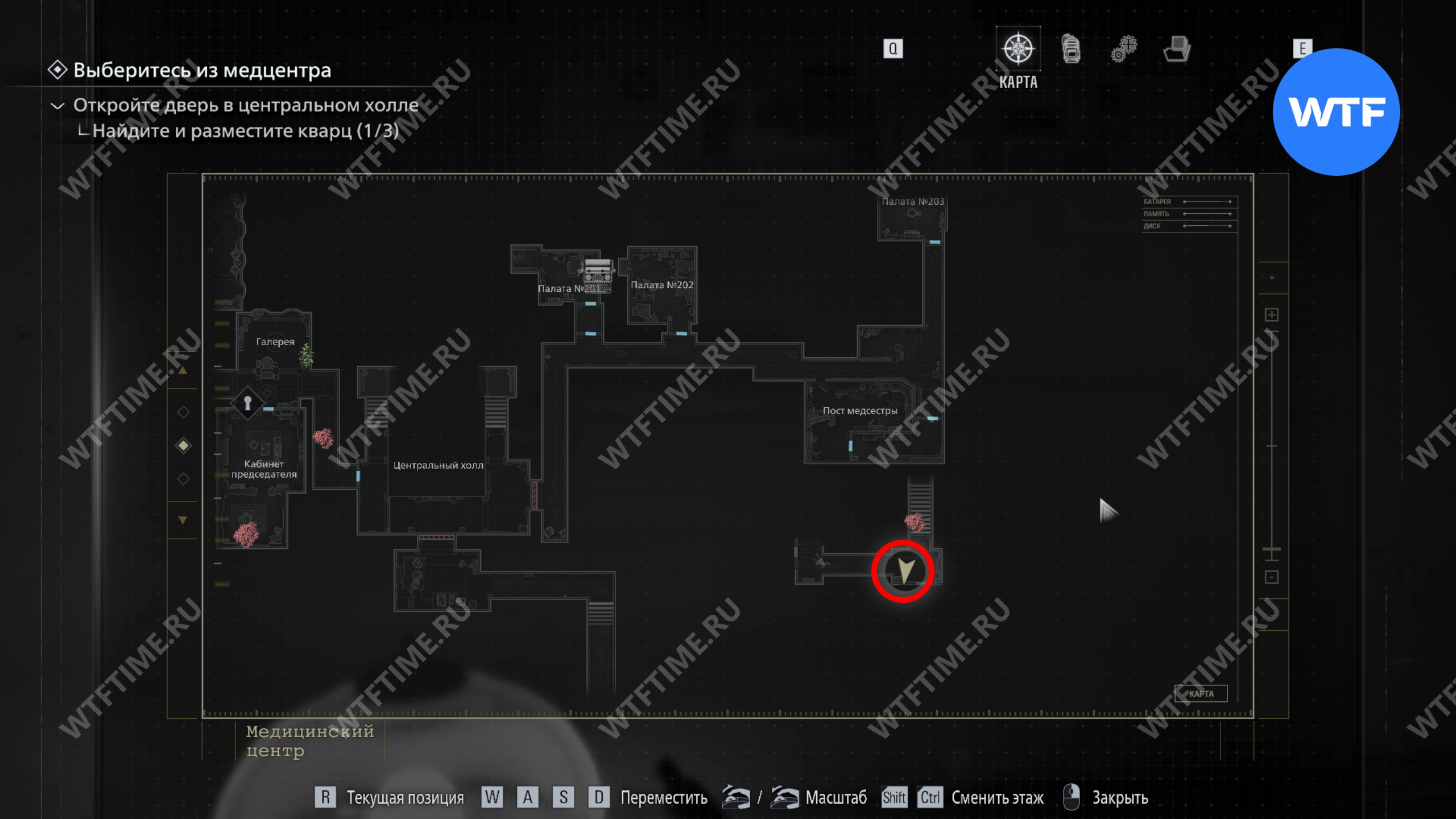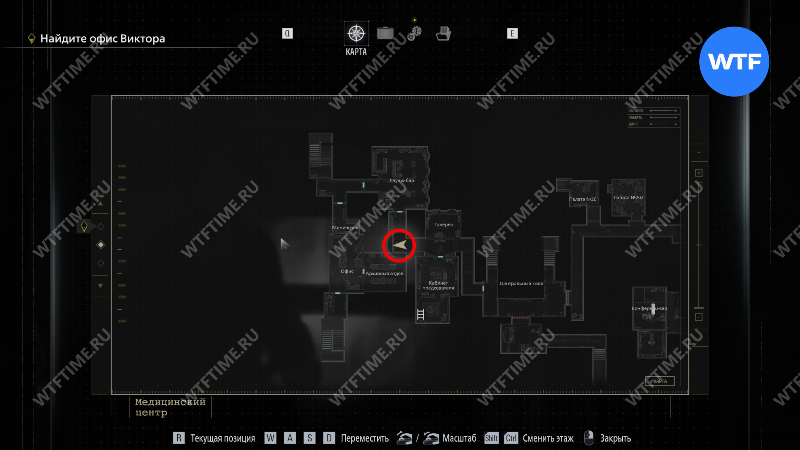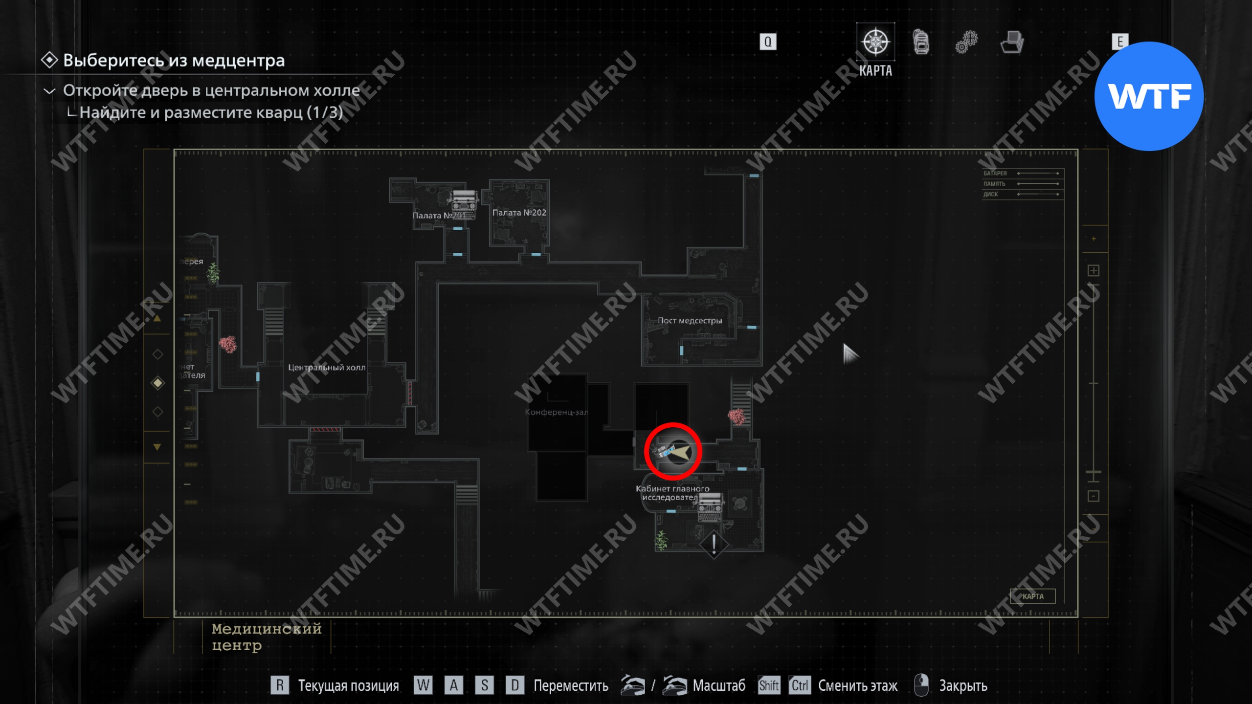 Теперь поднимитесь по лестнице и на стене прямо перед вами увидите карту восточного крыла.
