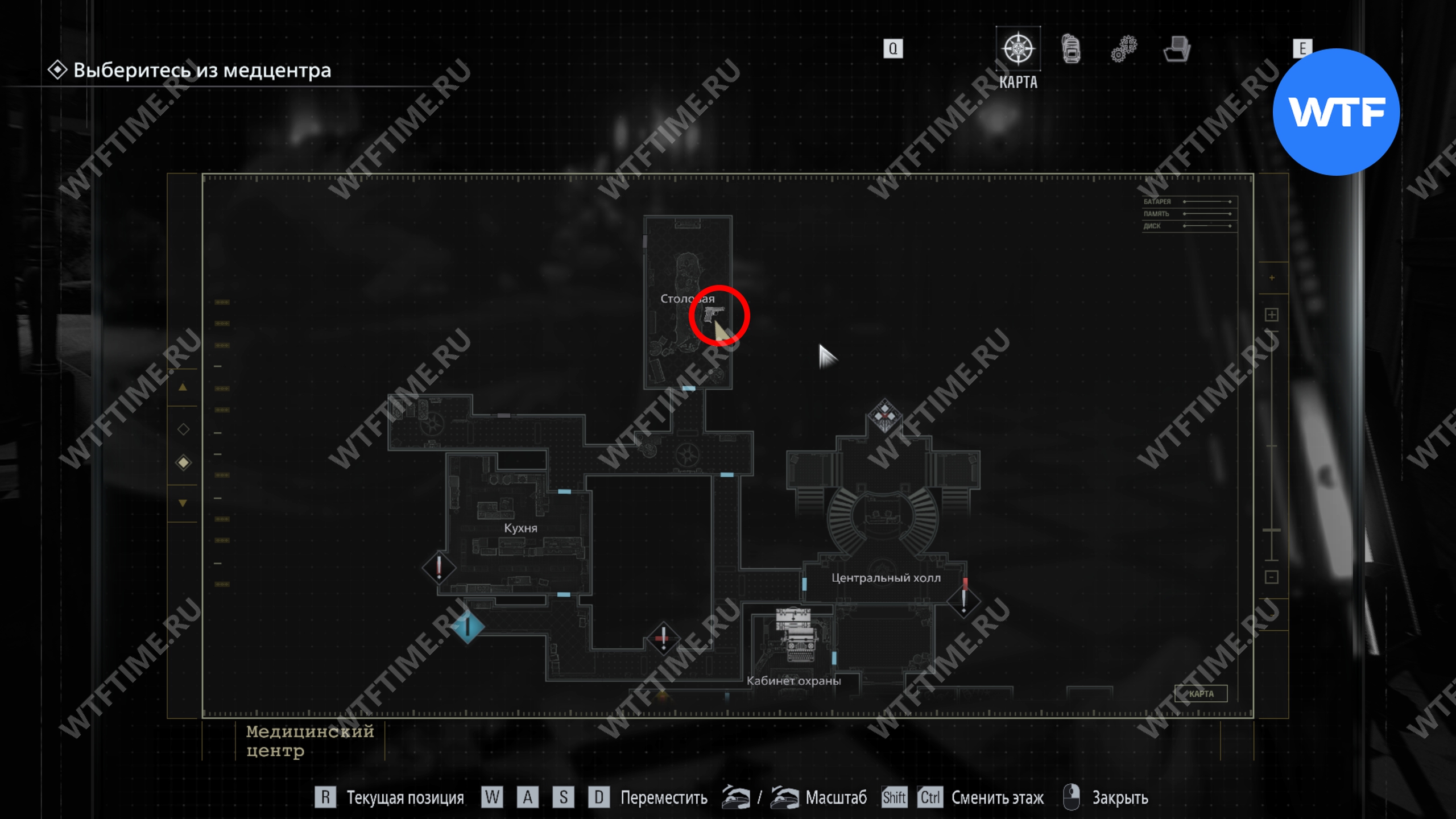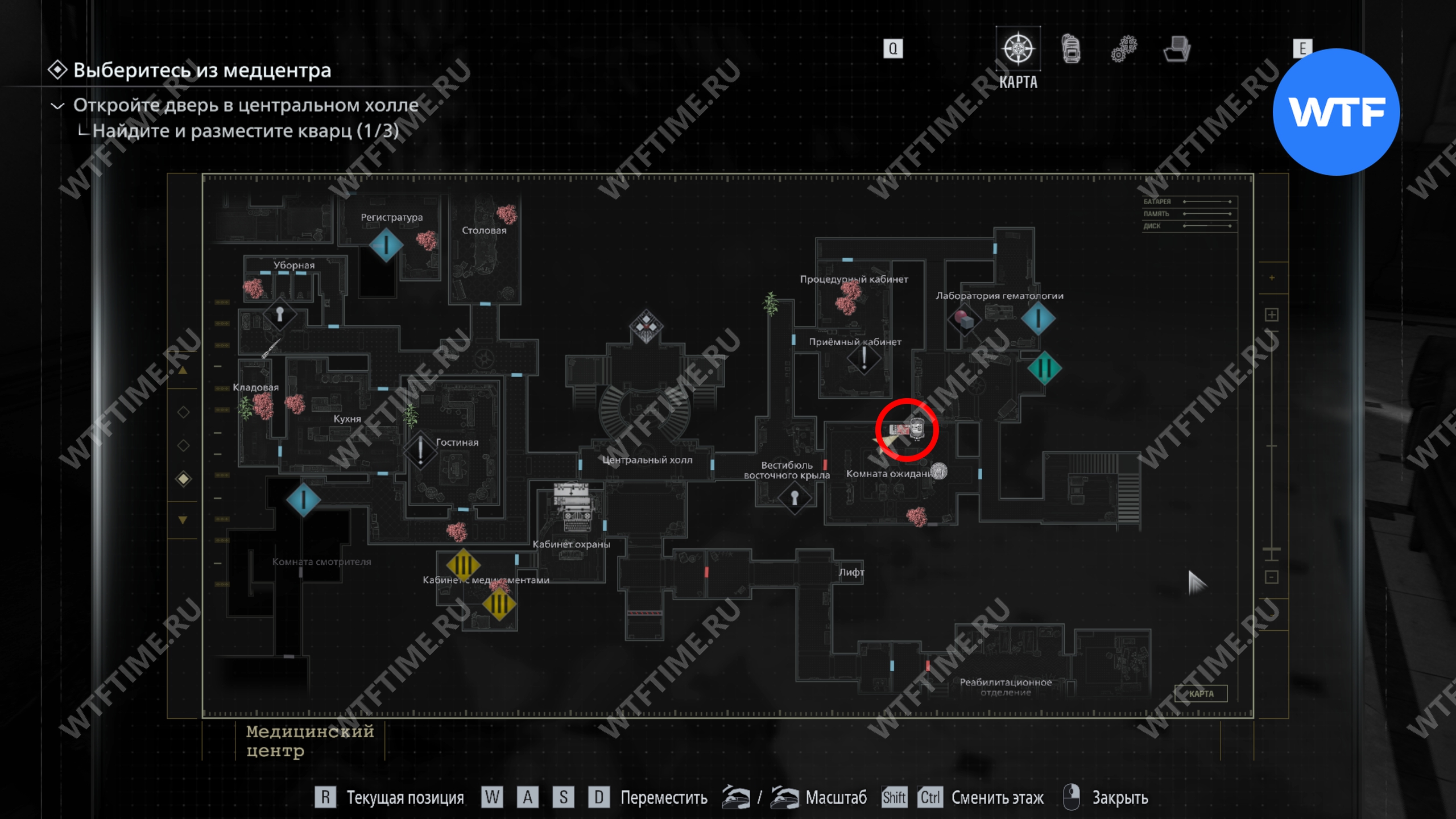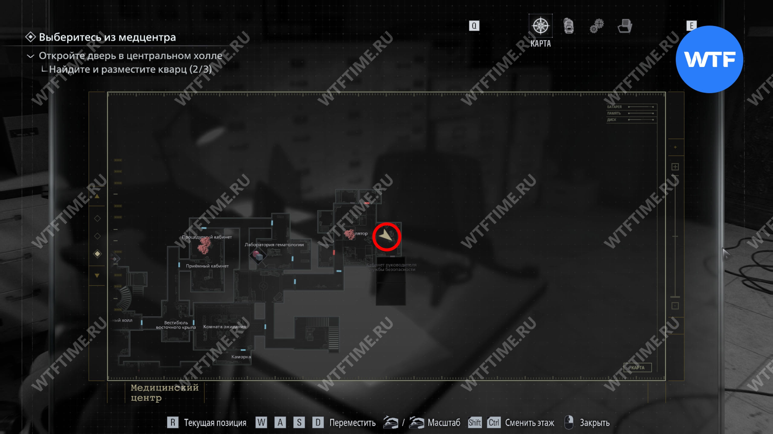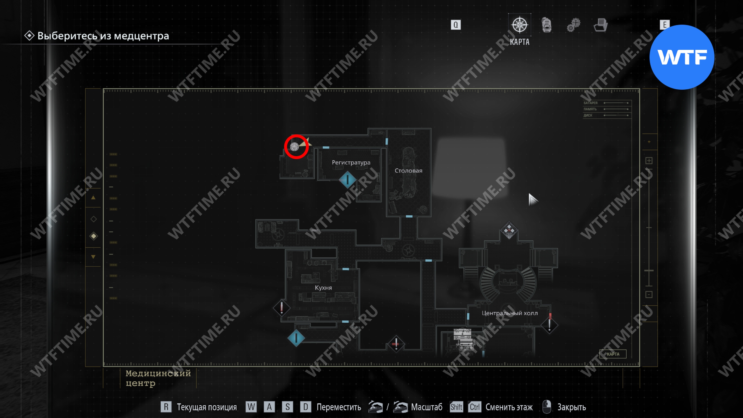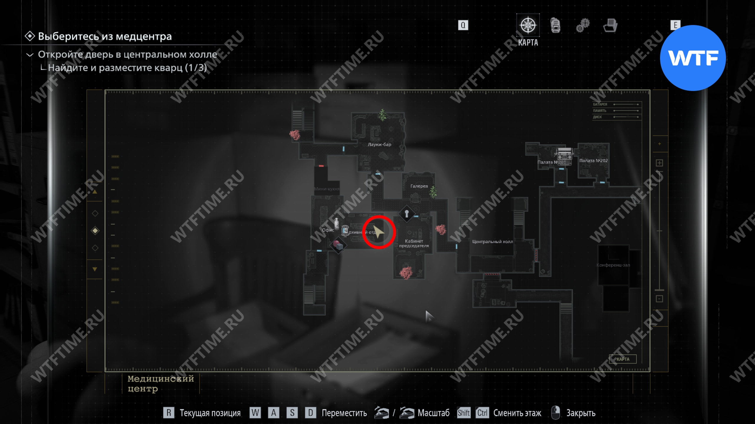 Теперь поднимитесь по лестнице и на стене прямо перед вами увидите карту восточного крыла.