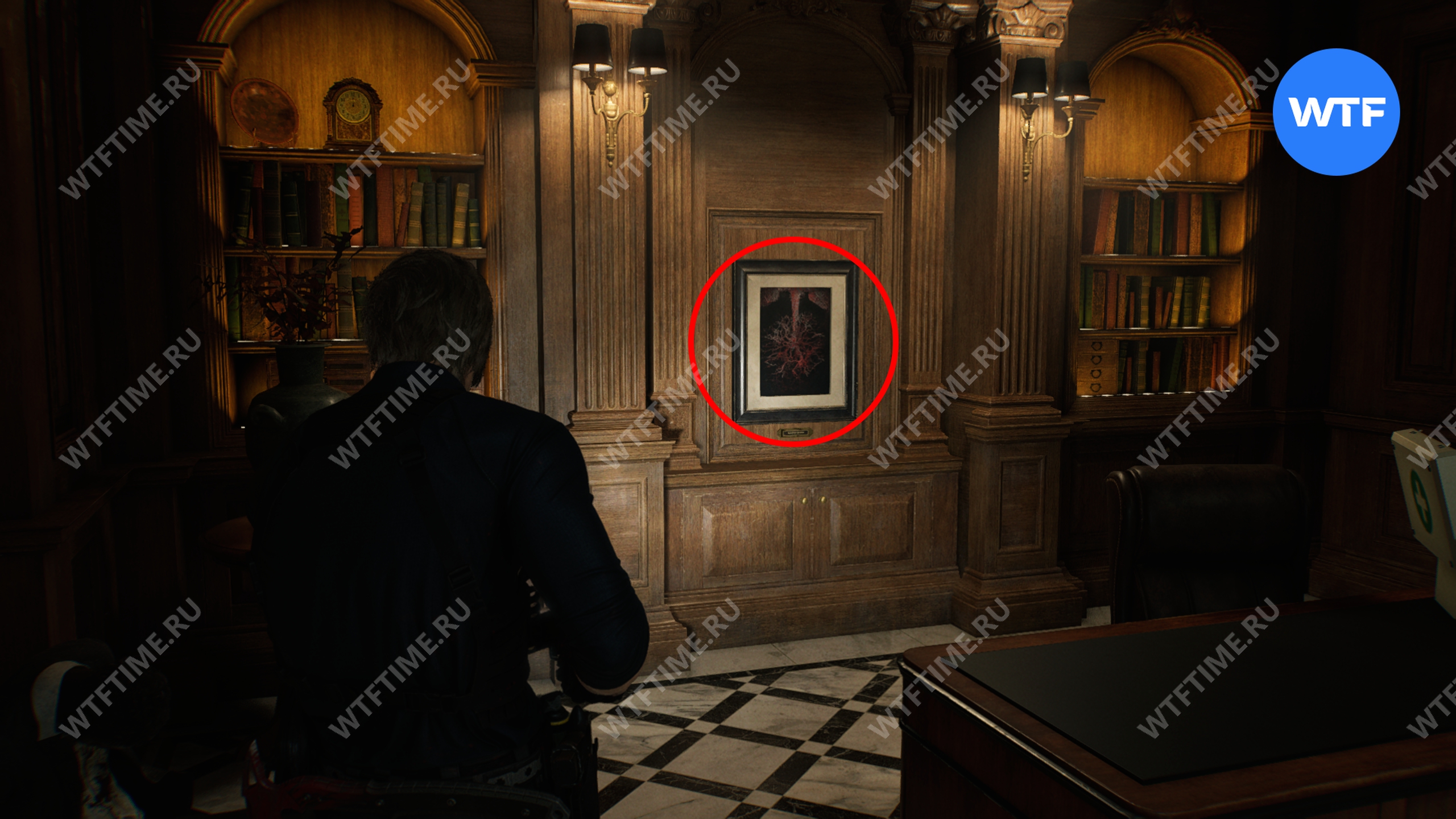 Ваша цель — это картина на стене в кабинете директора. Осмотрите её, а затем отбивайтесь от врагов, пока дверь не откроется. Это завершить прохождение за Леона и перенесет вас в подвал медицинского центра.