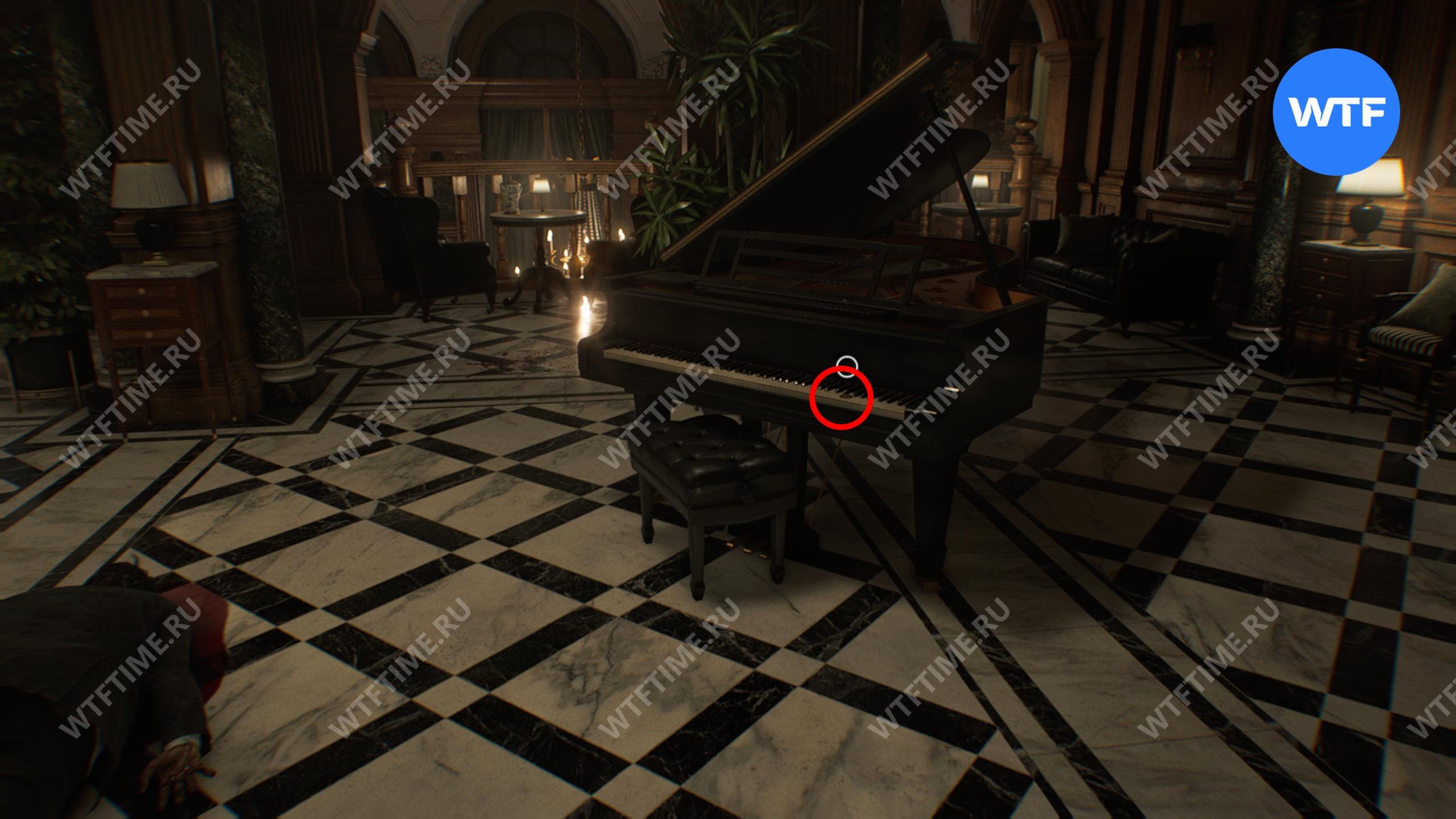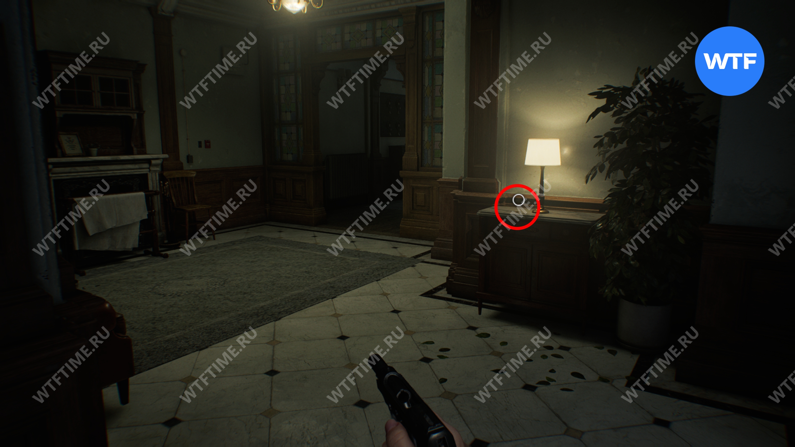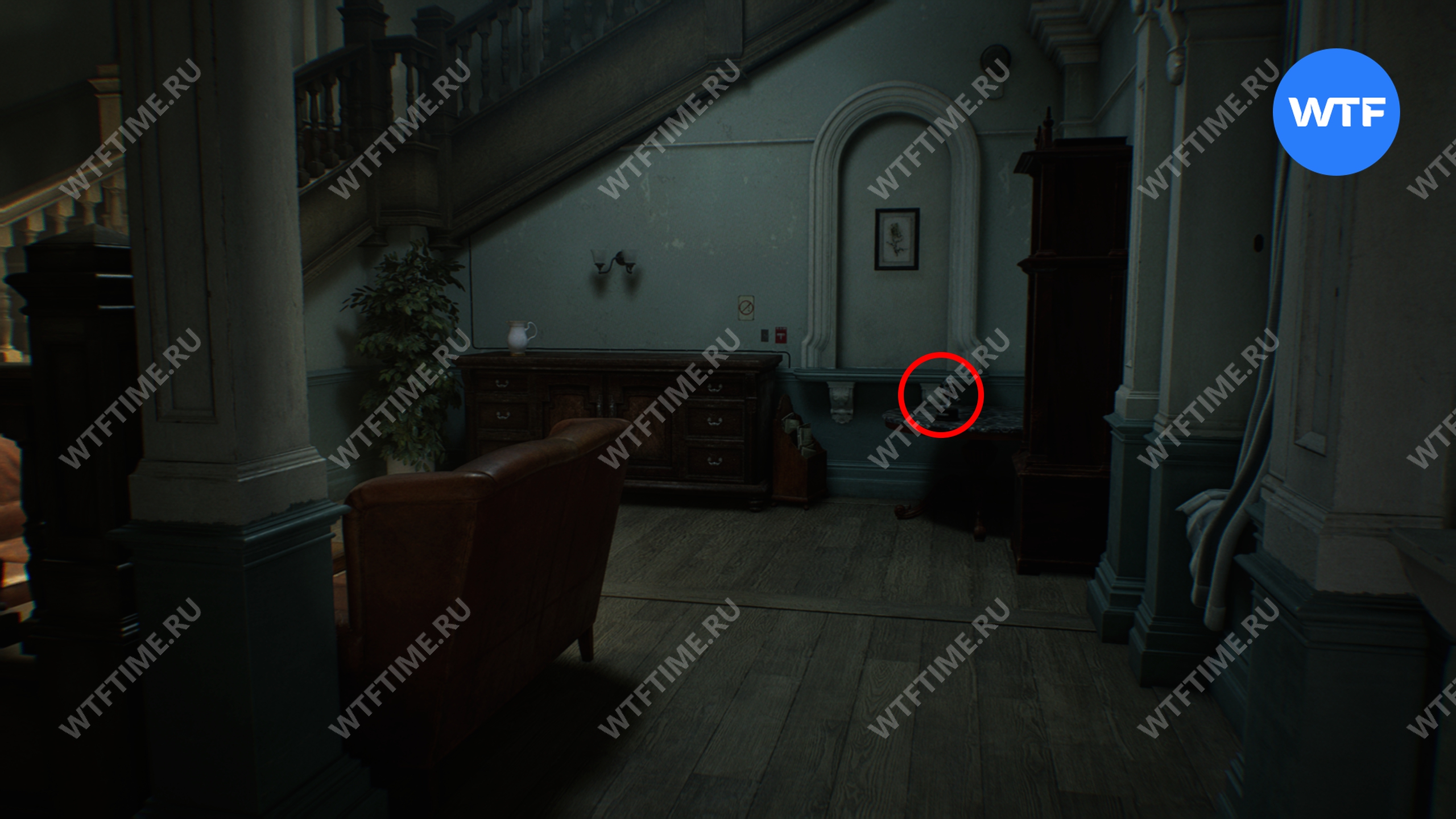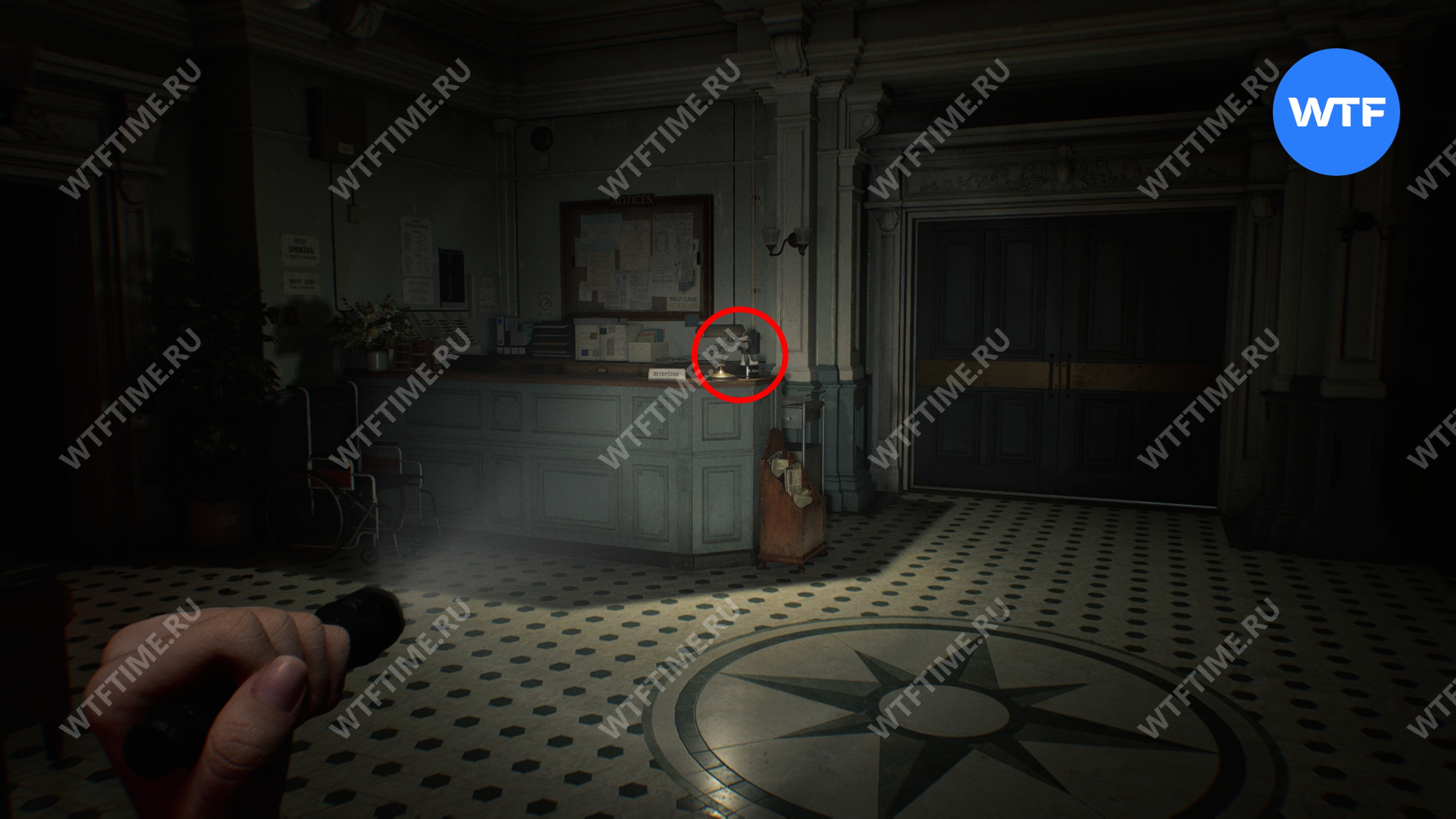 Вернитесь в центральный холл и используйте ключ-карту, чтобы попасть в восточное крыло. Затем идите в вестибюль и разбейте фигурку мистера Енота на стойке ресепшн.