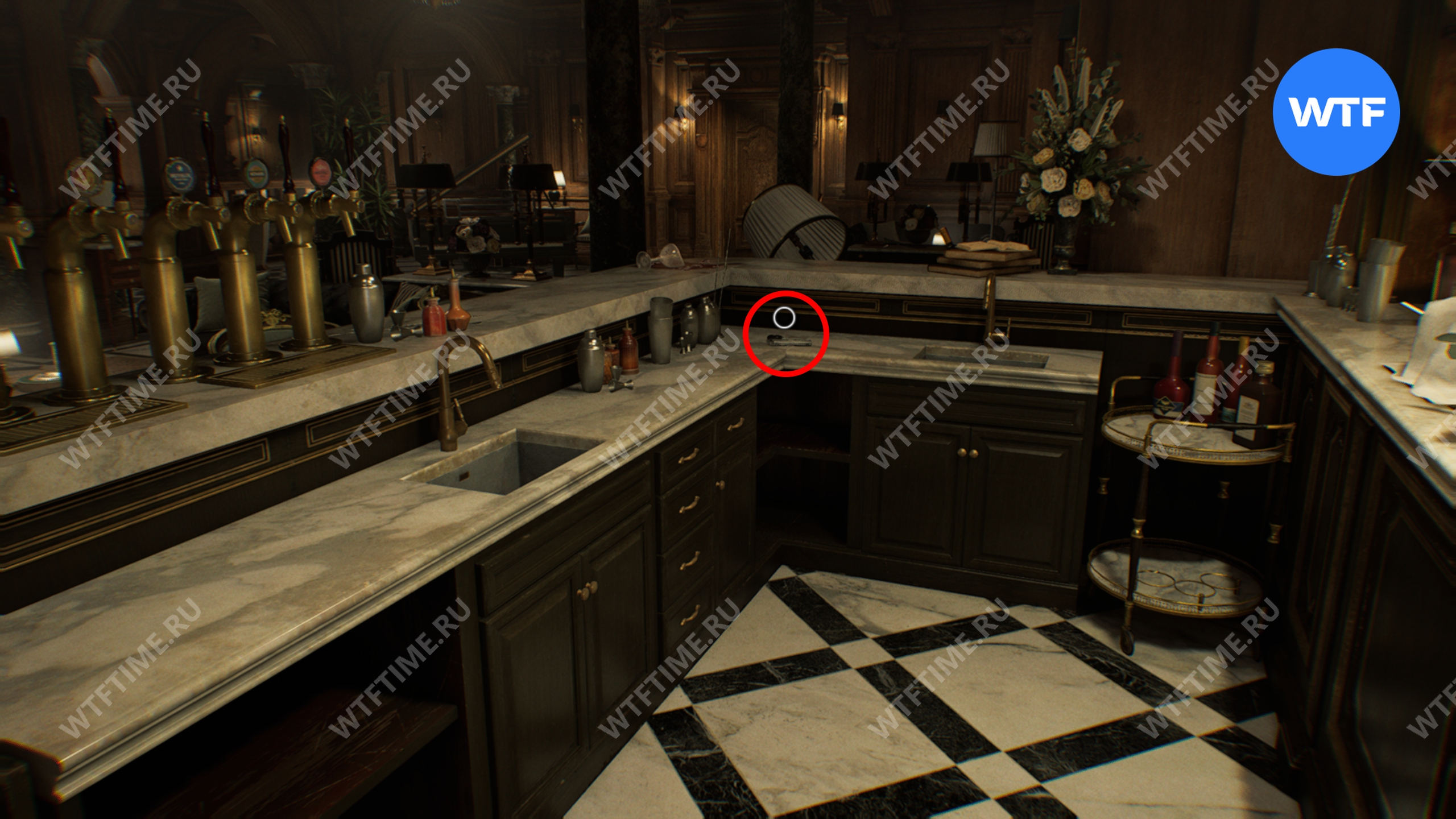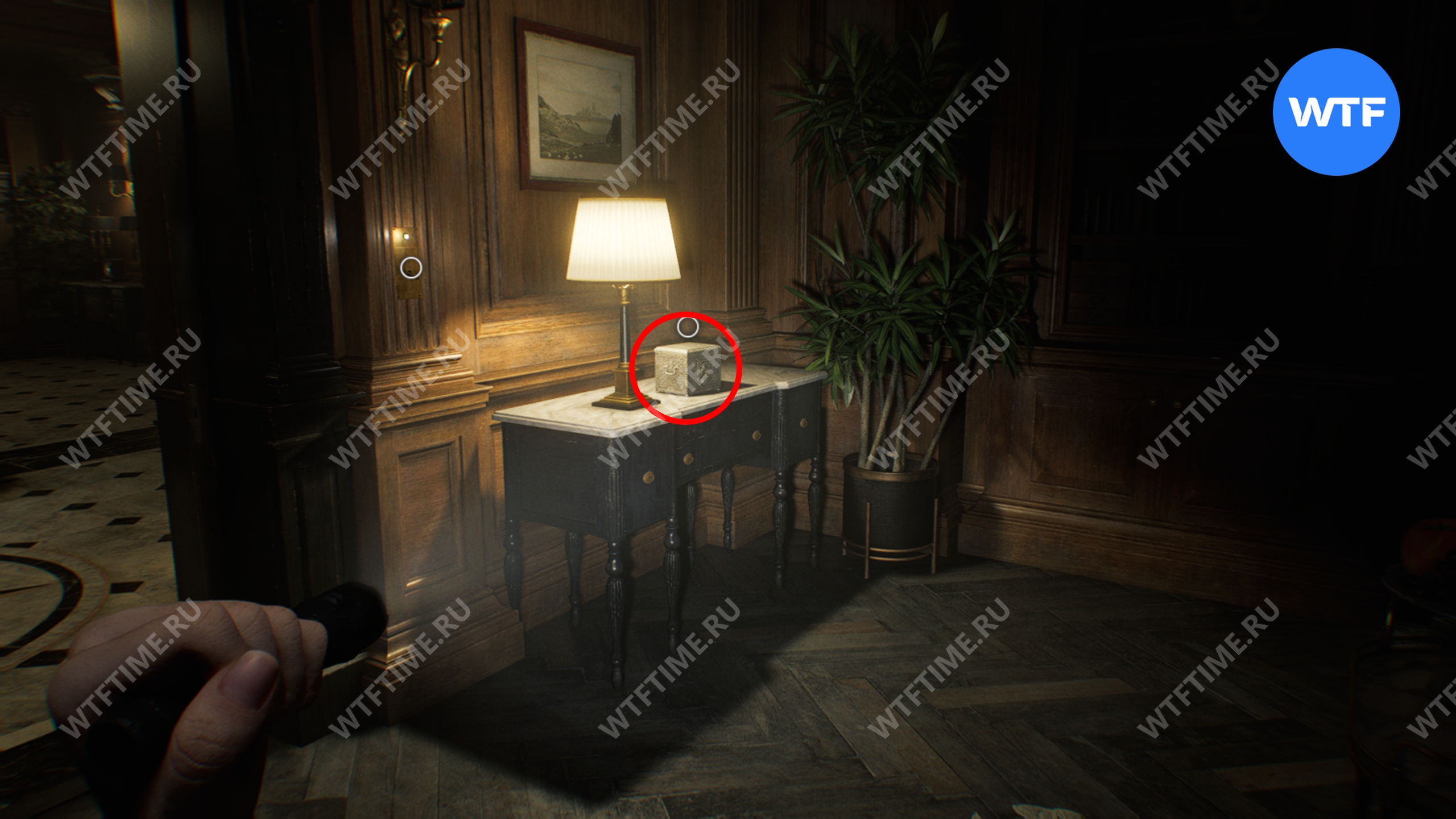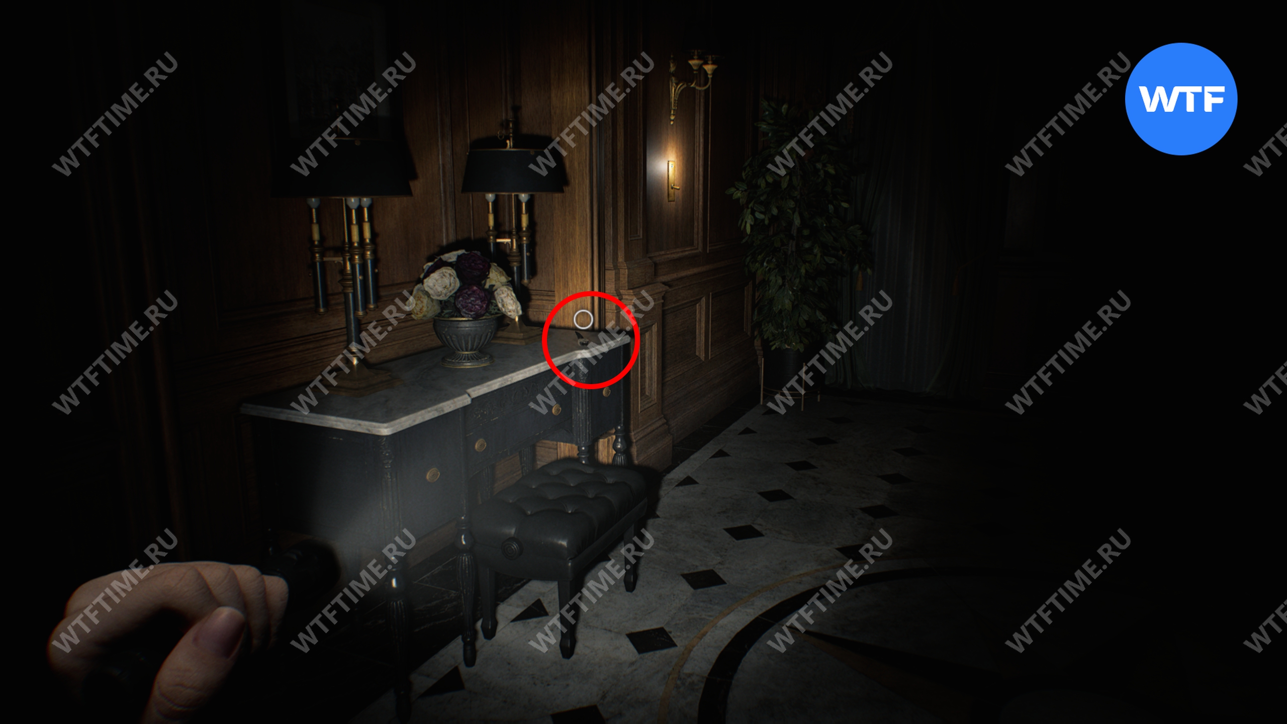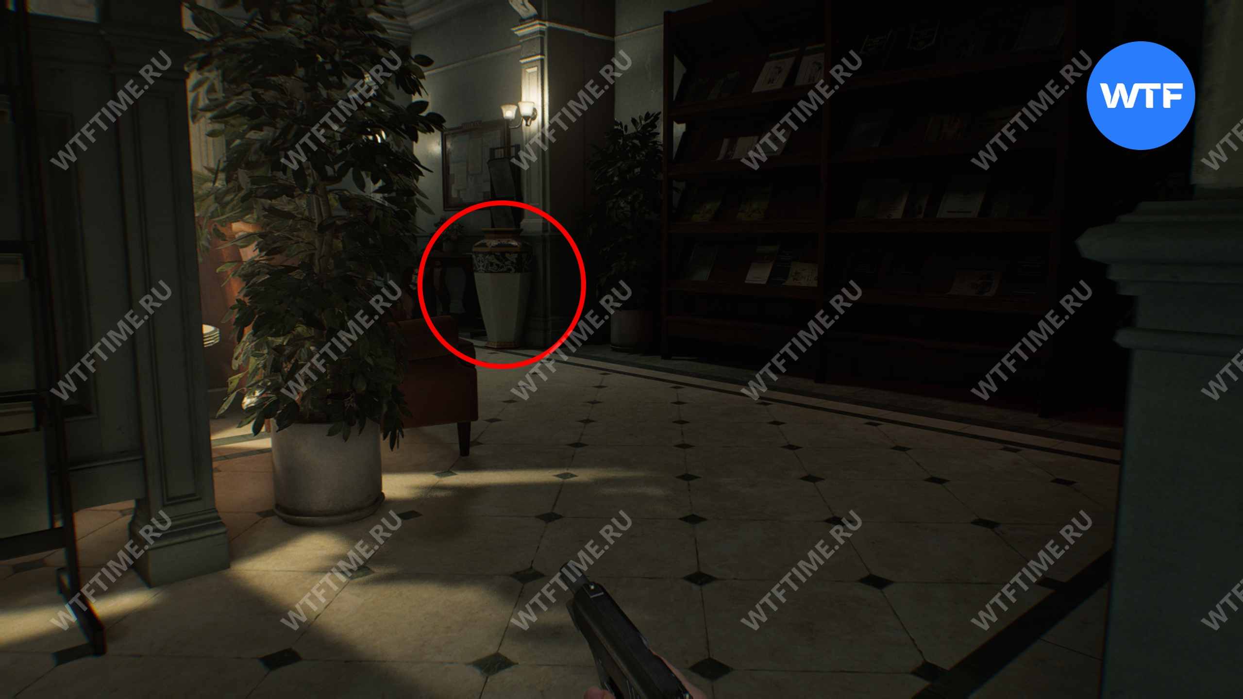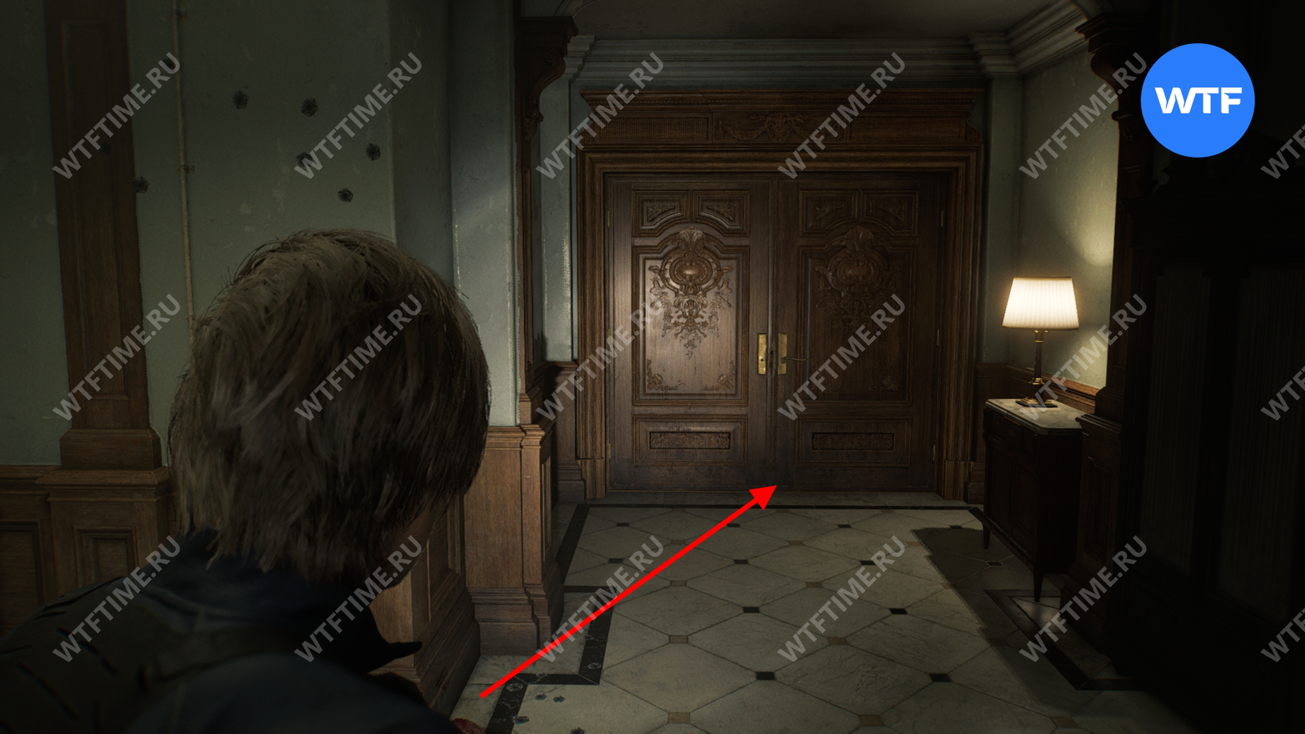 Вернитесь в центральный холл и используйте ключ-карту, чтобы попасть в восточное крыло. Затем идите в вестибюль и разбейте фигурку мистера Енота на стойке ресепшн.