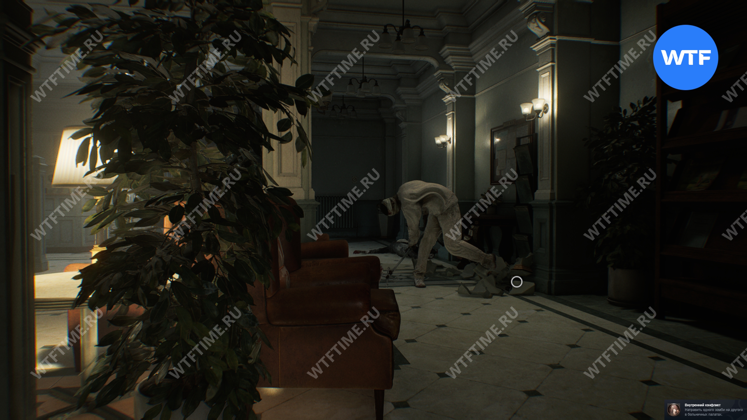 Из лаборатории гематологии идите по коридору на юг в комнату ожидания. Здесь можно получить достижение «Внутренний конфликт», если у вас с собой есть пустая бутылка.