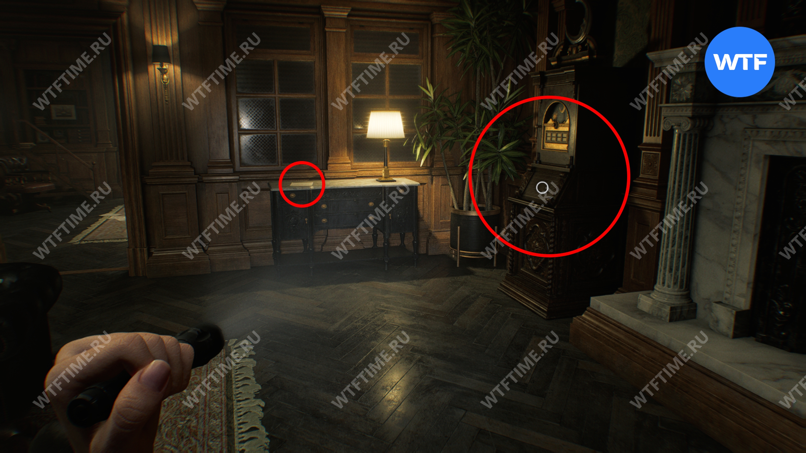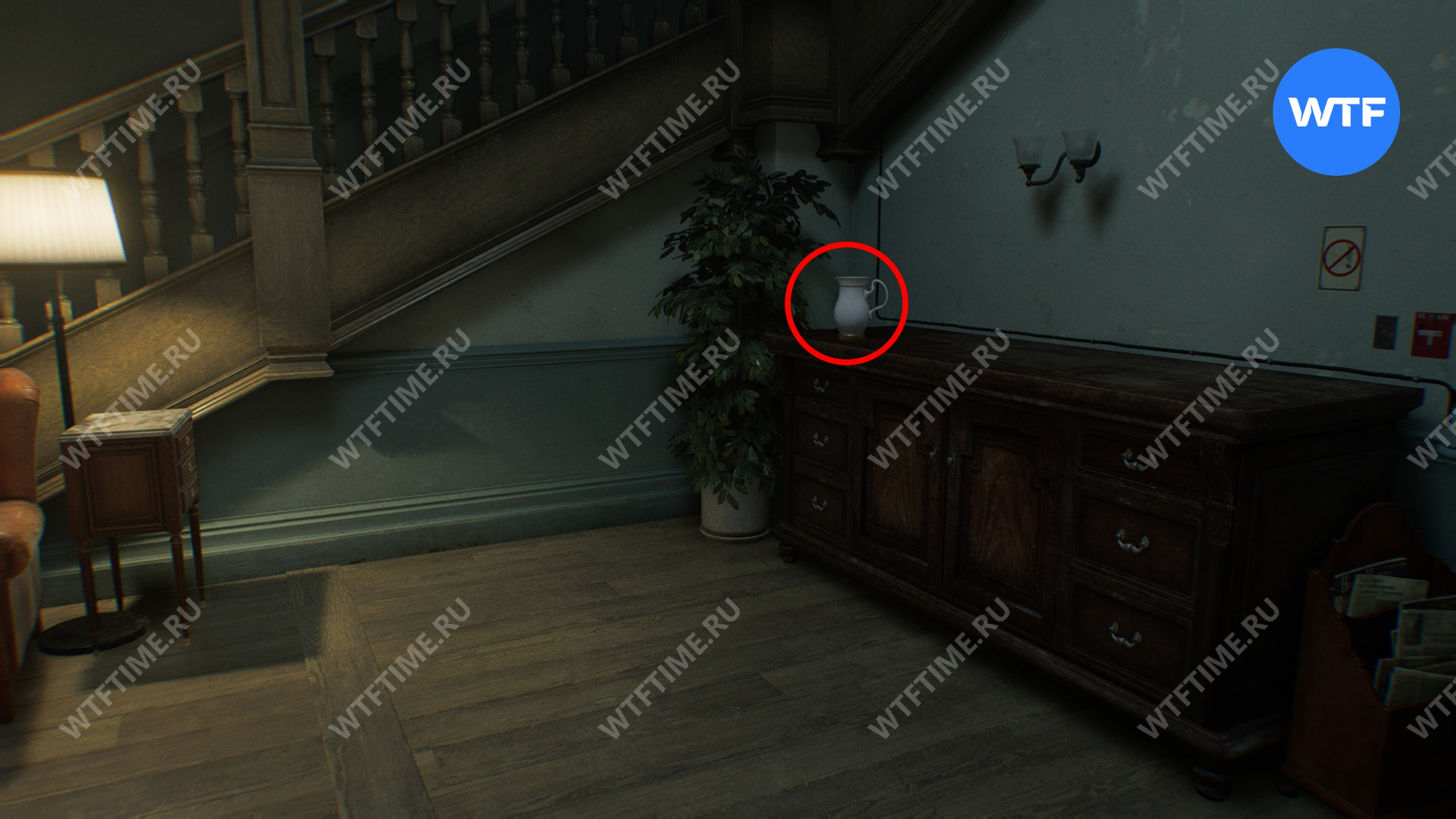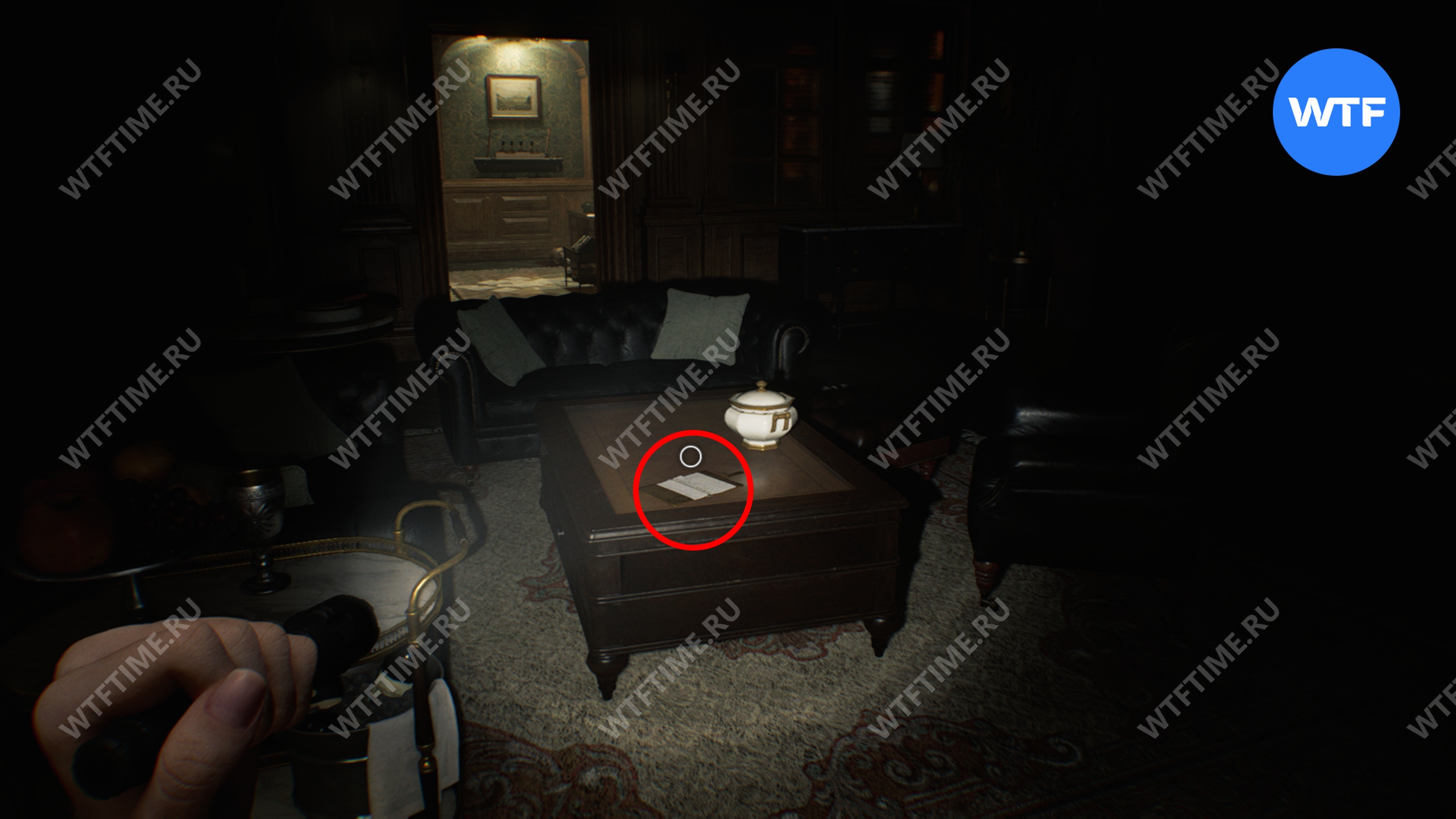 Здесь также можно получить 2 древние монеты: одна лежит на столике рядом с креслами, а другая спрятана внутри белого кувшина, стоящего на шкафу прямо напротив.