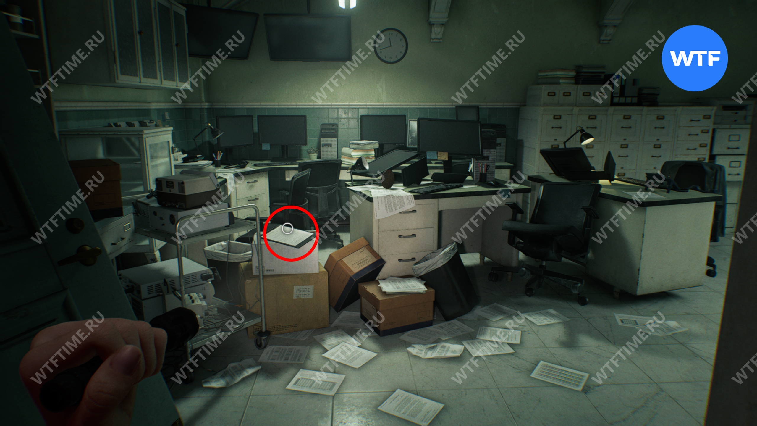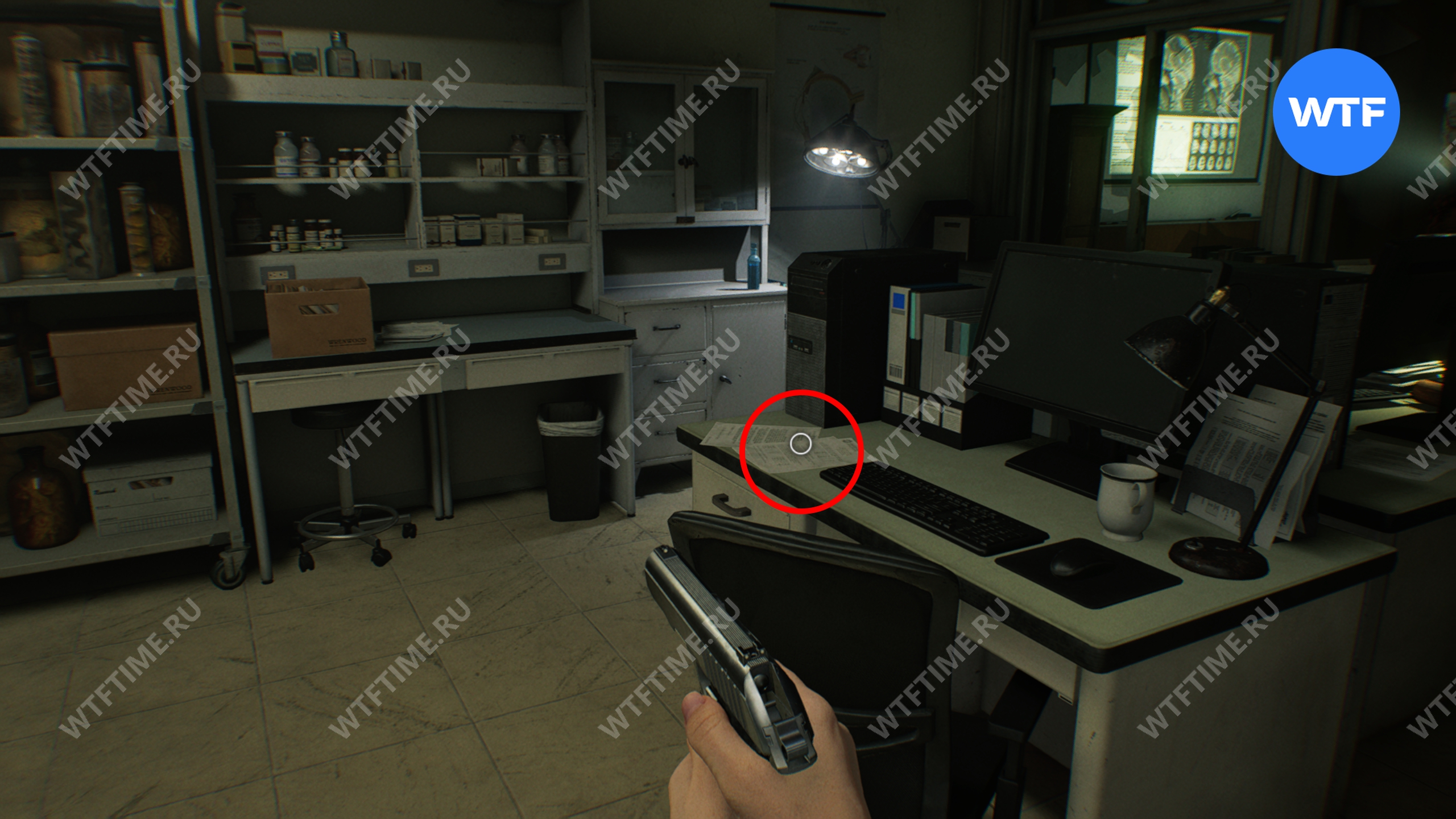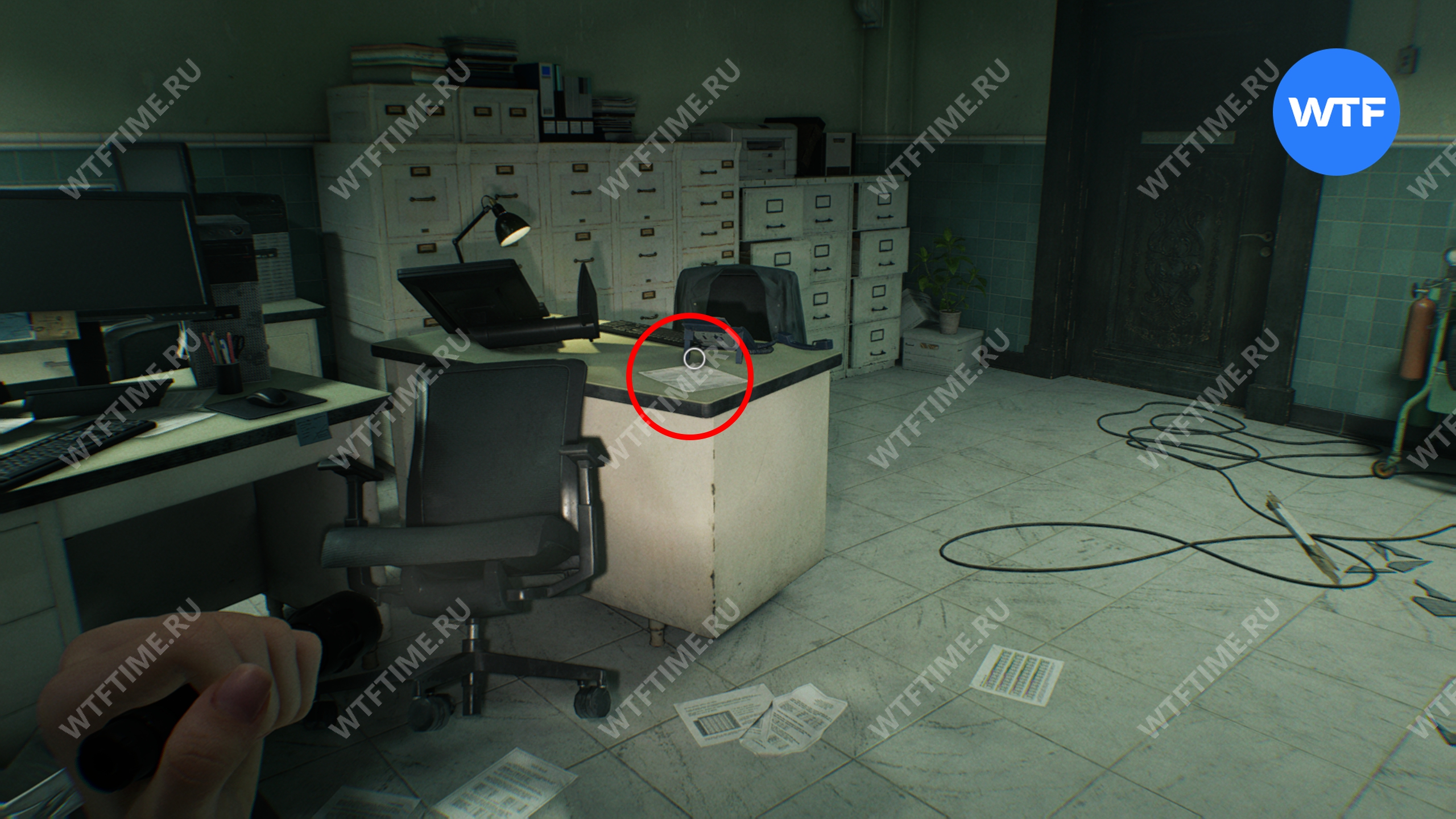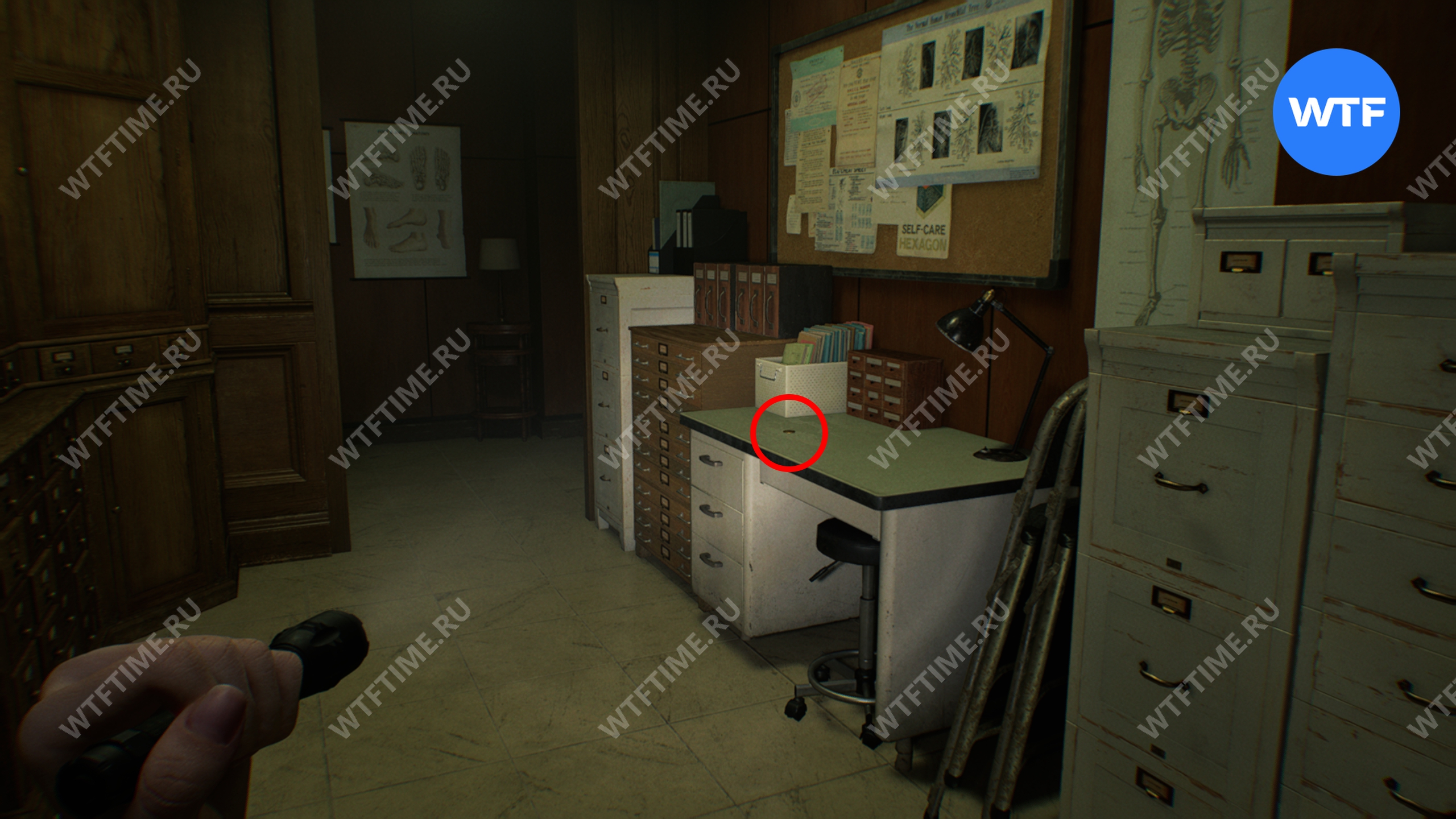Теперь войдите в кабинет главного исследователя. Здесь вам нужно собрать 3 фотографии, которые считаются документами: две лежат на столе и еще одна на шкафу напротив.