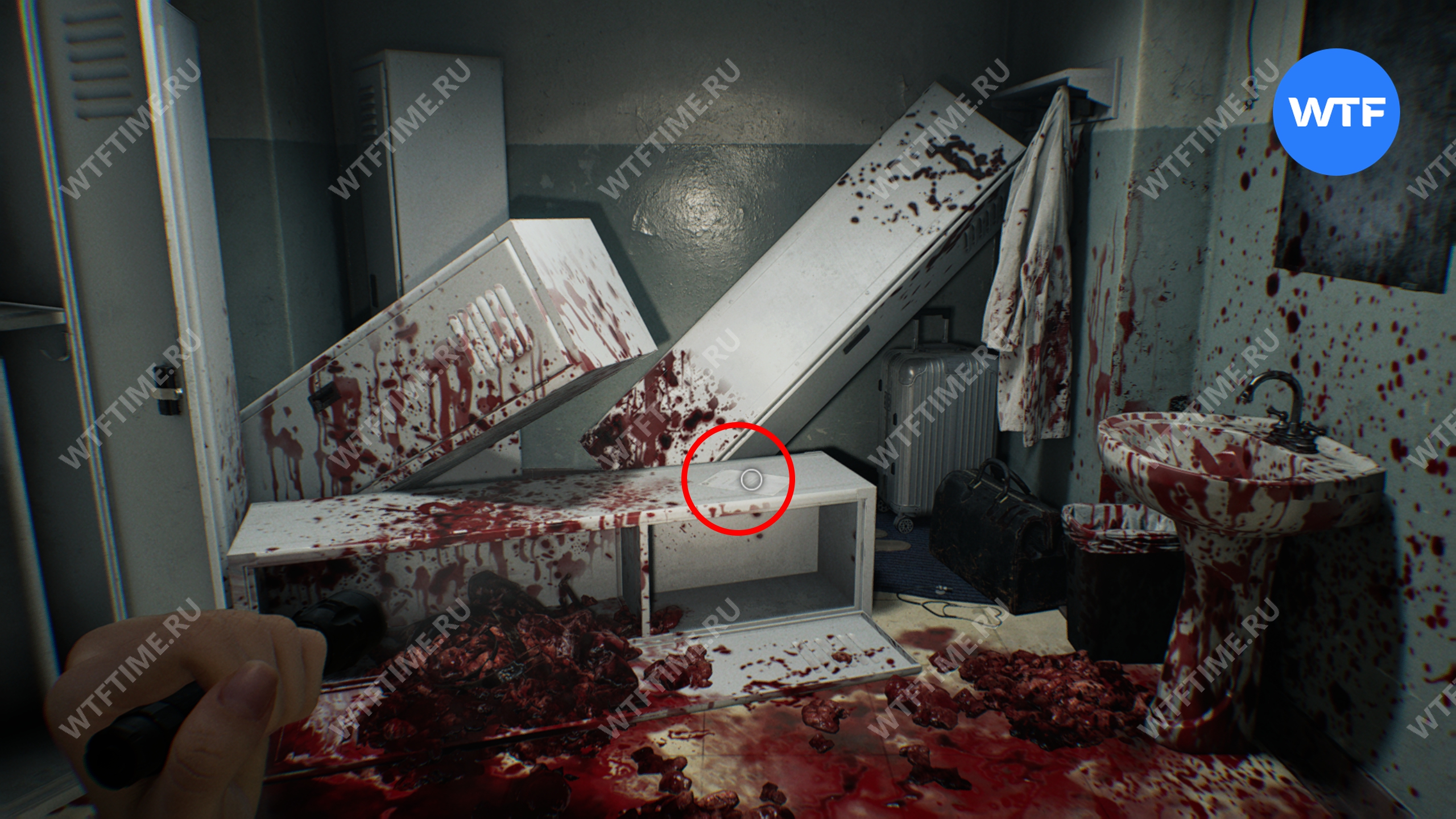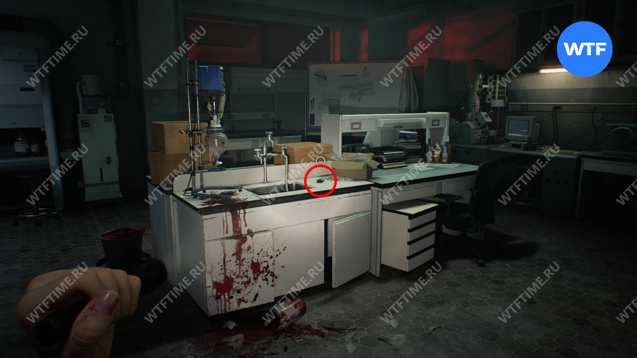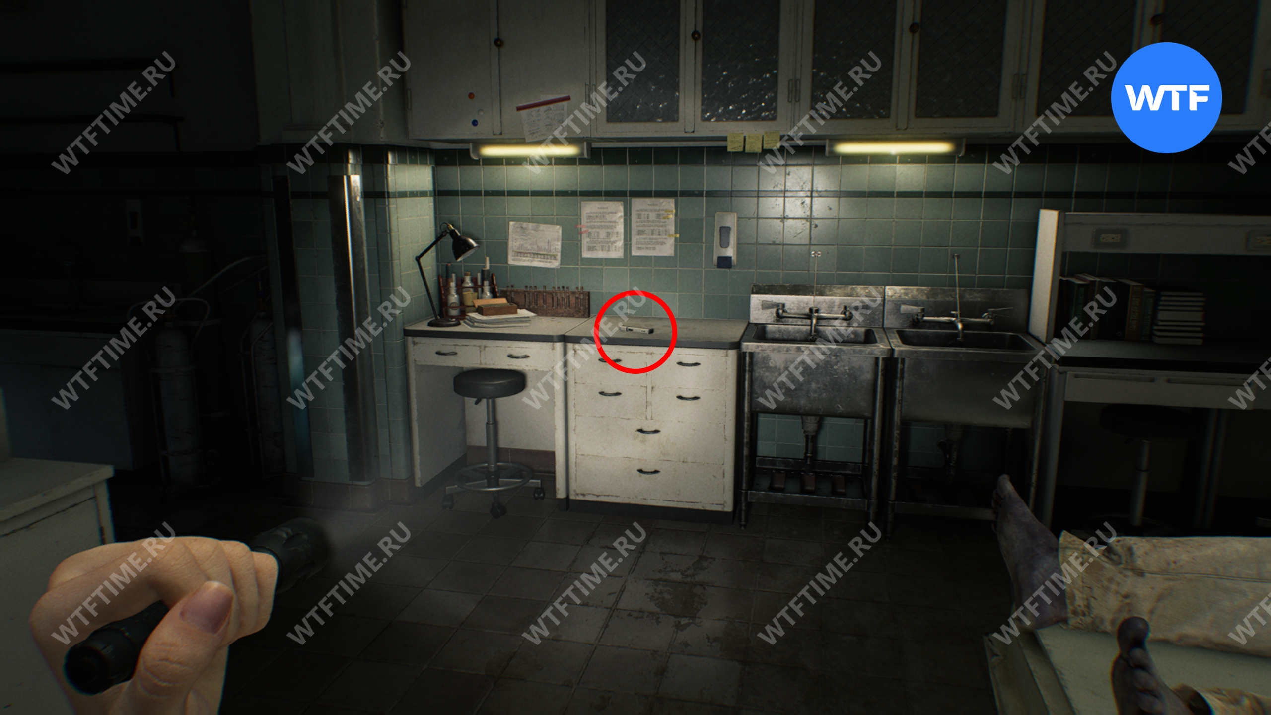 Также вам необходимо подобрать записку от главного исследователя, лежащую на столе в углу. В ней рассказывается, как снять прочный замок со шкафа.