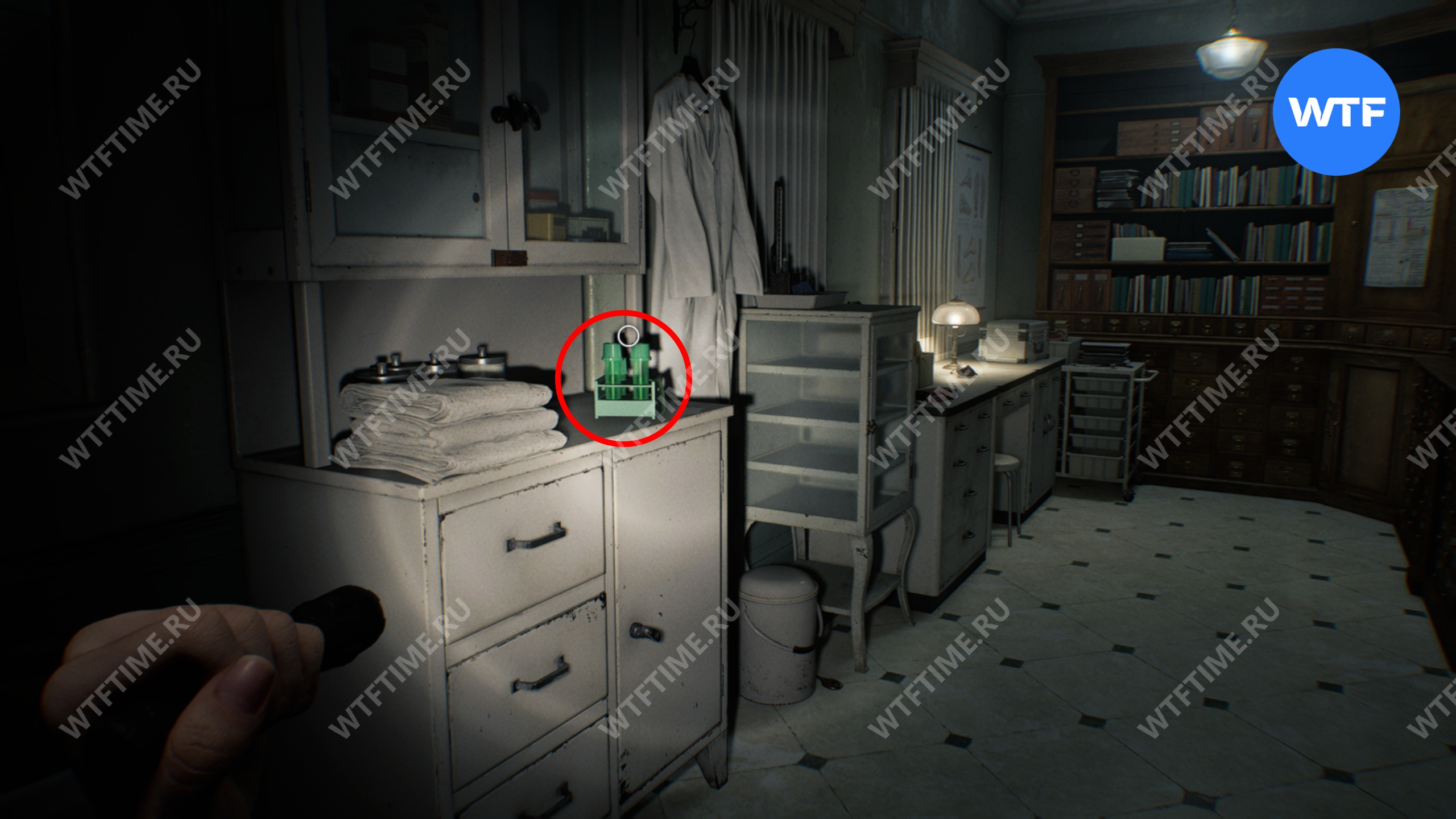 В этой комнате вы также можете подобрать едкое вещество, необходимое для открытия прочного замка на шкафе-головоломке в кабинете главного исследователя.