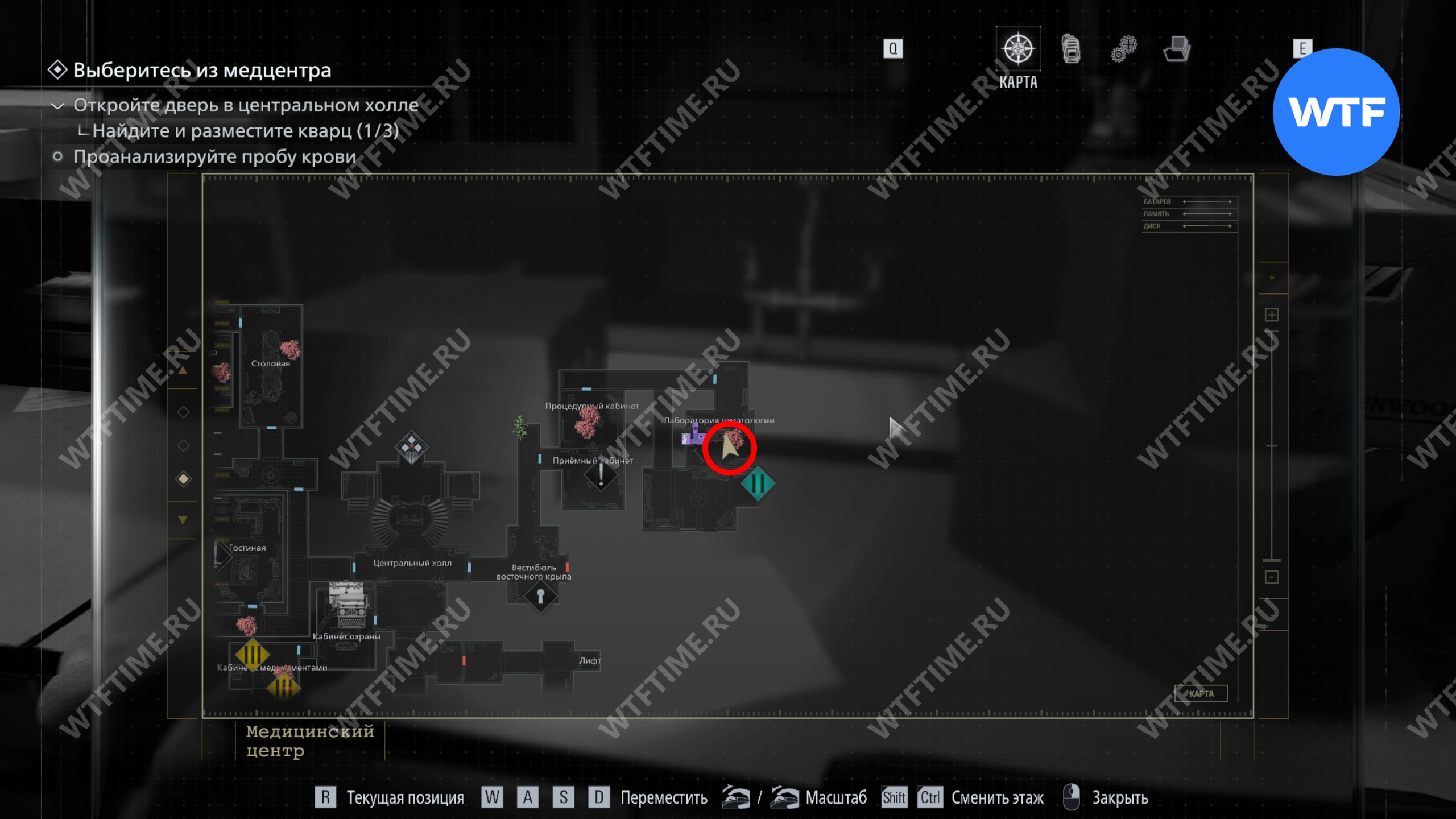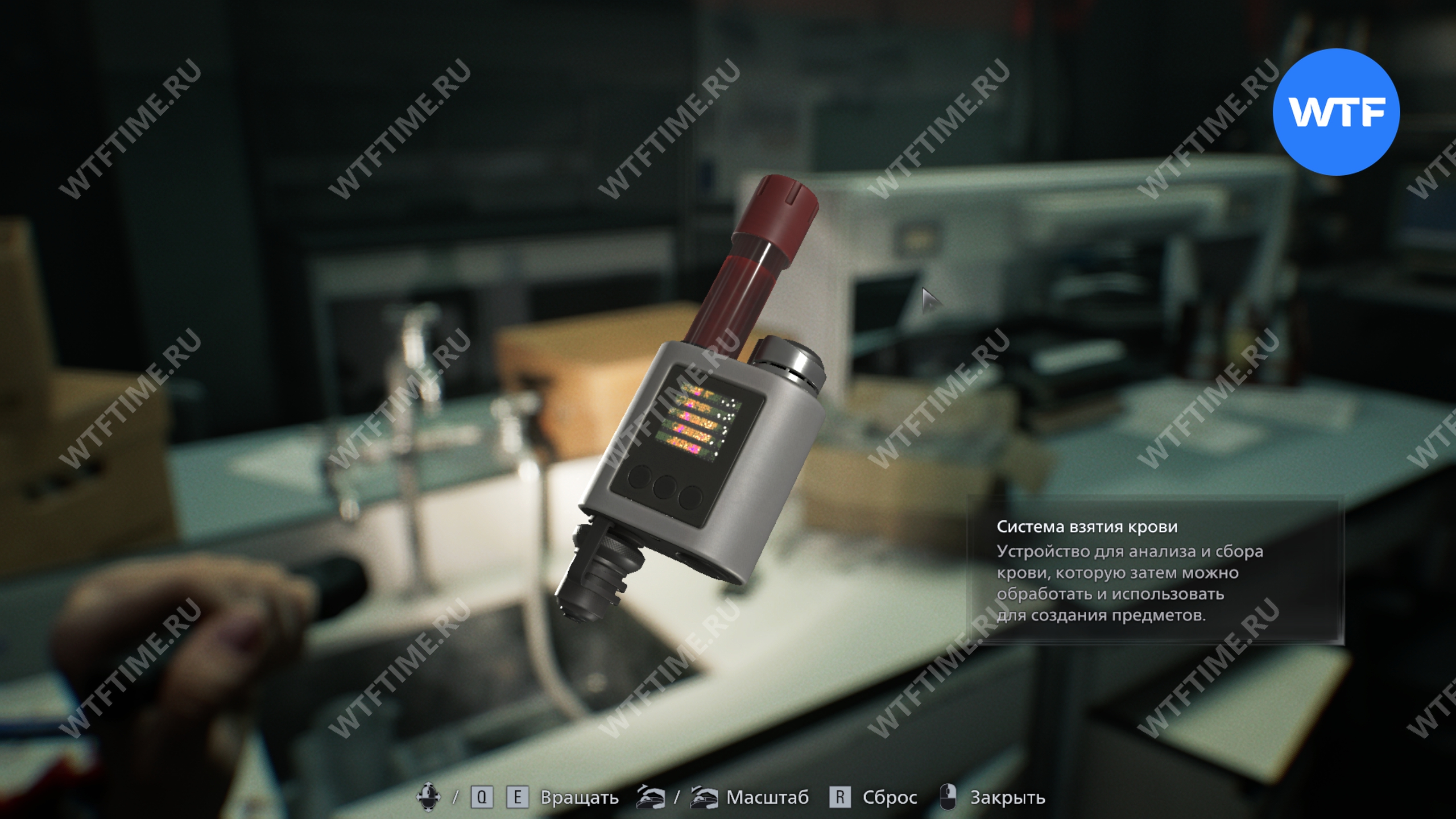 Возле лазерного микроскопа стоит проба крови (денатурация), которую вам нужно проанализировать. Для этого воспользуйтесь микроскопом, а затем нажмите на второй куб слева.