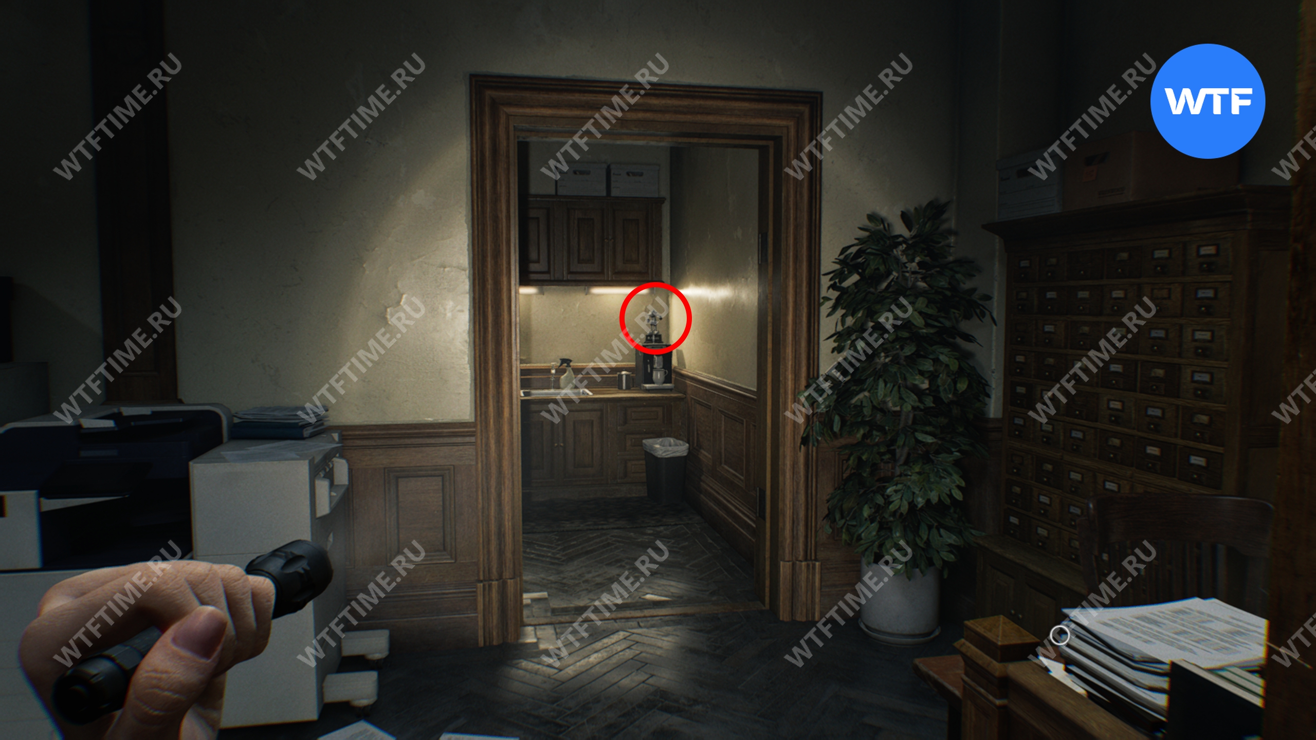 Теперь идите на мини-кухню. Справа от раковины на кофеварке стоит фигурка мистера Енота. Откройте короткий путь и спускайте вниз по лестнице.