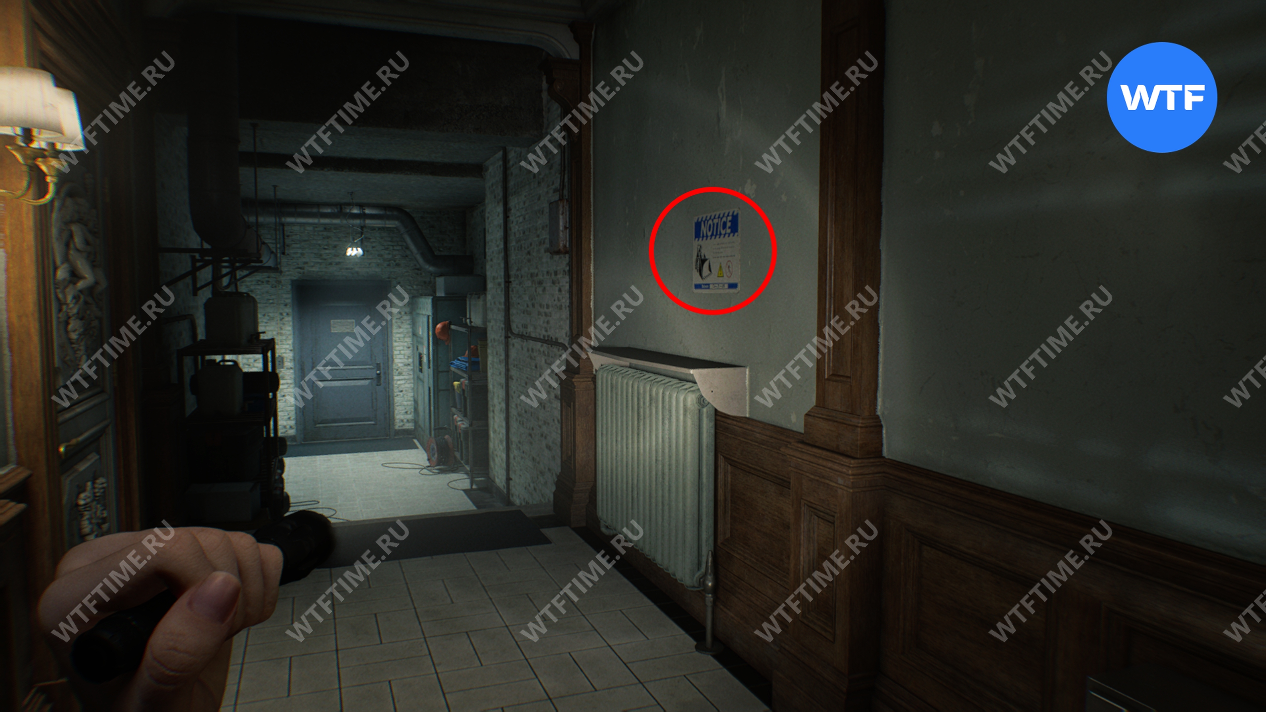 Идите в юго-западную часть первого этажа и отоприте последнюю дверь с первым уровнем доступа недалеко от кухни. В коридоре за ней на стене будет висеть уведомление о строительных работах.