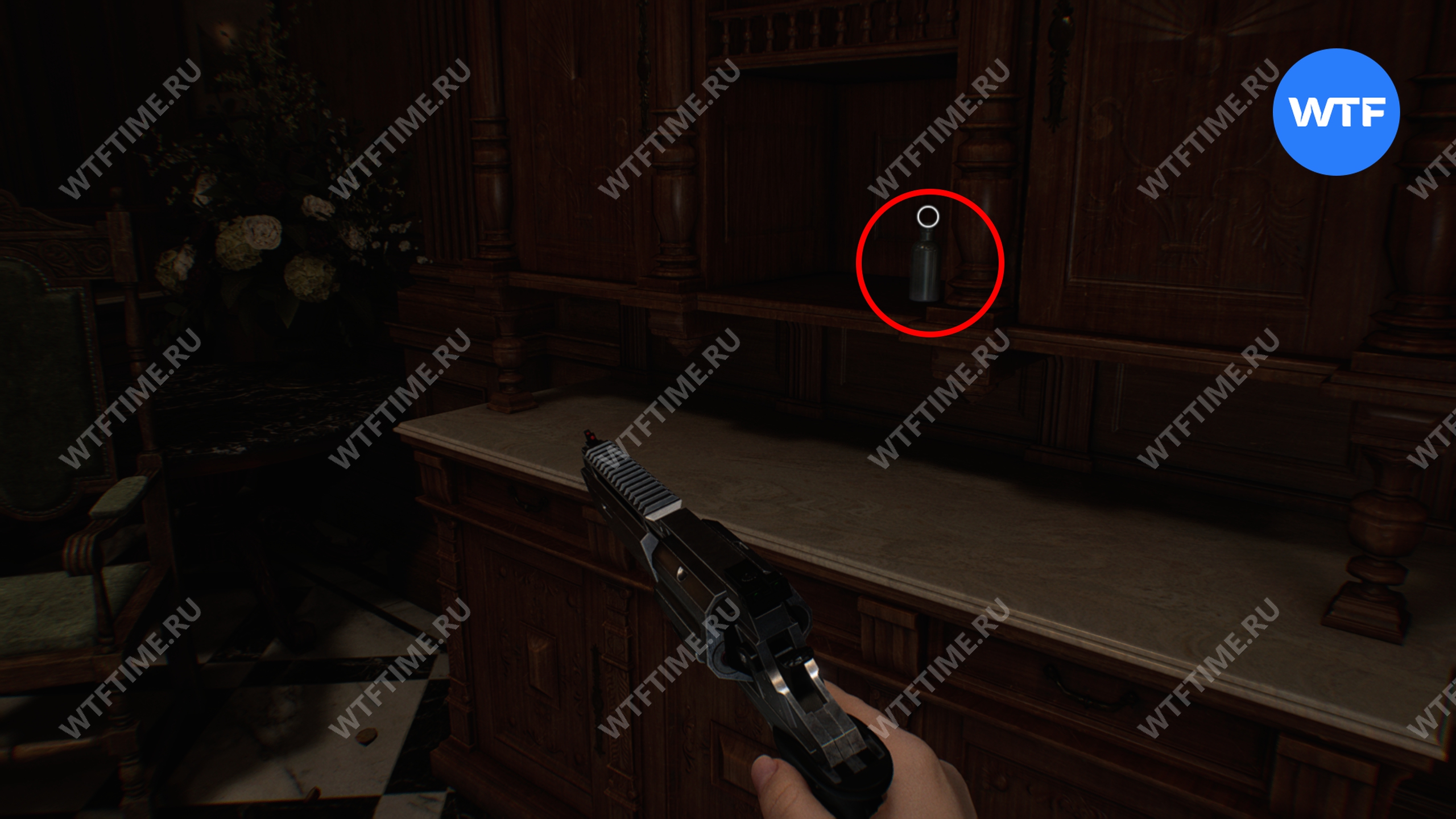 Прокрадитесь и разбейте вазу справа от входа, а затем быстро отступите обратно за угол, в укрытие. Звук привлечет двух зараженных: с повязкой на голове и горничную. Когда горничная подойдет, киньте в неё бутылку и второй зараженный её убьет, открывая трофей.