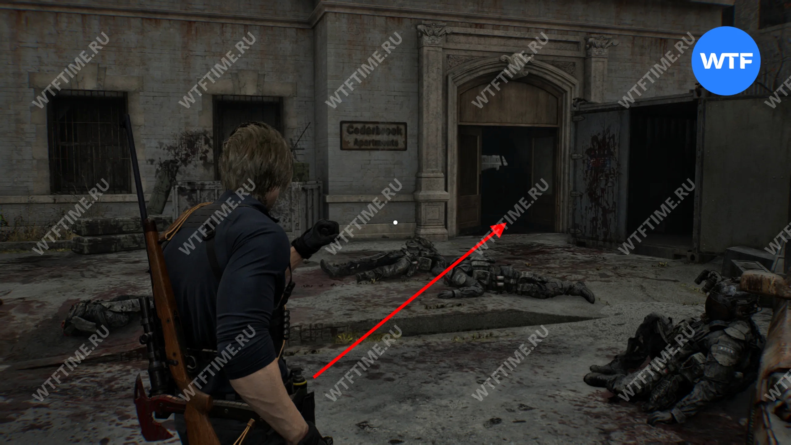 Затем идите к главному входу в квартирный комплекс, возле которого лежат мертвые тела. После кат сцены войдите внутрь здания и поднимитесь по лестнице на второй этаж.