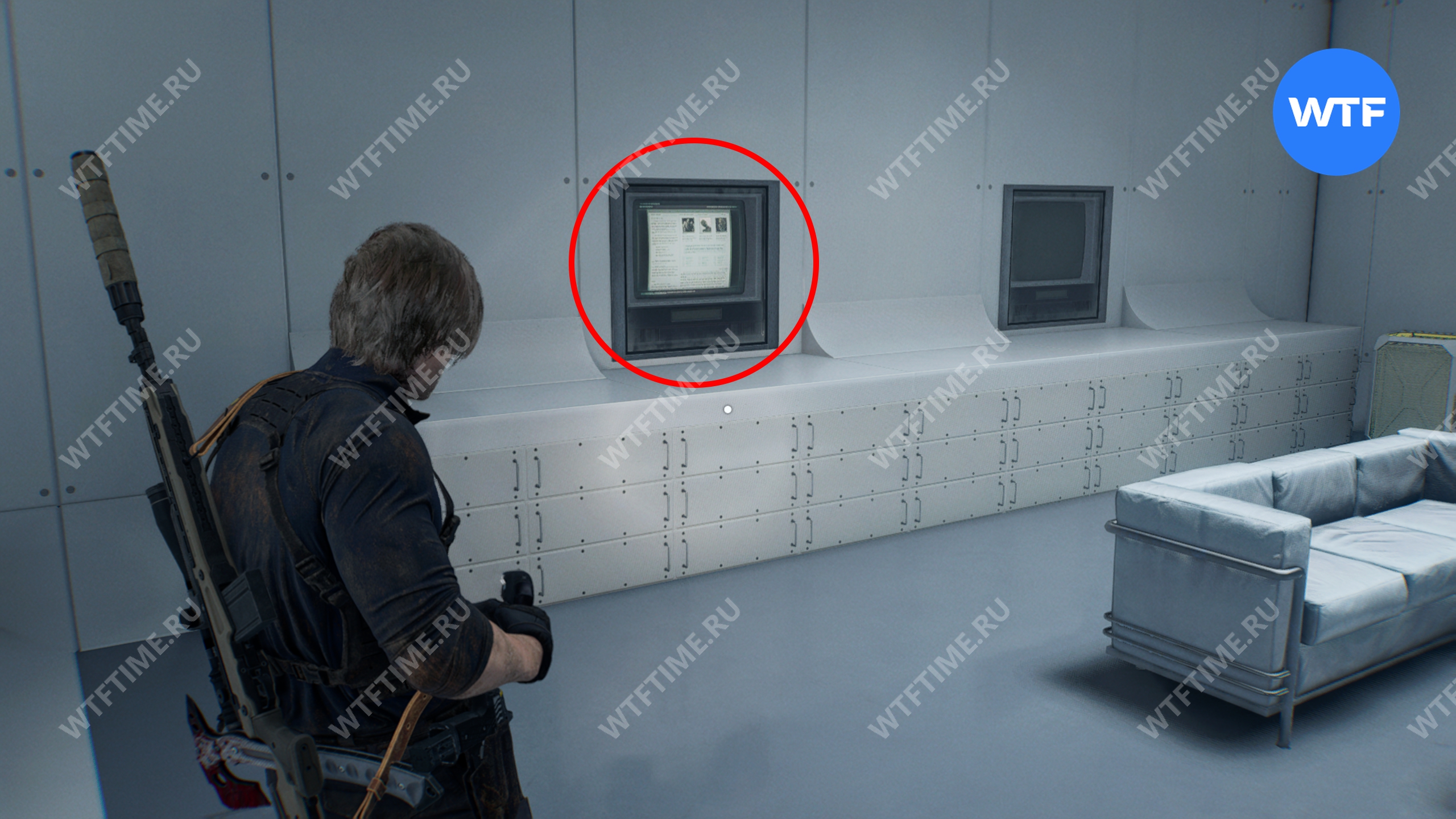 Затем подойдите к большому экрану. Это запустит как сцену, в конце которой вы переключитесь на Леона.