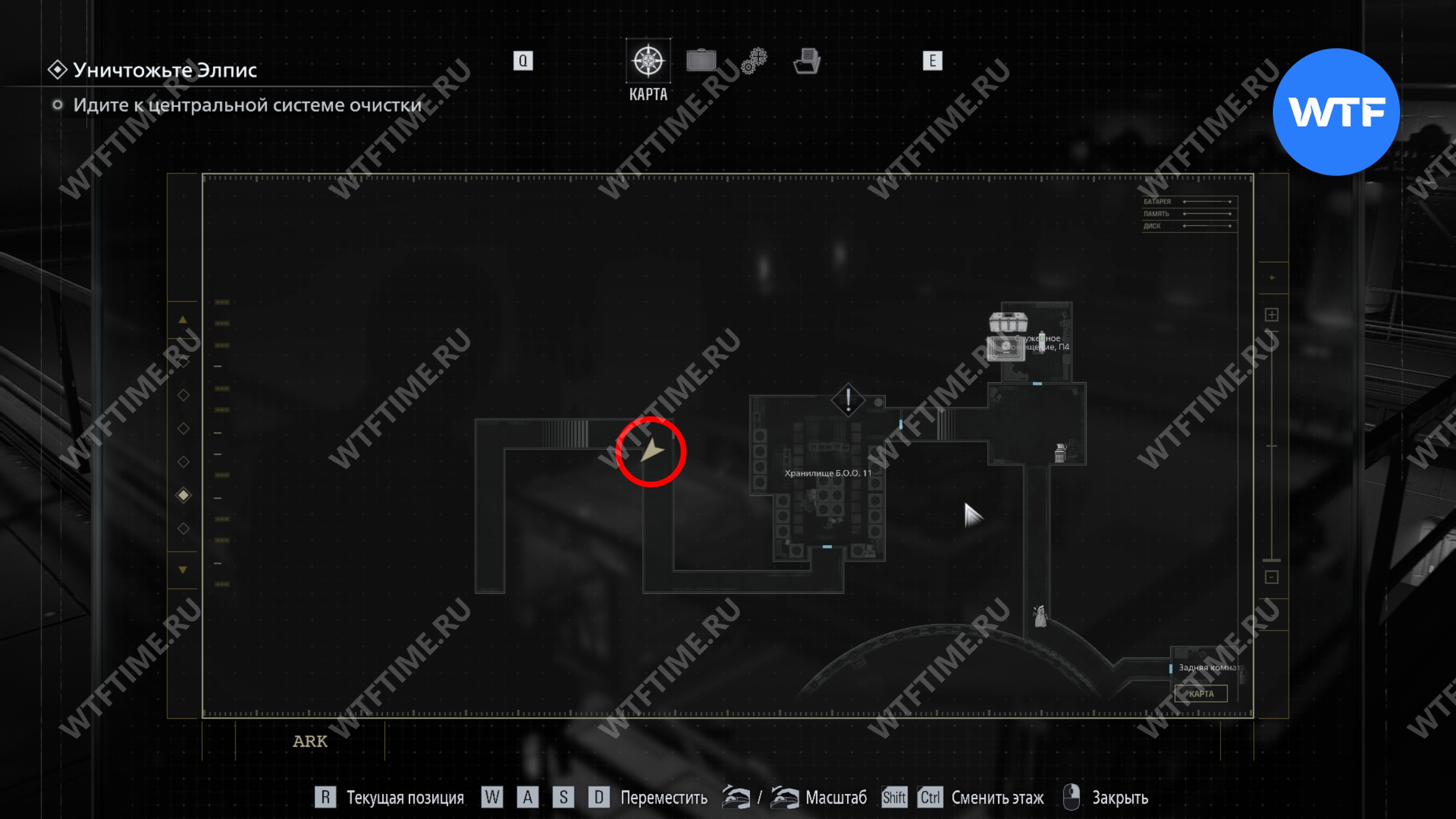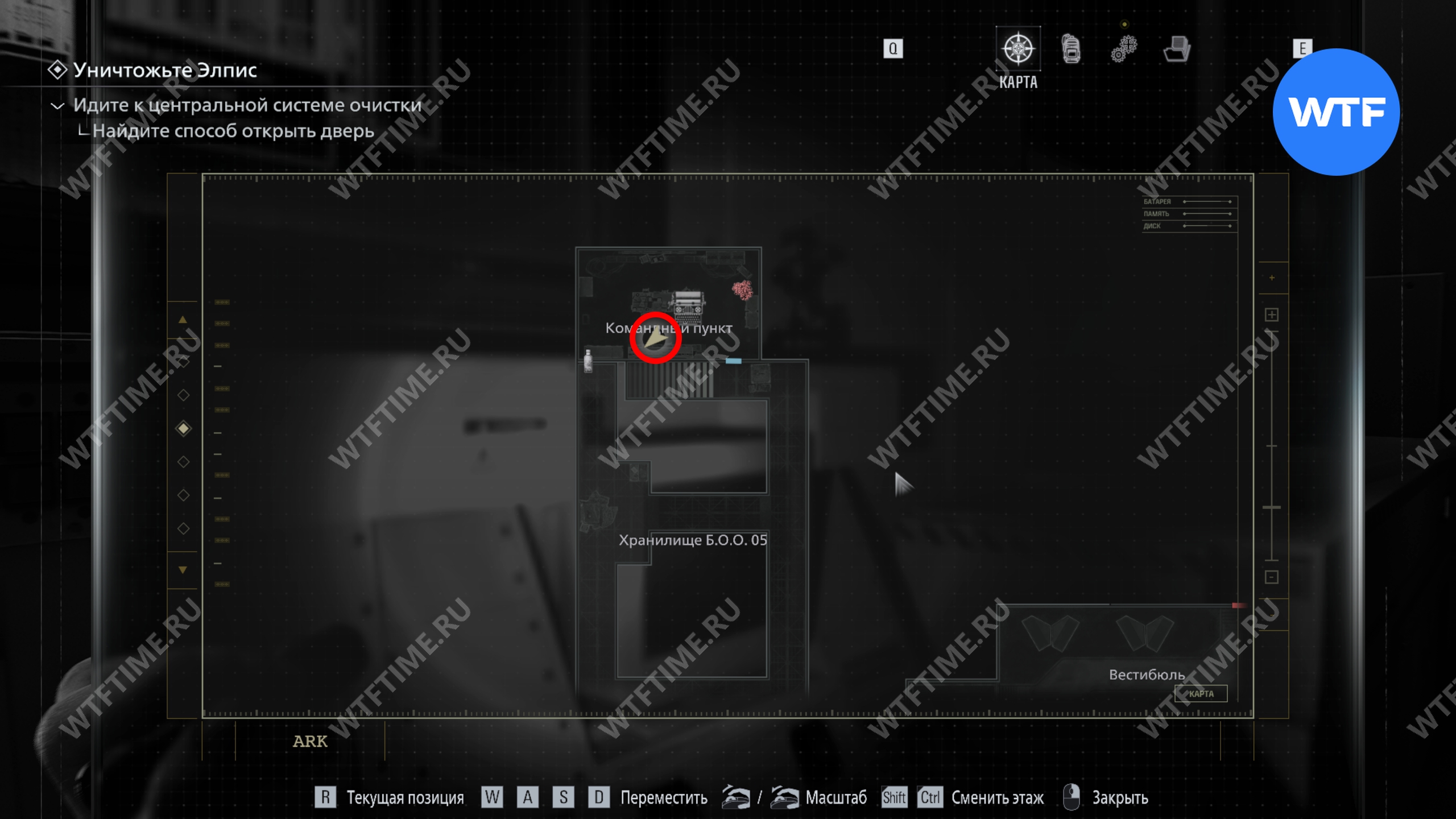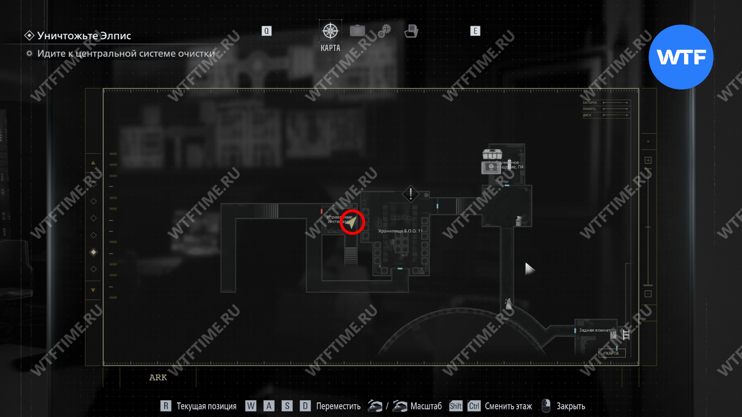 Поднимитесь по лестнице в юго-восточном углу хранилища, до которой теперь вы можете добраться. Это приведет вас в комнату управления системами, где со шкафчика с зеленой подсветкой справа можно забрать ключ отмены протоколов (хран. 11).