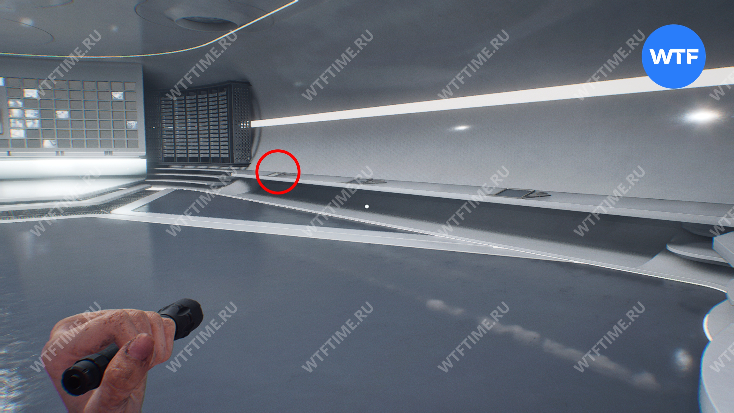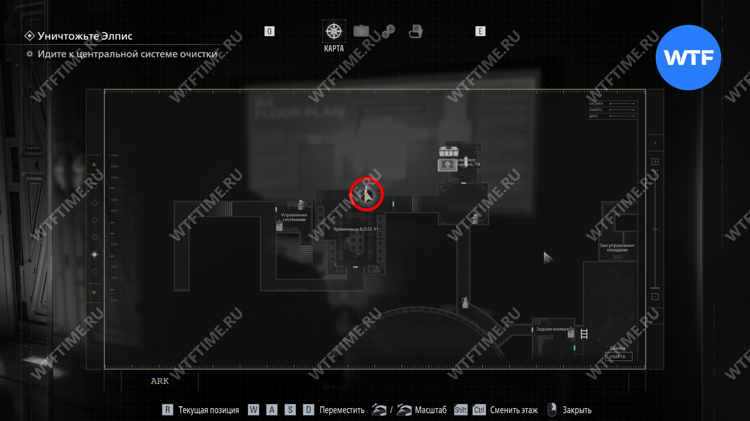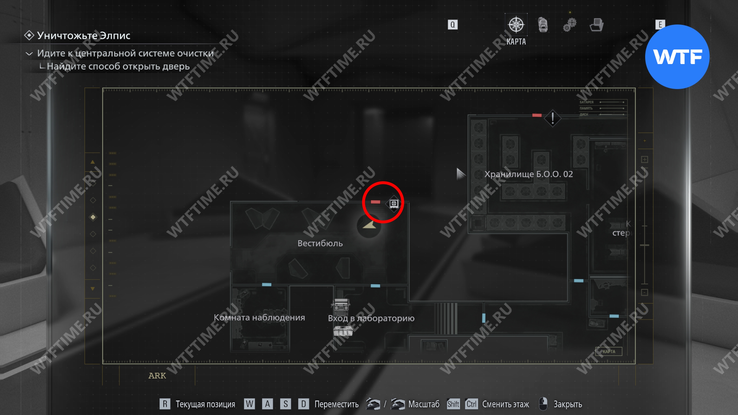 Поднимитесь по лестнице в юго-восточном углу хранилища, до которой теперь вы можете добраться. Это приведет вас в комнату управления системами, где со шкафчика с зеленой подсветкой справа можно забрать ключ отмены протоколов (хран. 11).