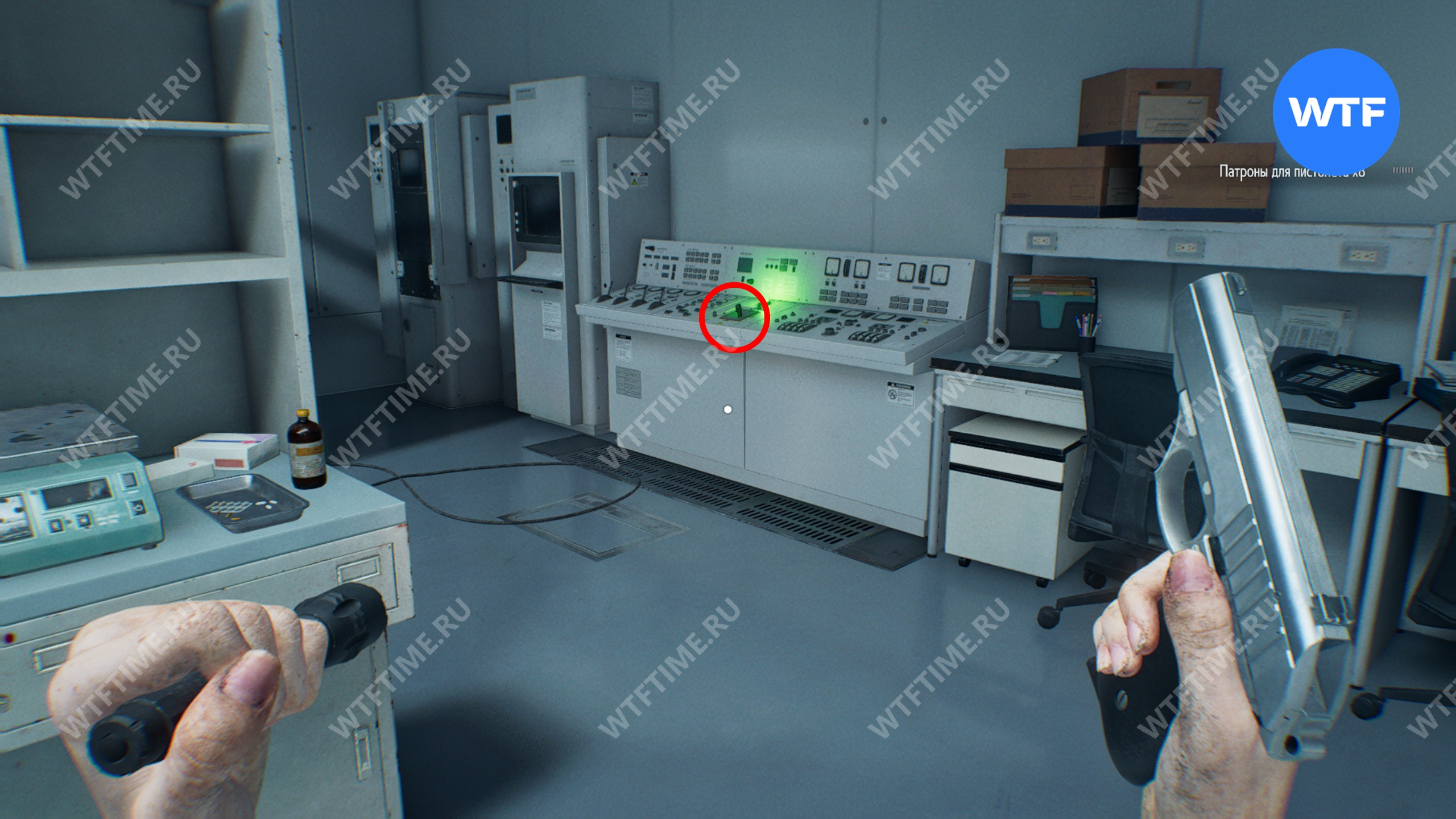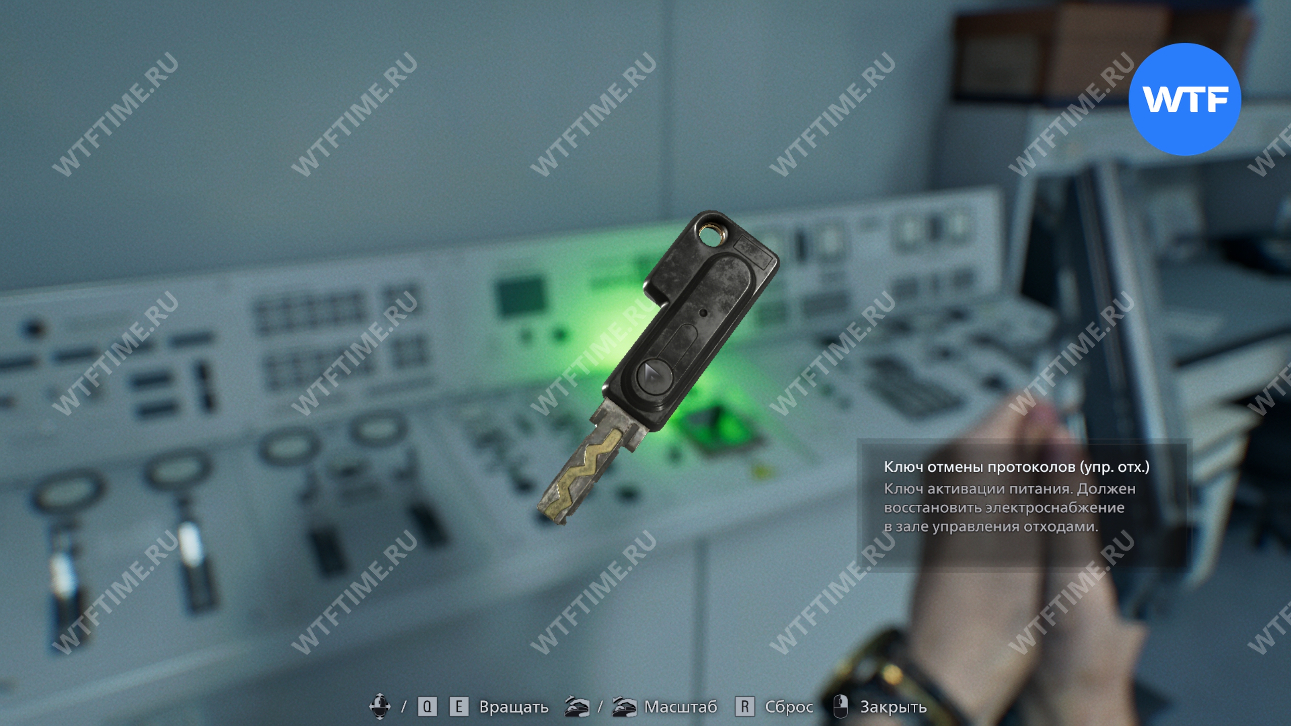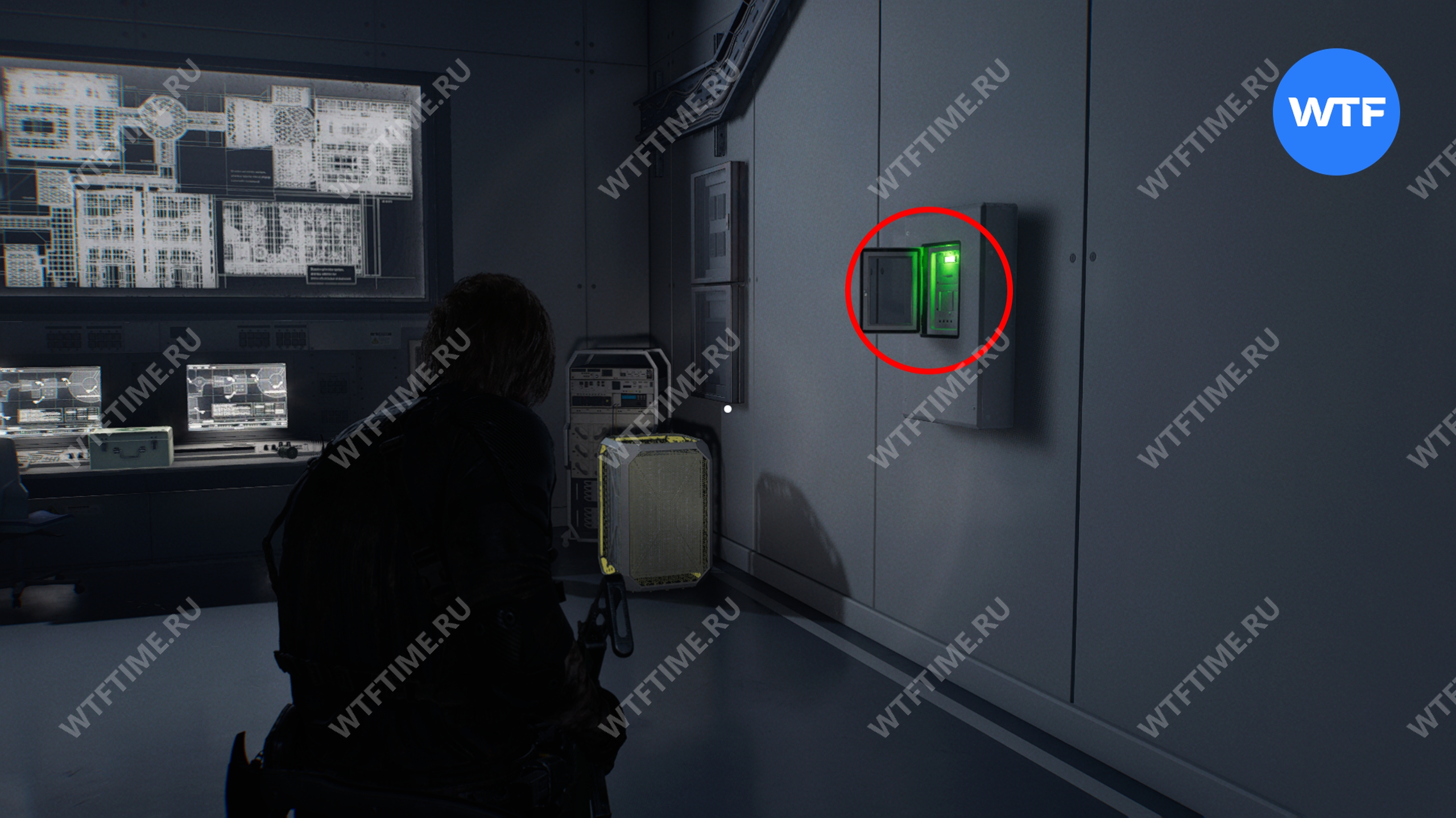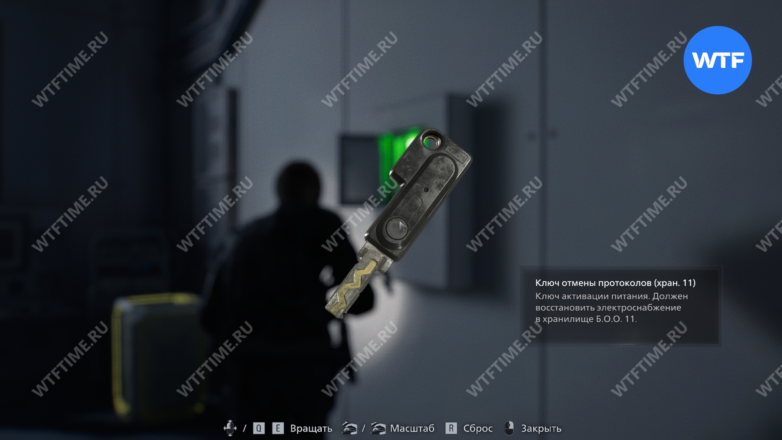 С панели с зеленой подсветкой у дальней стены вам также нужно забрать ключ отмены протоколов (упр. отх.). Будьте осторожны, в этой комнате прячется парочка зараженных.