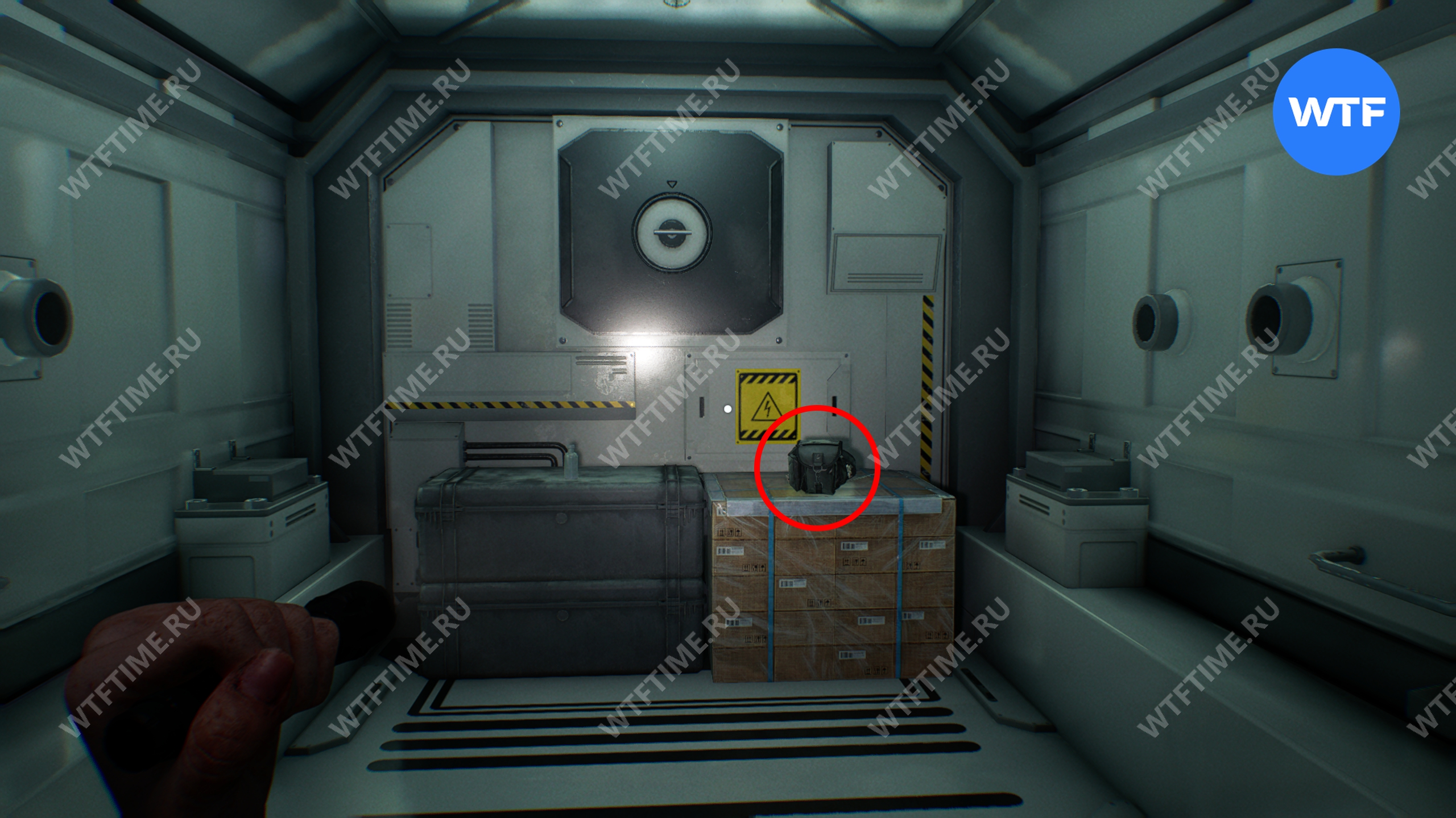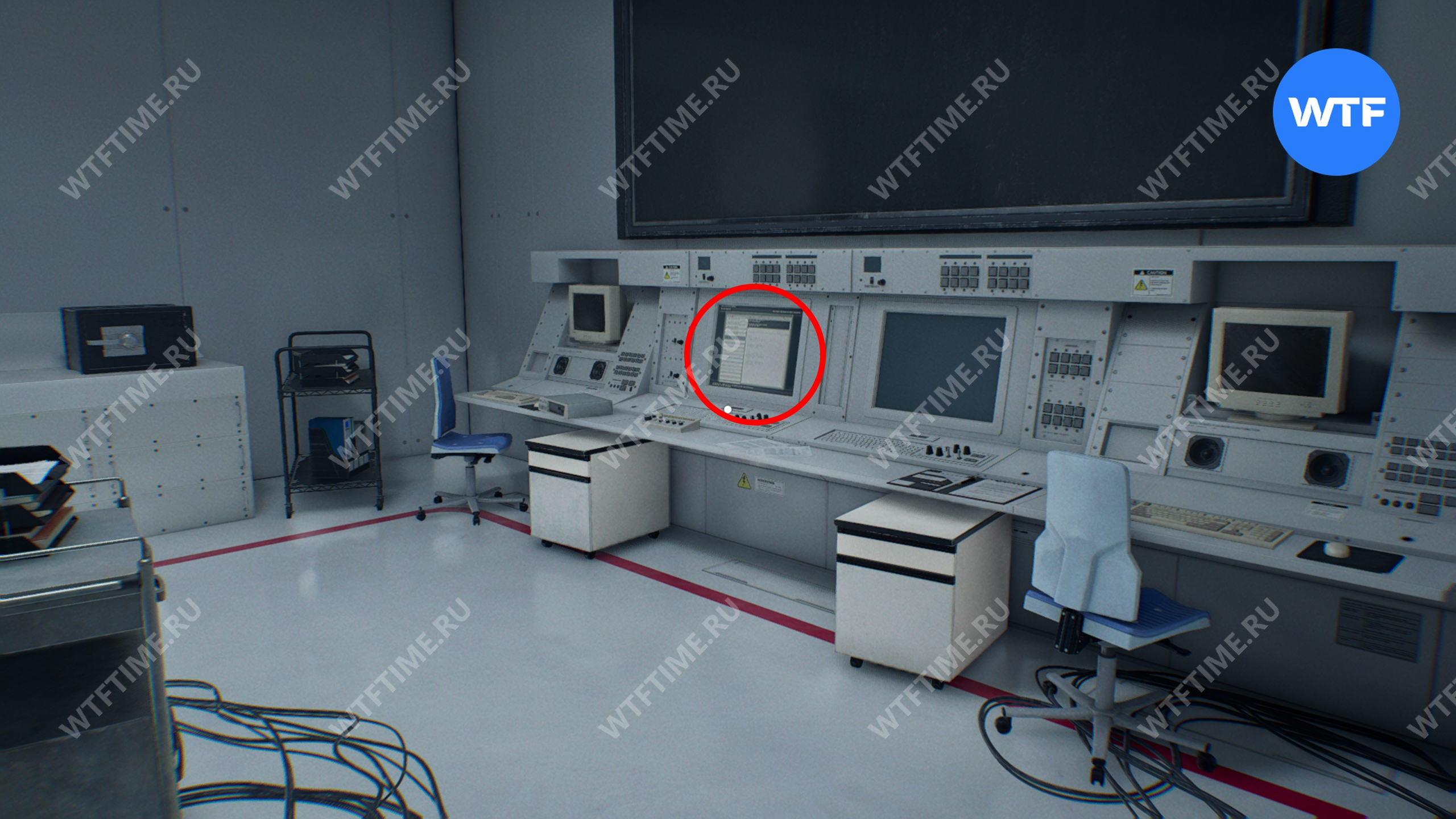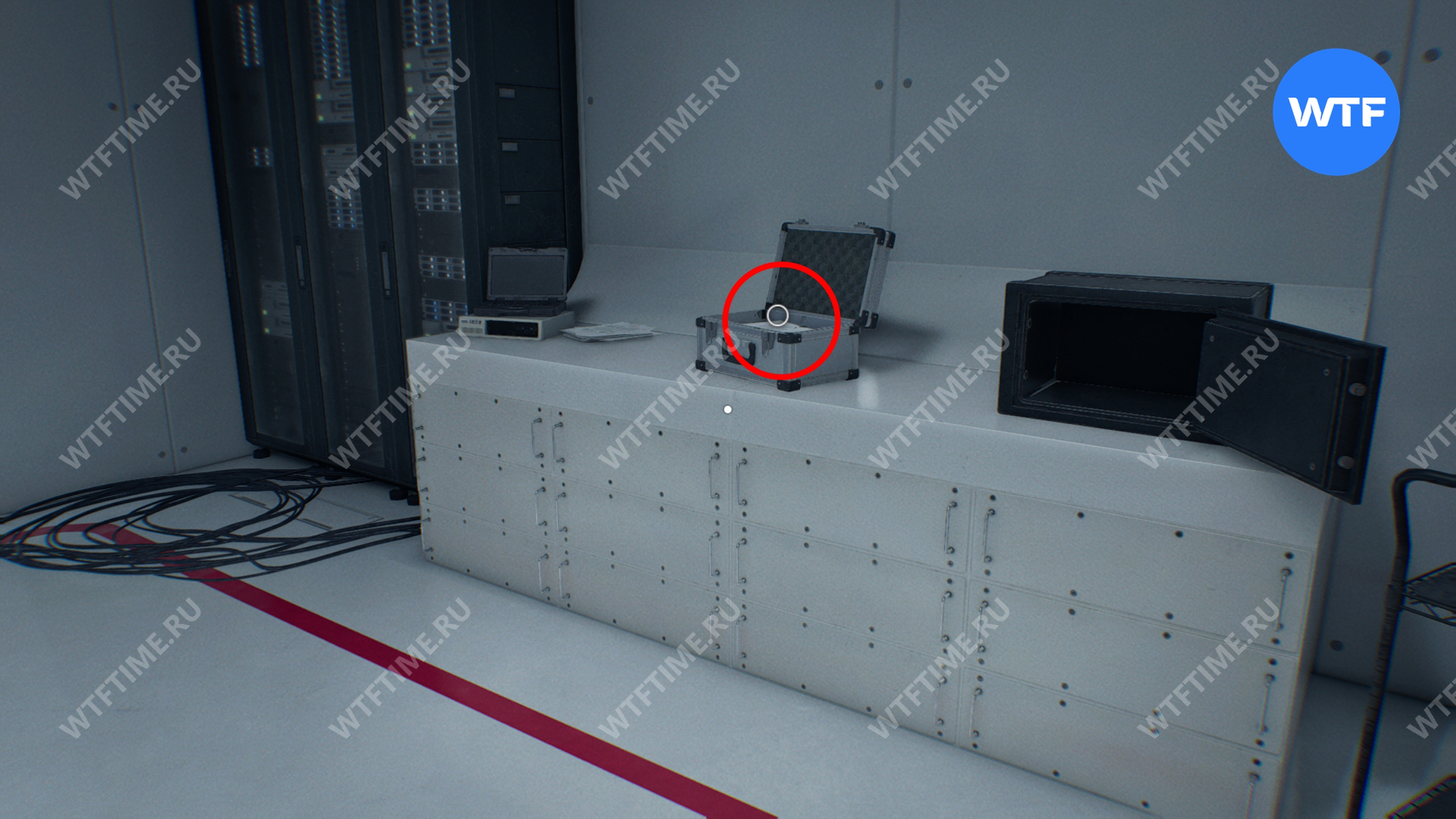 В этой же комнате внутри самого правого открытого контейнера в среднем ряду вы найдете документ «Сейф в комнате наблюдения». Также стоит обыскать остальные контейнеры в этом хранилище, внутри них много припасов.