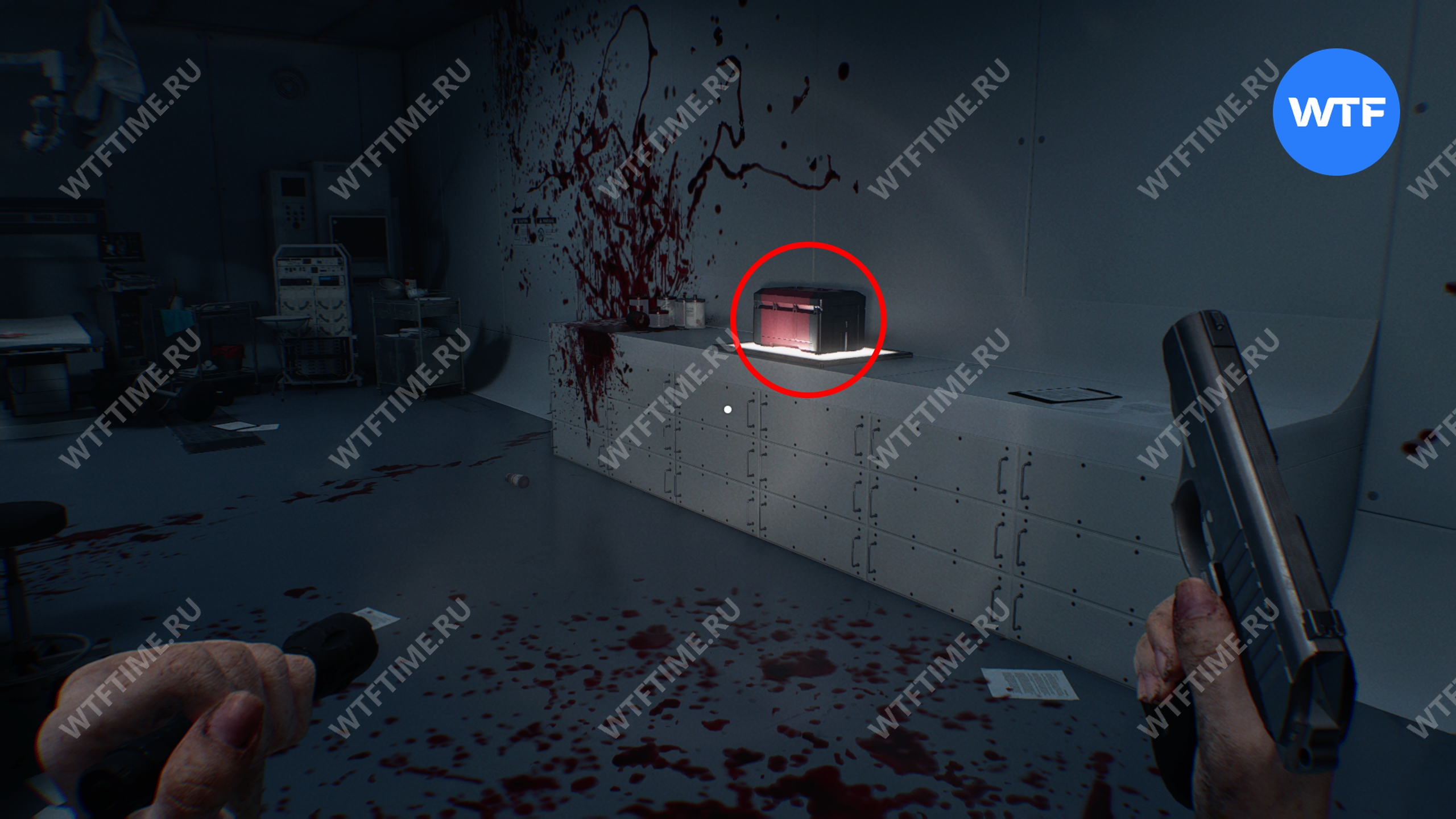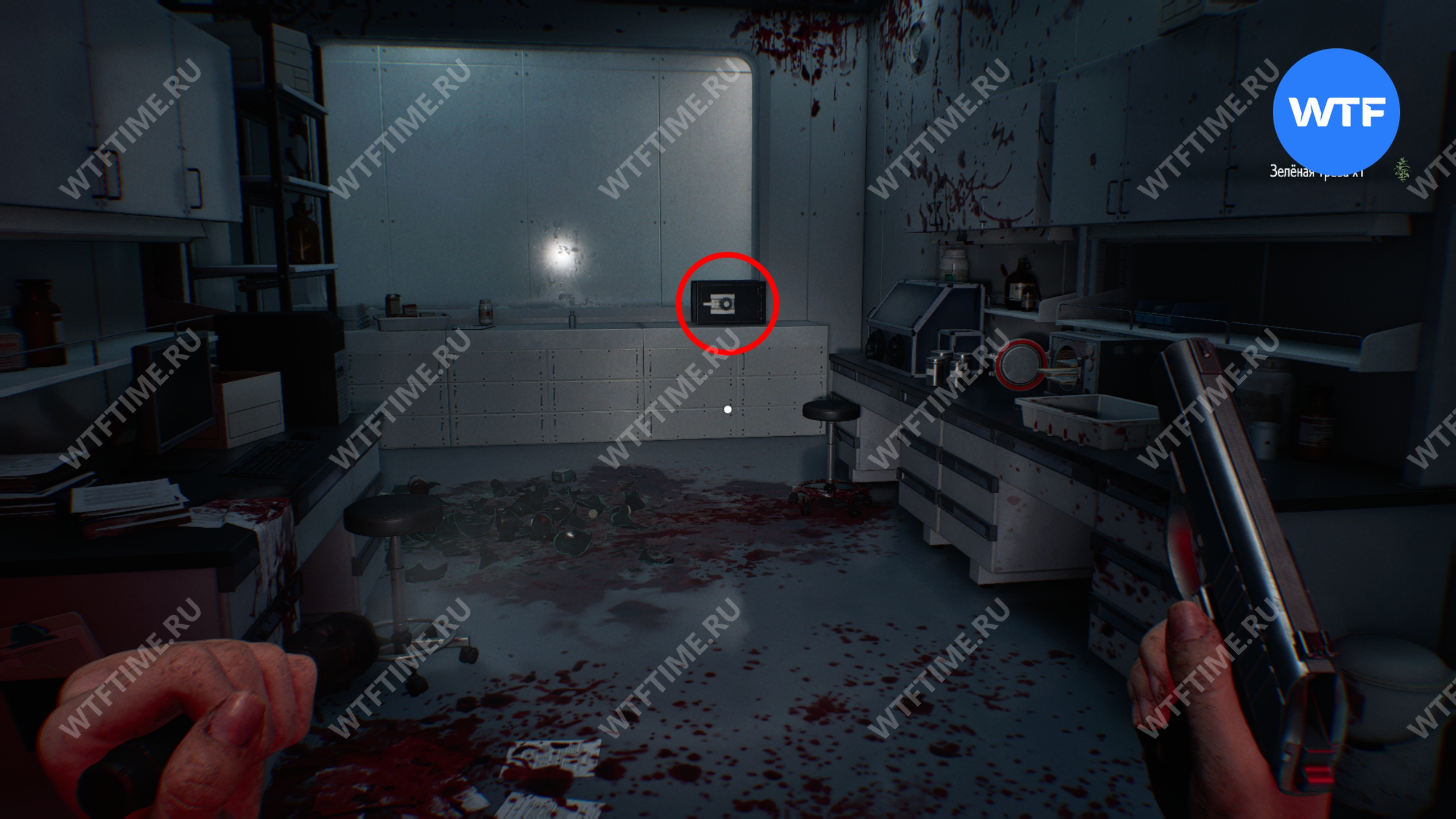В дальнем правом углу от входа в комнату стерилизации на столе будет стоять запертый сейф. Код от него мы найдем в записке позже, но открыть можно уже сейчас, используя следующую комбинацию (внутри лежат кое-какие припасы):