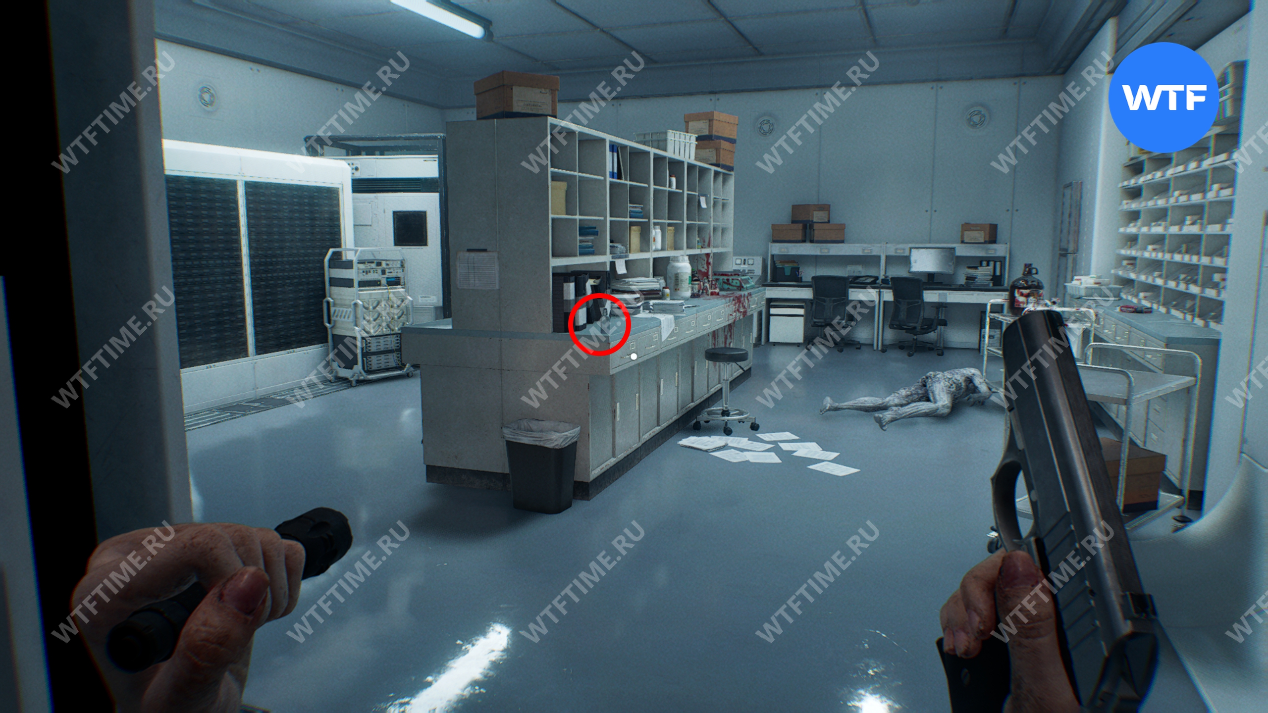 Из вестибюля идите по коридору на запад, пройдите через комнату ожидания и спуститесь по лестнице вниз. Пройдите еще немного вперед и осмотрите ящики справа, чтобы найти там документ «Сейф в камере стерилизации».