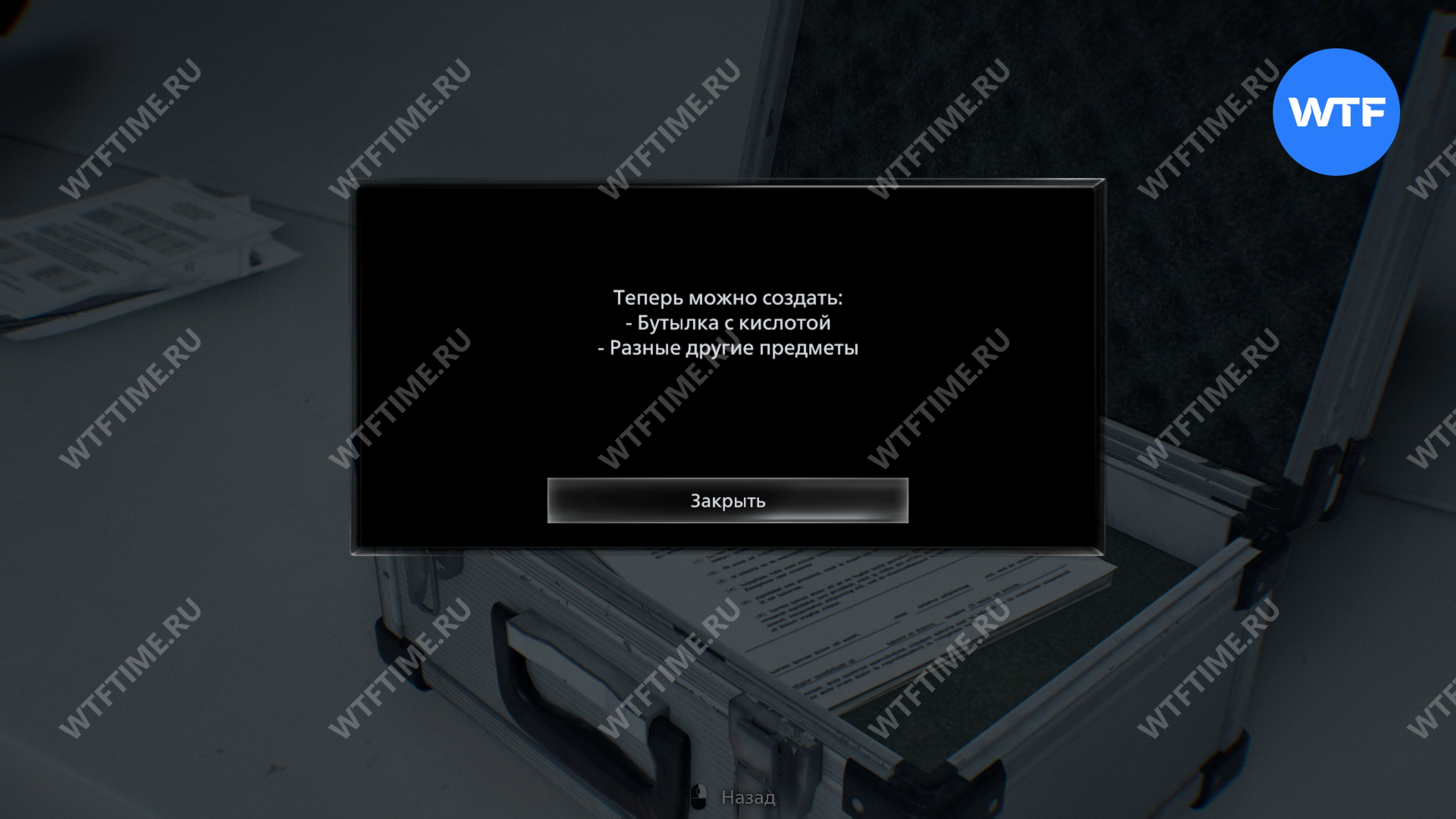 Слева от сейфа также стоит открытый чемоданчик. Заберите из него рецепт создания бутылки с кислотой. Затем откройте инвентарь и создайте как можно больше таких бутылок, они вам очень скоро пригодятся.