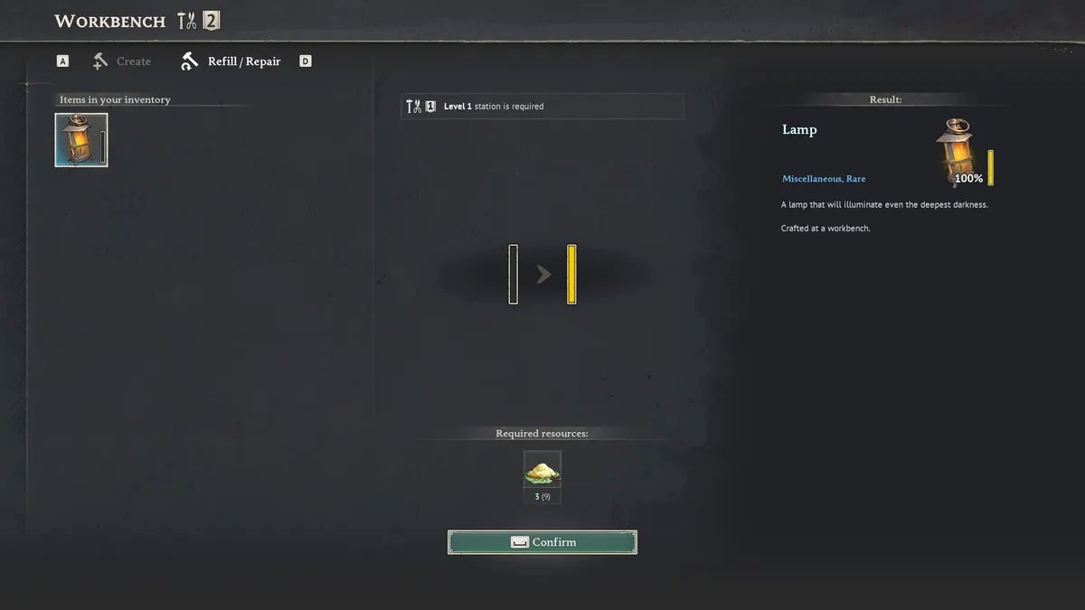 По какой-то причине разработчики Windrose не стали завязывать создание масла и заправку фонаря на стандартную систему крафта. Чтобы заправить лампу, придется открыть верстак в разделе, отвечающем за ремонт.