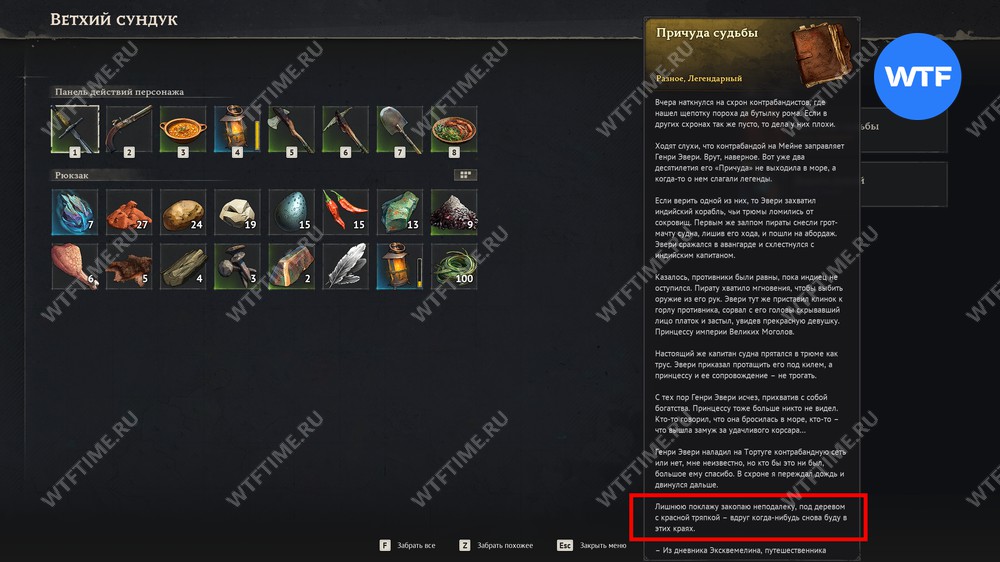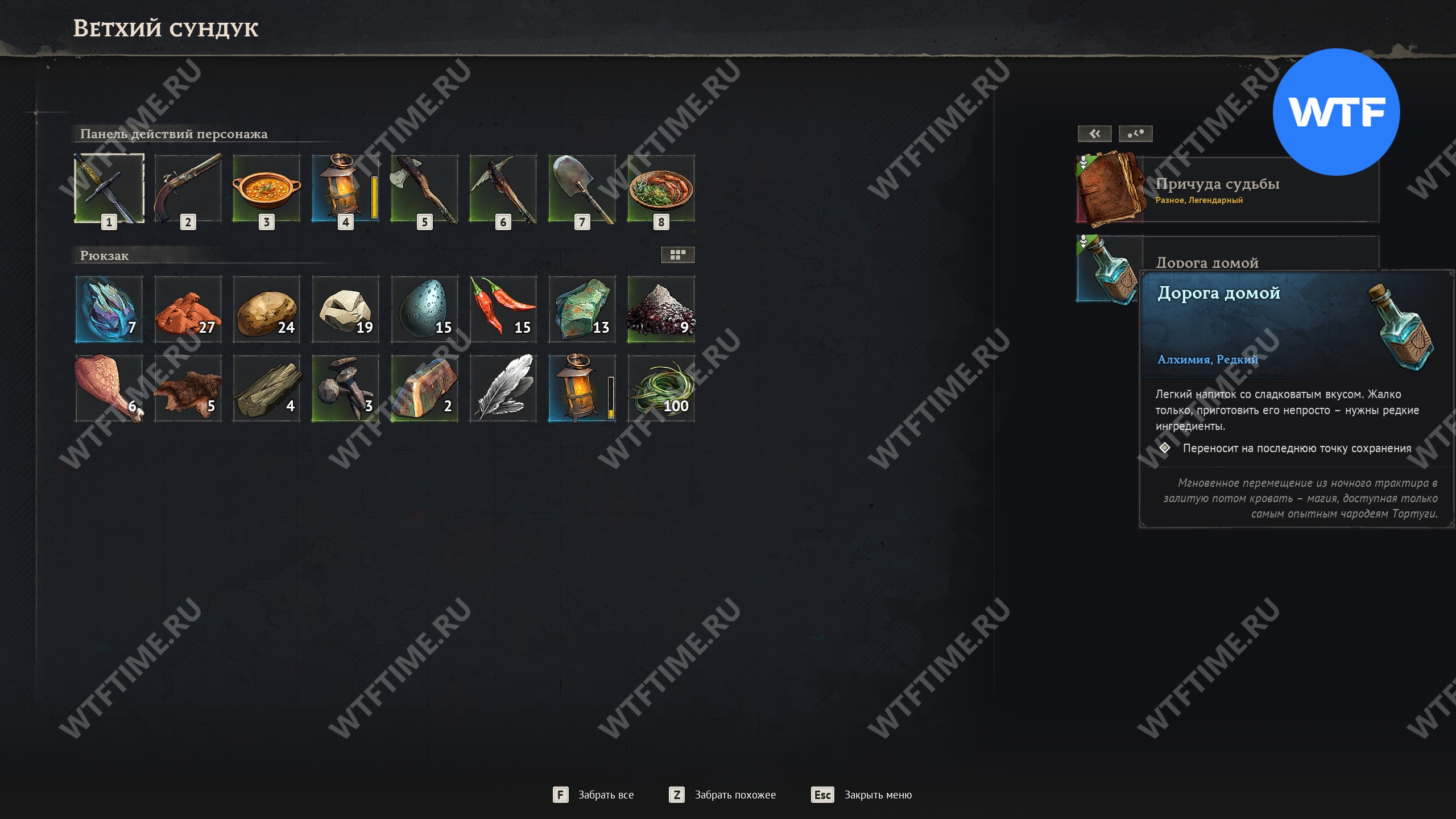 Получив инструмент, отправляйтесь в лагерь путешественника. Там вы найдете ветхий сундук, внутри которого лежит алхимический напиток «Дорога домой», а также книга «Причуда судьбы».