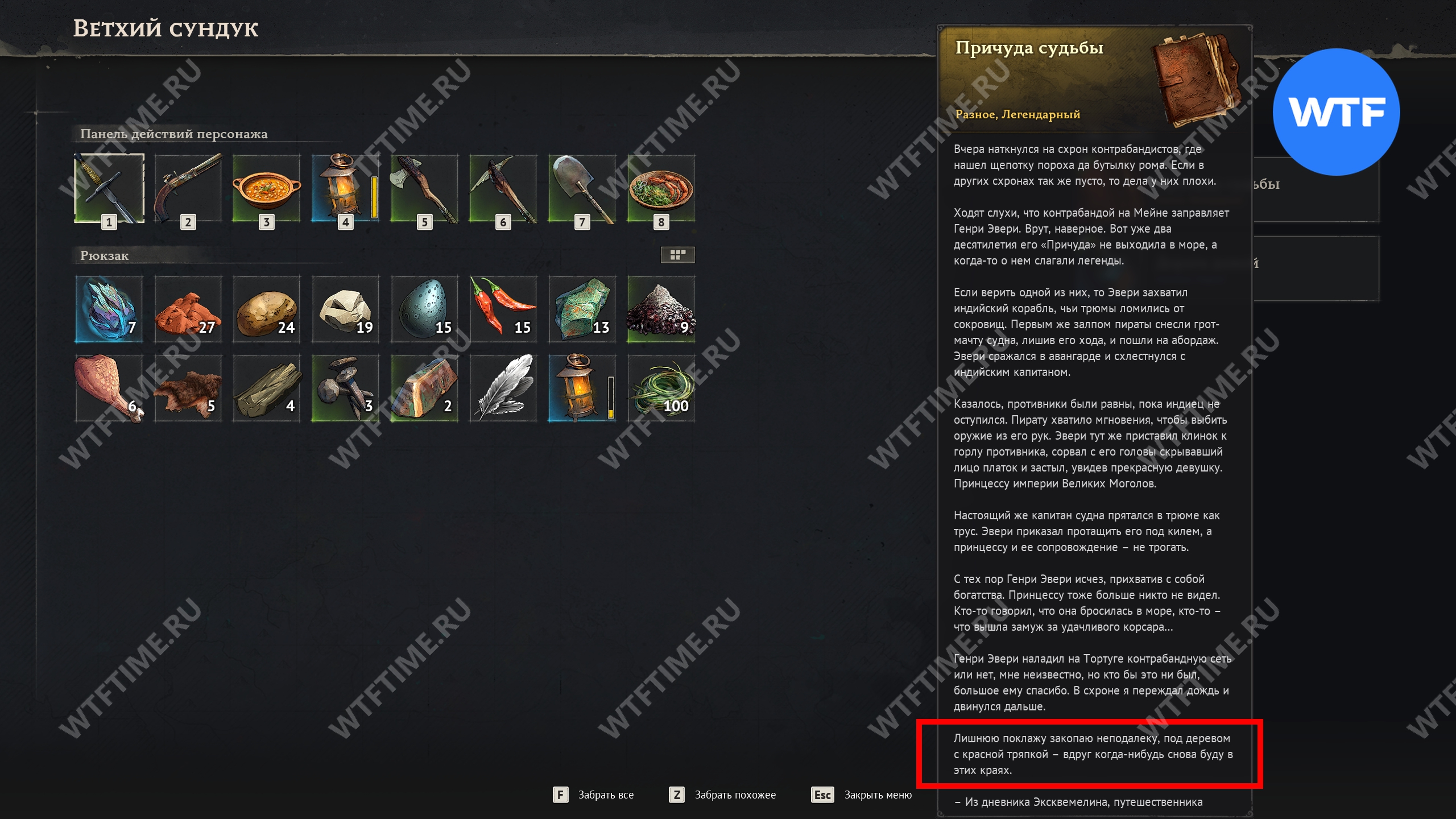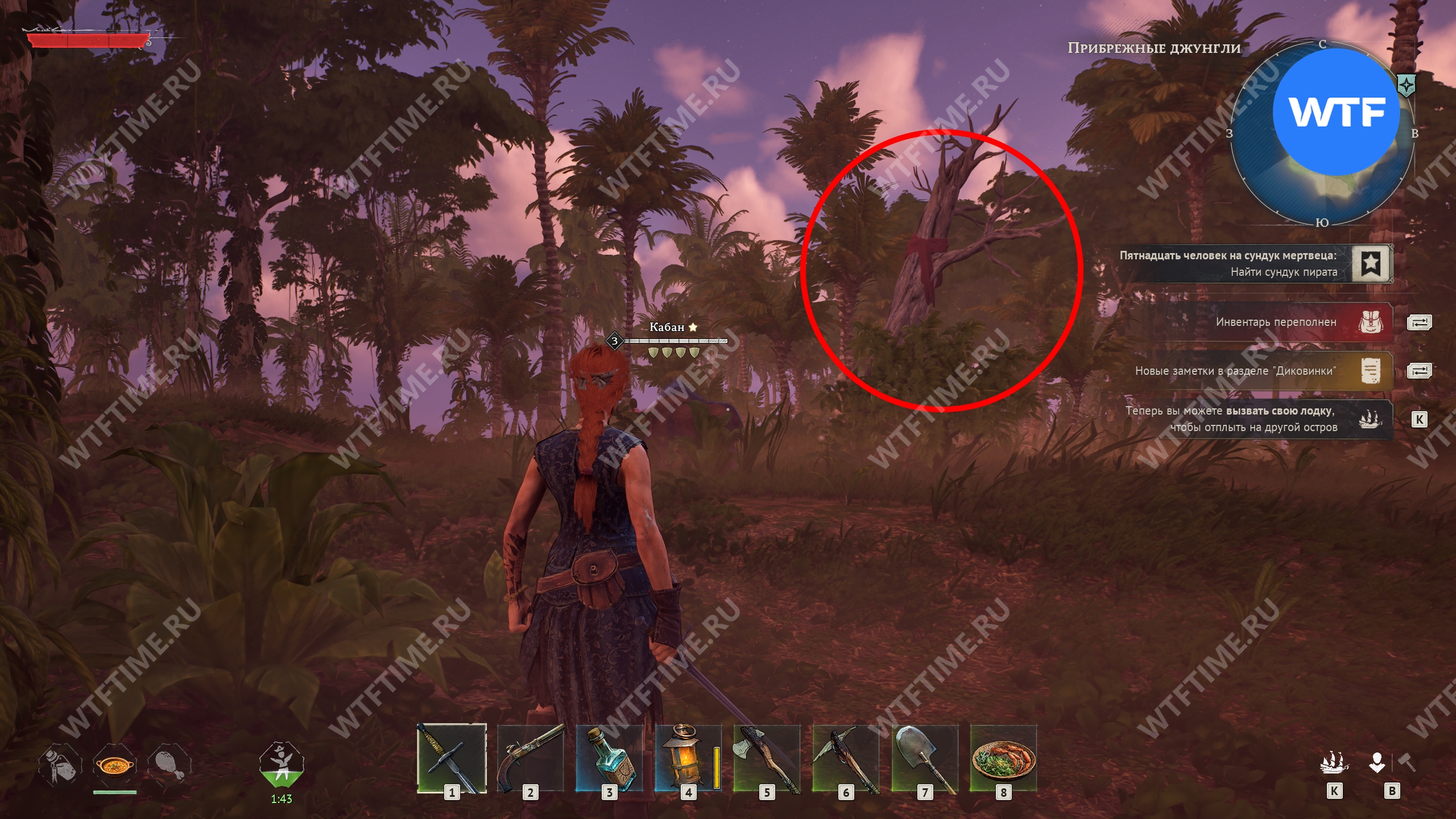 В записях говорится о дереве с красной тряпкой, найти которое можно к юго-западу от лагеря путешественника. Прямо рядом с ним у нас стоял очень упитанный и агрессивный кабан 3 уровня.