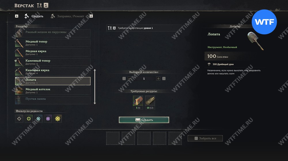 Для этого воспользуйтесь верстаком в лагере. Рецепт для крафта лопаты разблокируется сразу после получения первого медного слитка (это можно сделать, следуя сюжетному квесту). Для изготовления лопаты вам потребуется 3 медных слитка и 10 древесины.