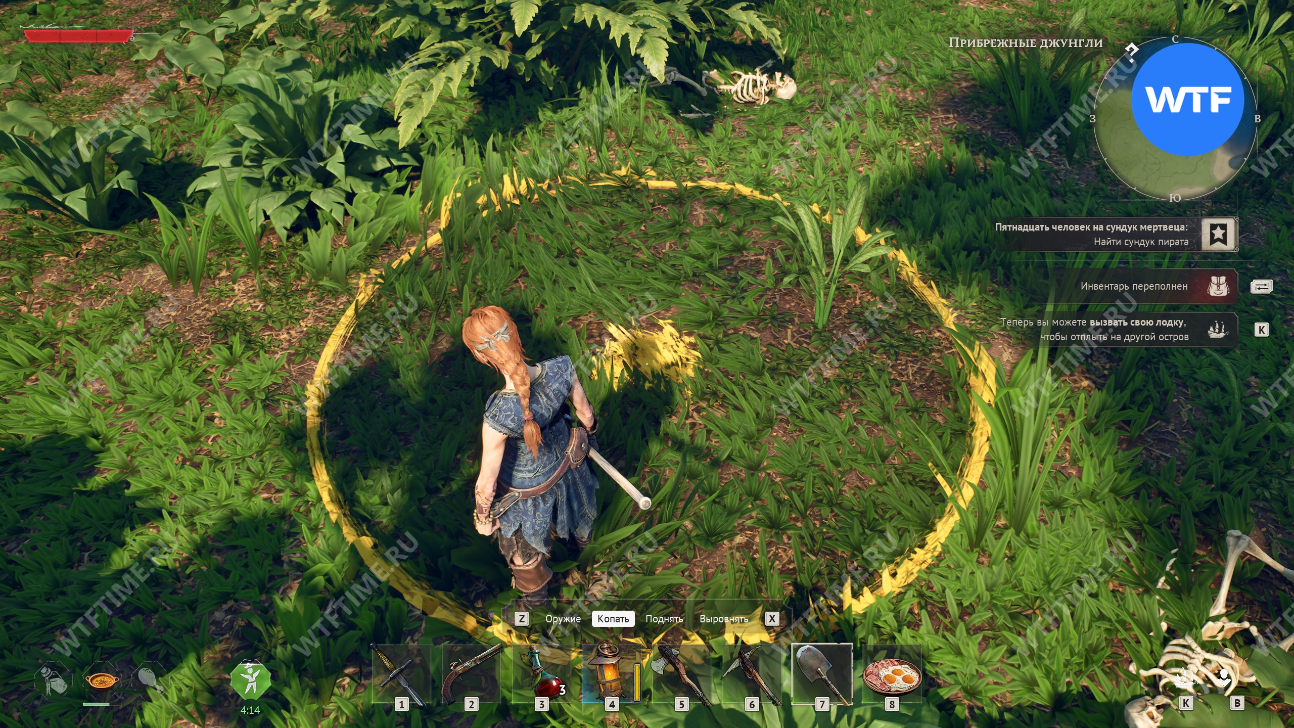 Получив лопату, отправляйтесь к отмеченному на карте месту, и осмотритесь. Там на земле вы увидите четыре скелета — копать нужно прямо по центру между ними. Для этого не забудьте переключить лопату в соответствующий режим.