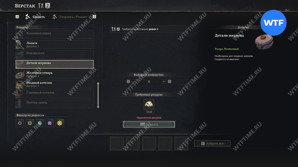 Изготовить детали жернова можно на верстаке за совершенно смешную цену в размере 15 камней. Предварительно вам потребуется улучшить свой верстак до второго уровня (например, построив стойку для распиливания бревен).