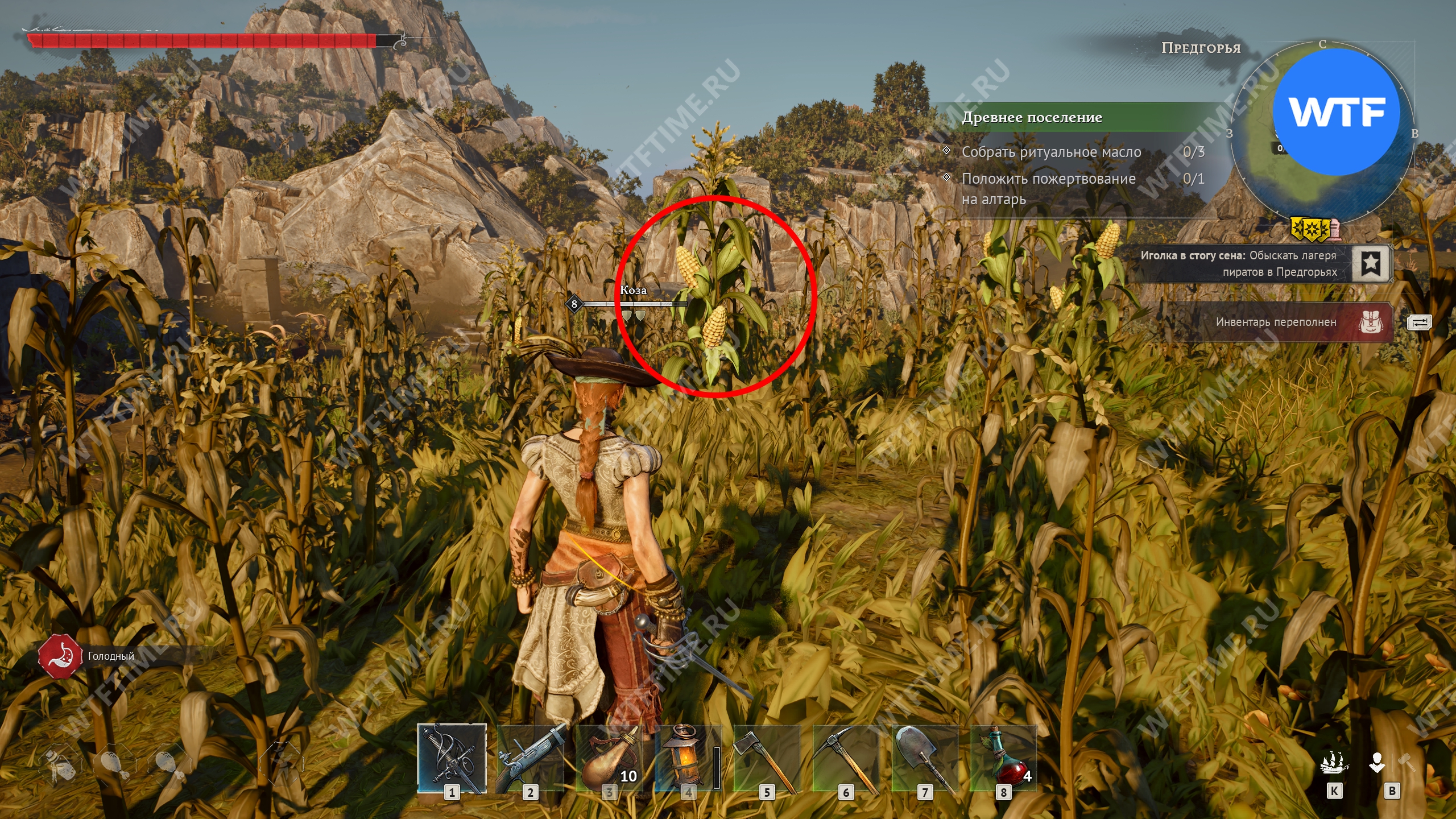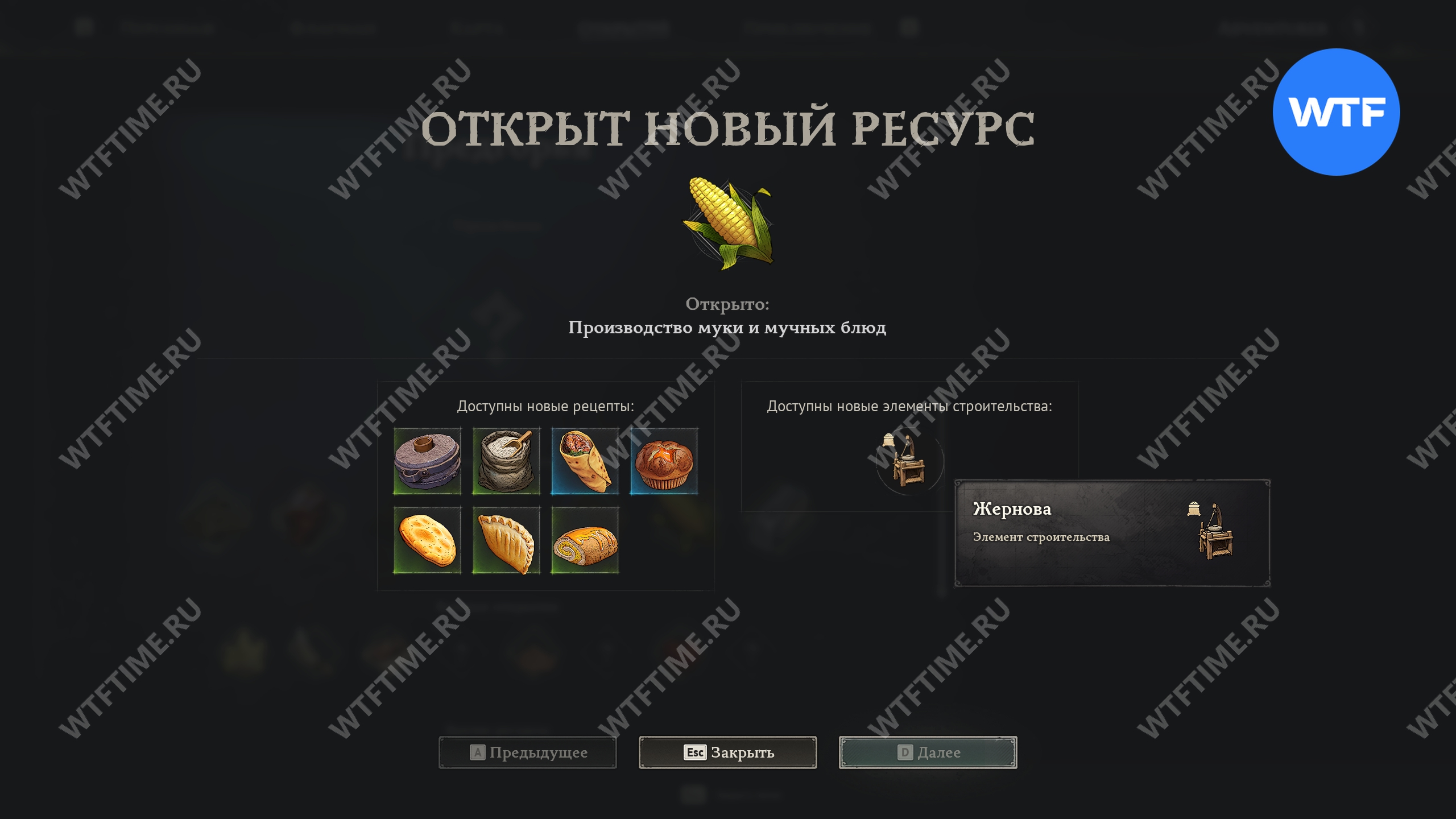Однако просто открыть Предгорья будет недостаточно. Чтобы получить возможность строить жернова, вы должны отыскать новый ресурс — кукурузу. Именно после этого разблокируется рецепт для крафта постройки.