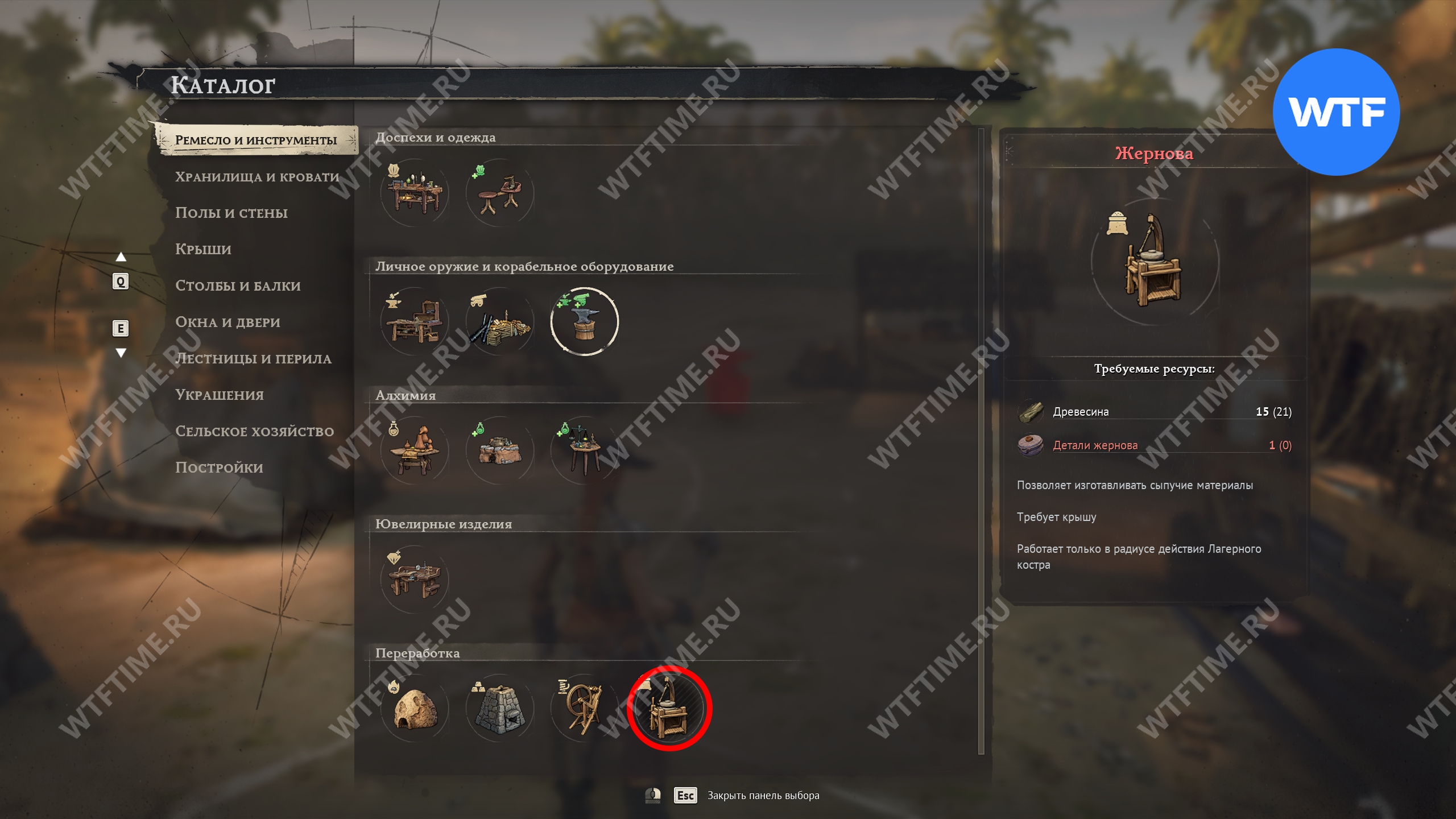 Чтобы построить жернова, зайдите в раздел каталога «Ремесло и инструменты», а затем «Переработка». Вам также потребуется 15 древесины и 1 детали жернова.