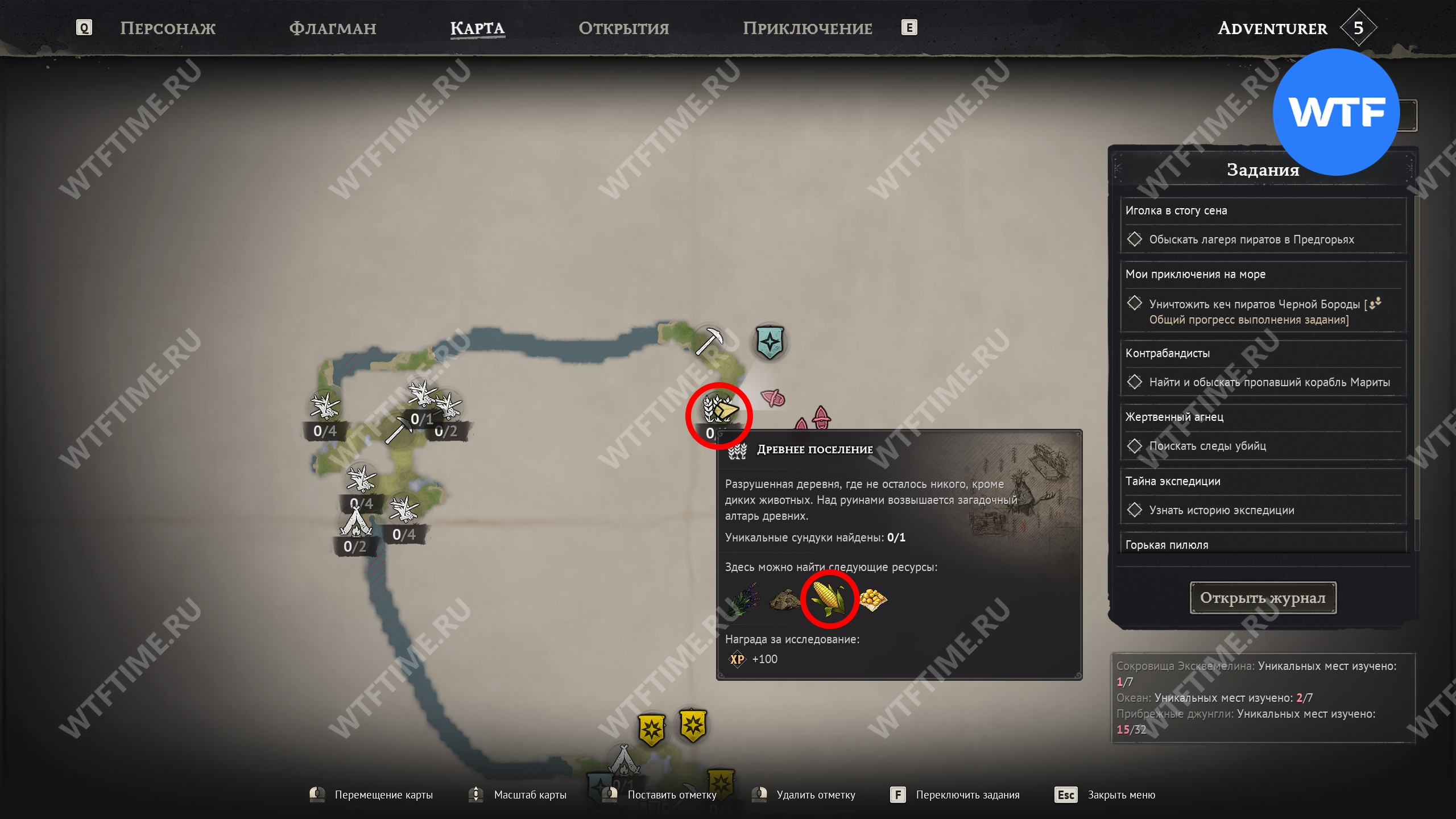Чтобы собрать кукурузу, вы должны отыскать в Предгорьях точку интереса под названием «Древнее поселение». На стартовом острове, куда ведет сюжет, у нас его не было, поэтому пришлось немного поплавать по окрестностям. На карте это поселение обозначается иконкой с тремя колосками.