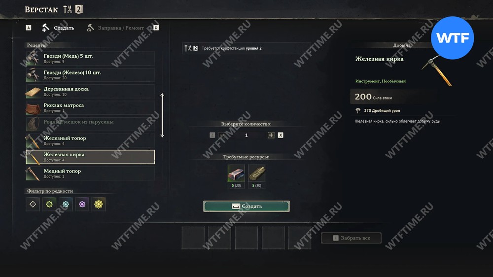 Создать железную кирку можно на верстаке второго уровня. Для этого вам потребуется 5 слитков горного железа и 5 древесины. После этого можете смело отправляться пополнять свои запасы серы.