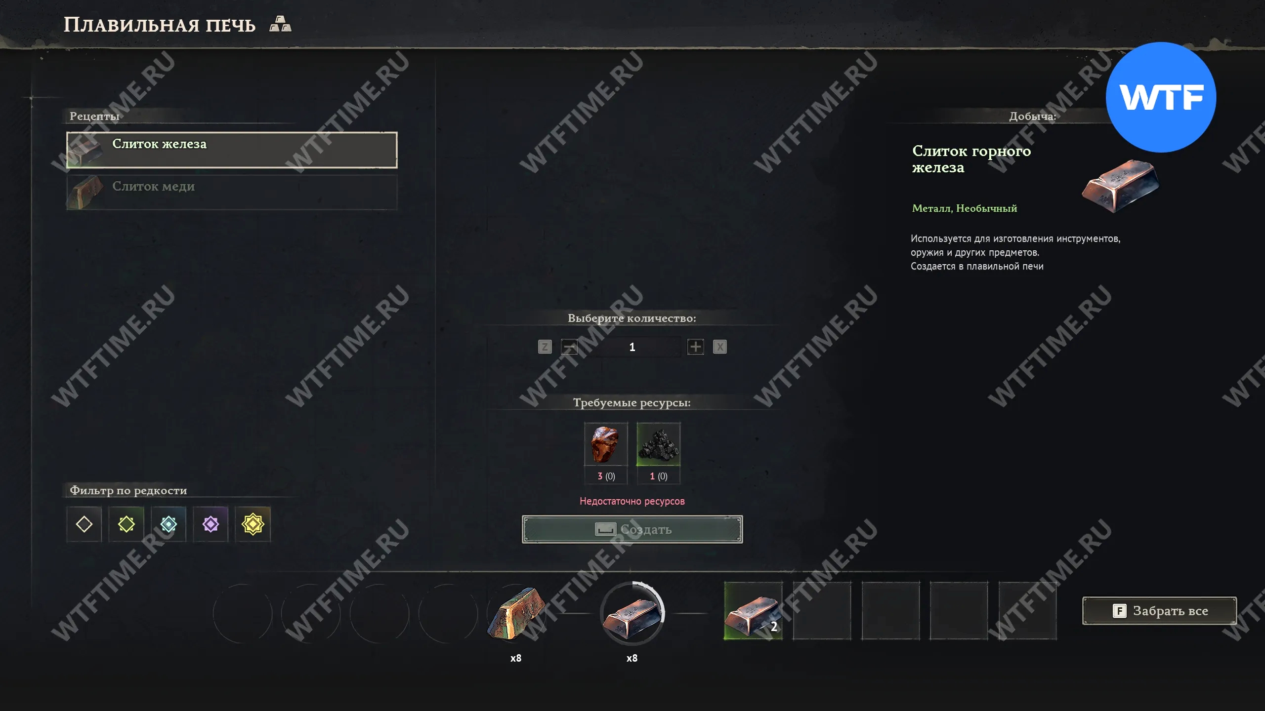 Собрав достаточно руды, воспользуйтесь плавильной печью, чтобы получить слитки горного железа. На один такой слиток уходит 3 руды и 1 уголь, который в свою очередь можно получить в углевыжигательной печи.