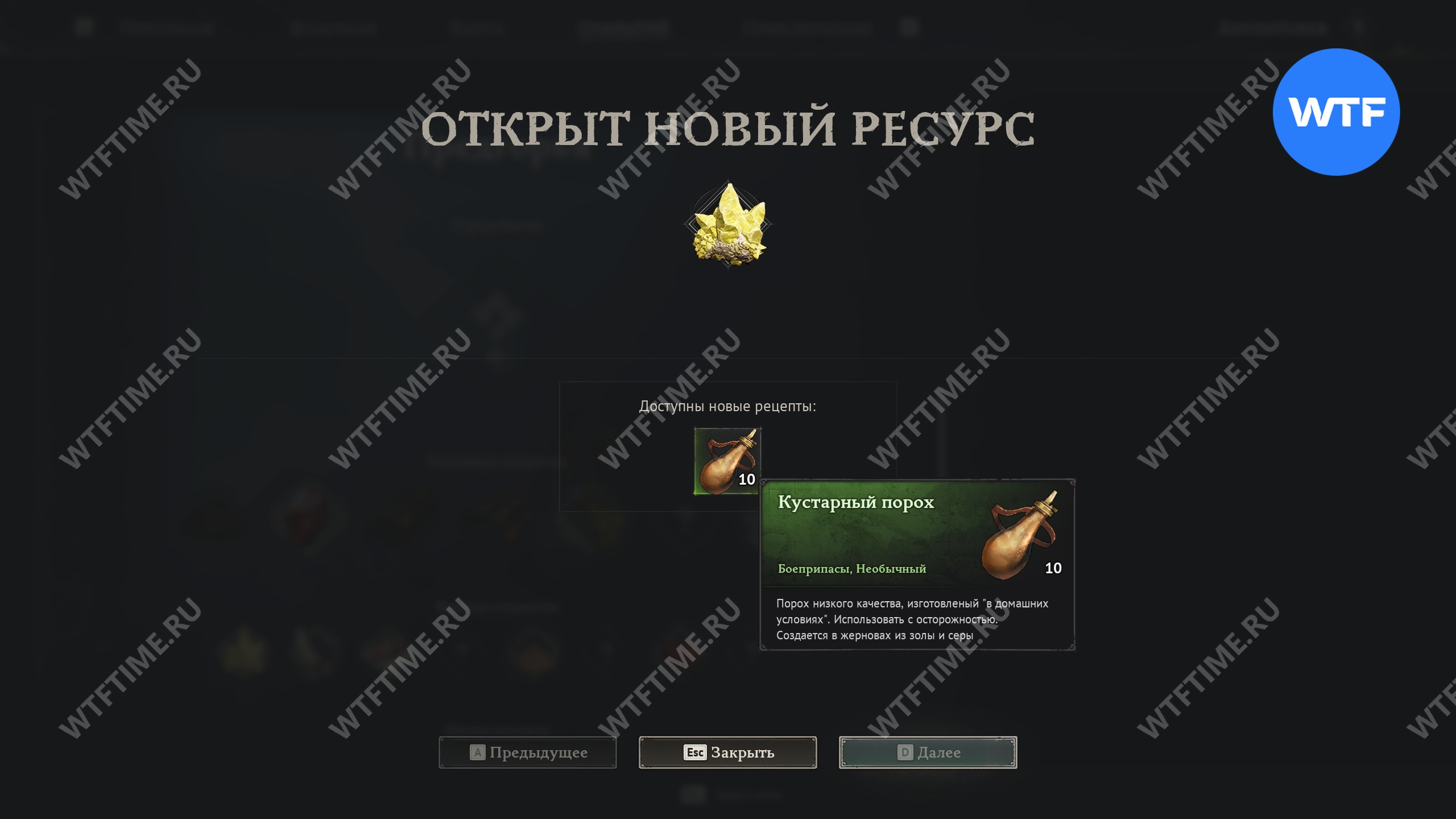 Чтобы научиться создавать кустарный порох, вы должны продвинуться по сюжету до второго биома игры — Предгорий. Сделать это раньше не получится, так как для его изготовления нужно сразу три ресурса из этого региона.
