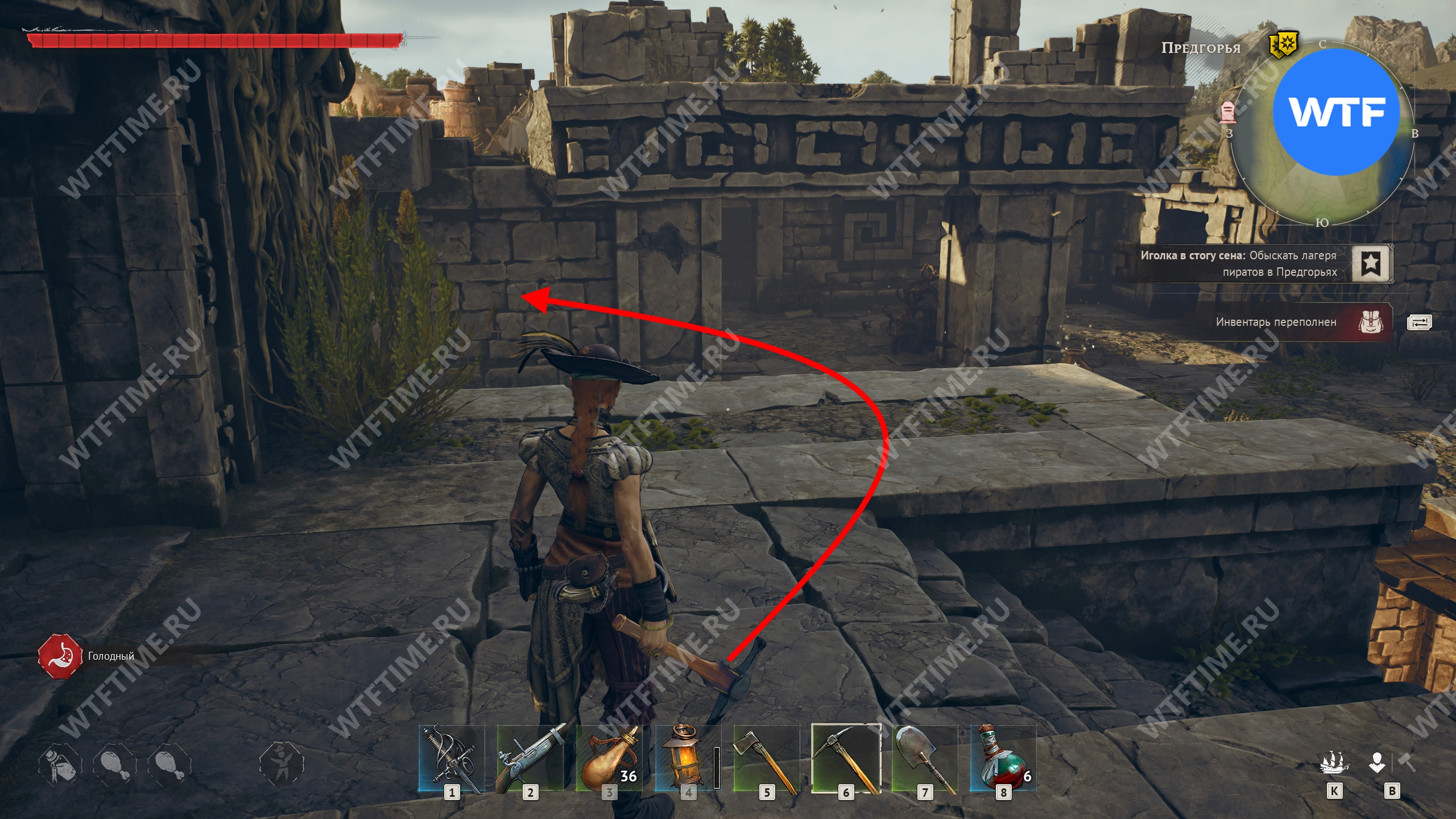 Снова возвращаемся на верхний (уличный) уровень и идем к каменным воротам, которые мы недавно открывали. Становимся к ним спиной и идем к лианам в дальнем правом углу площадки. Проходим под ними, затем сворачиваем налево и ломаем ветхую стену, чтобы добраться до шестого сундука.