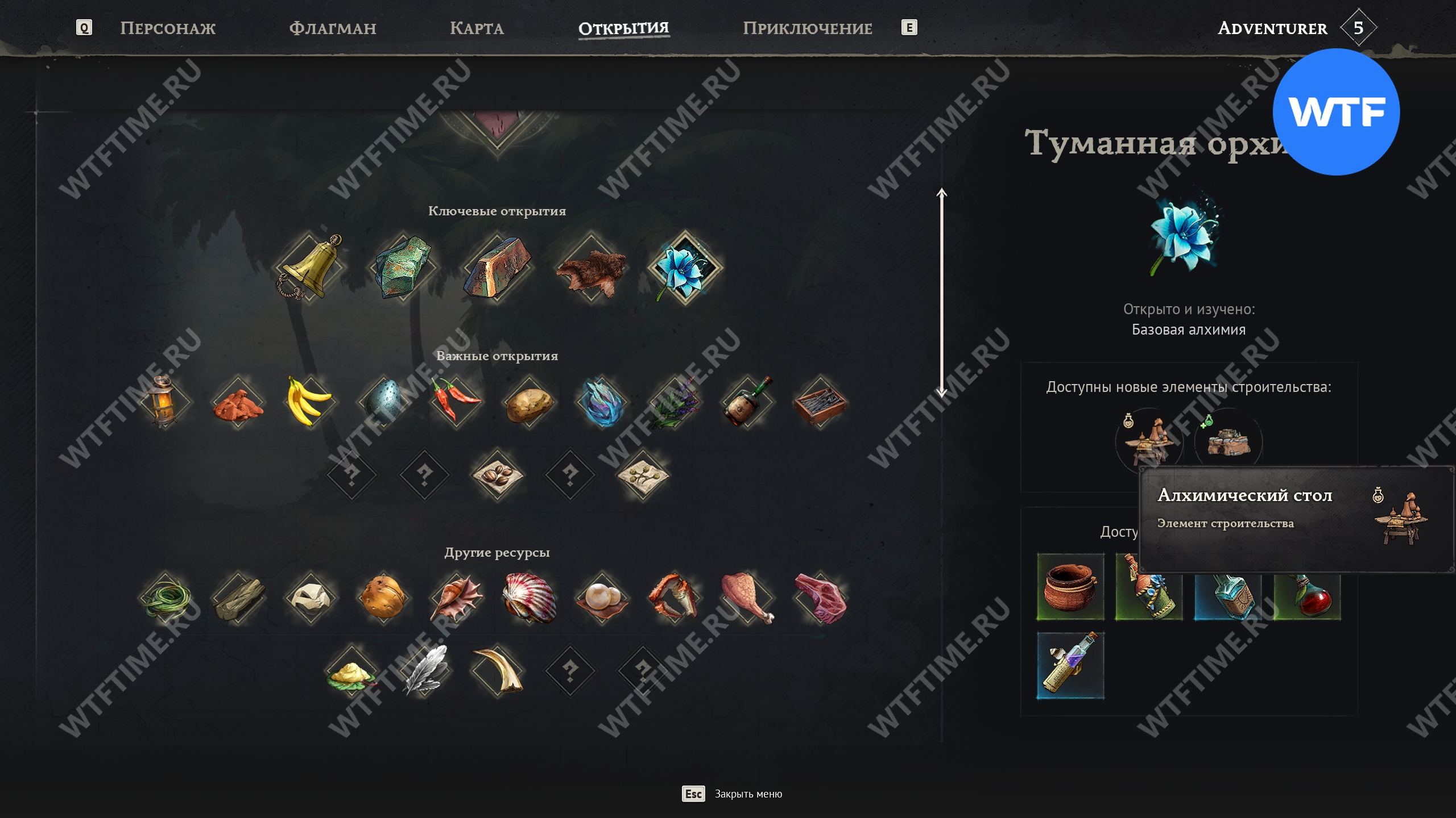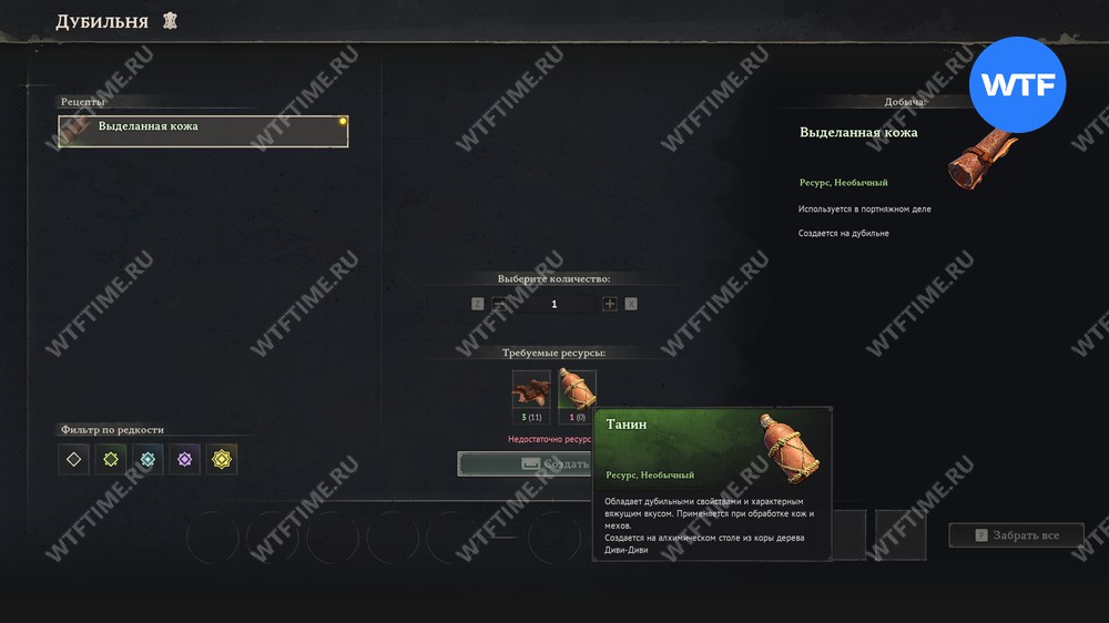Шкур у вас итак должно быть в избытке, а вот танин скорее всего придется изготавливать. Сделать это можно на алхимическом столе. Если рецепт стола у вас почему-то отсутствует, вам нужно вернуться в Прибрежные джунгли и отыскать там синий цветок под названием Туманная орхидея.