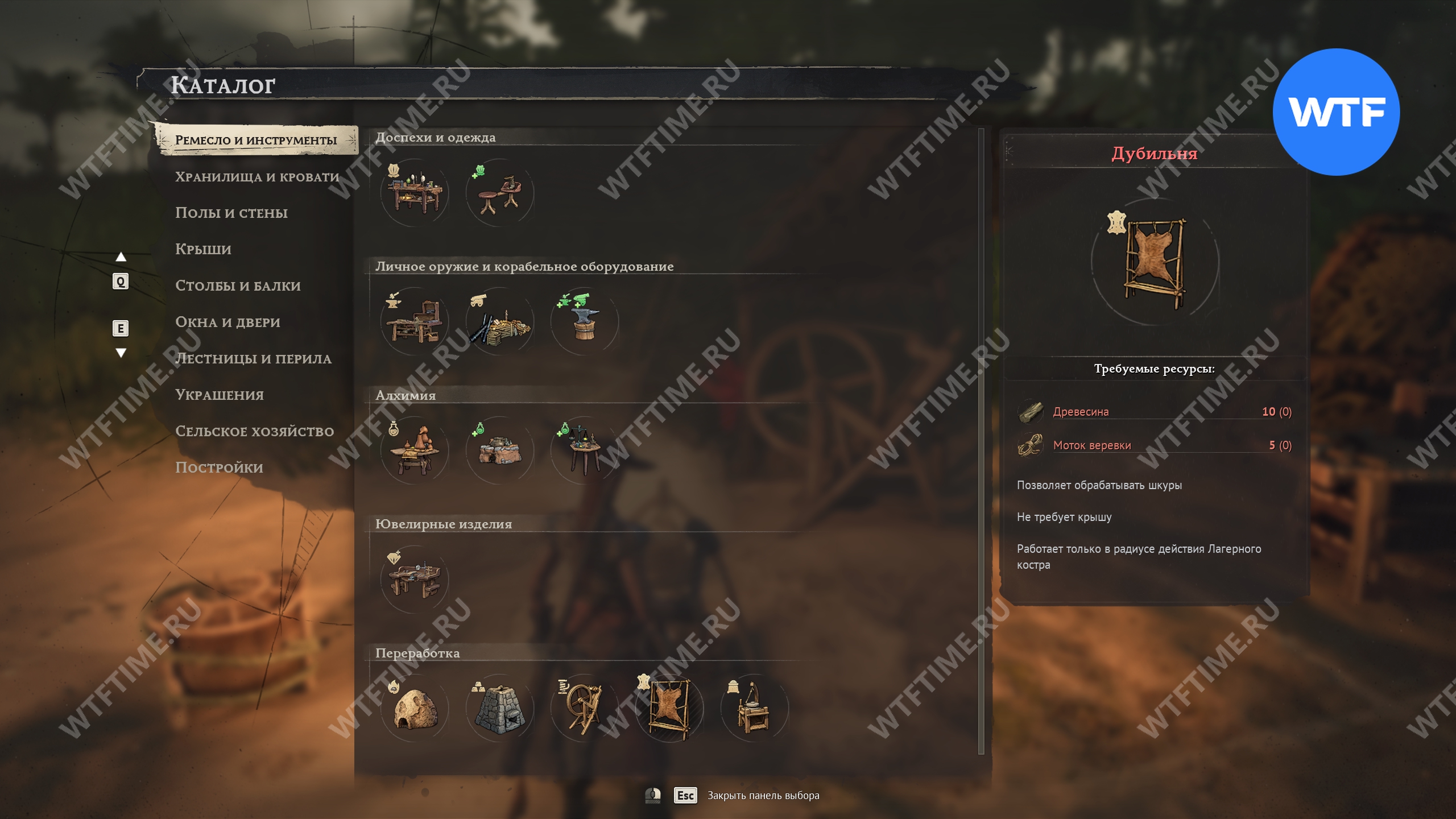 Перейдите в раздел строительства «Ремесло и инструменты», а затем «Переработка». Для строительства дубильни вам потребуется 10 древесины и 5 мотков веревки, которые можно изготовить на верстаке. Также не забудьте построить над ней крышу, иначе дубильня не сможет работать.