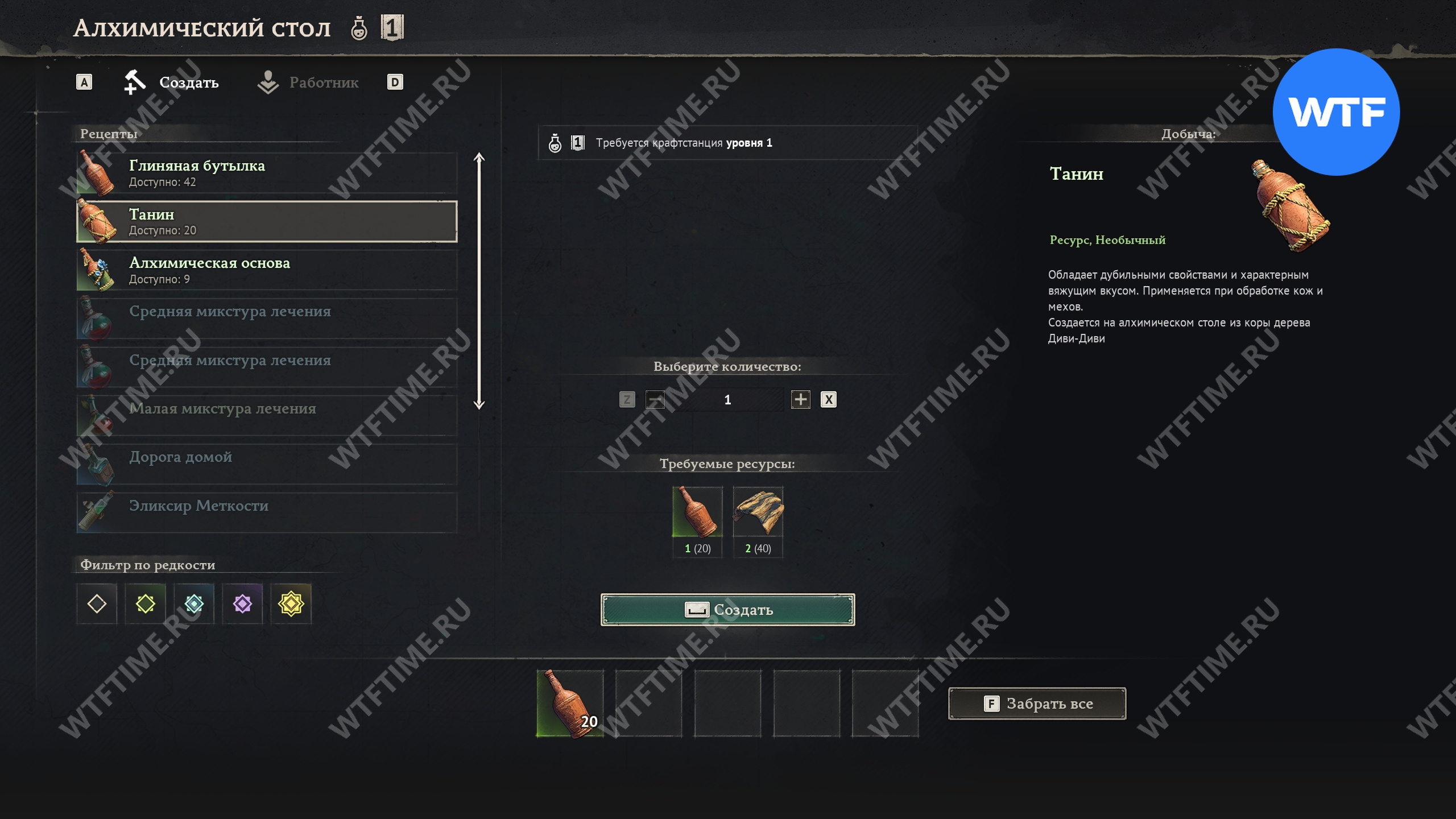 Для изготовления одного танина потребуется 1 глиняная бутылка и 2 коры дерева. Сделать глиняные бутылки можно на этом же алхимическом столе: для изготовления 1 штуки потребуется 1 глина.