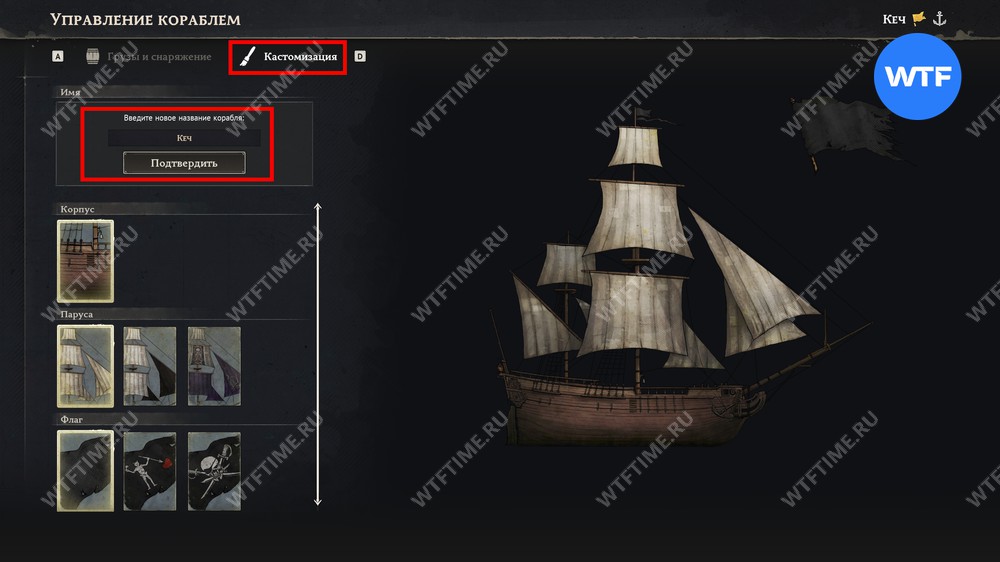 Затем выберите раздел «Кастомизация» и введите имя, которое вам нравится. Здесь же вы сможете изменить корпус, паруса и флаг.