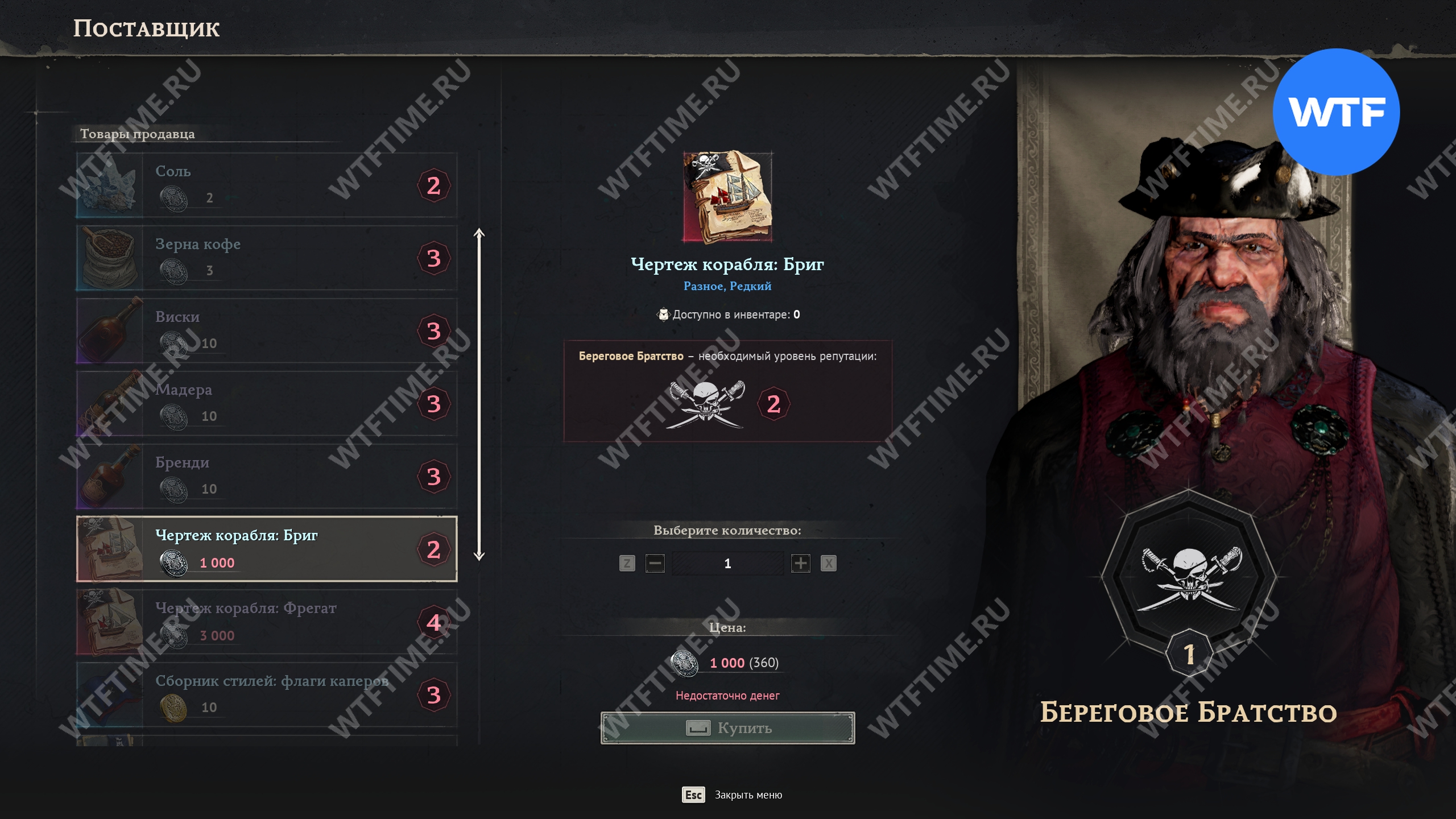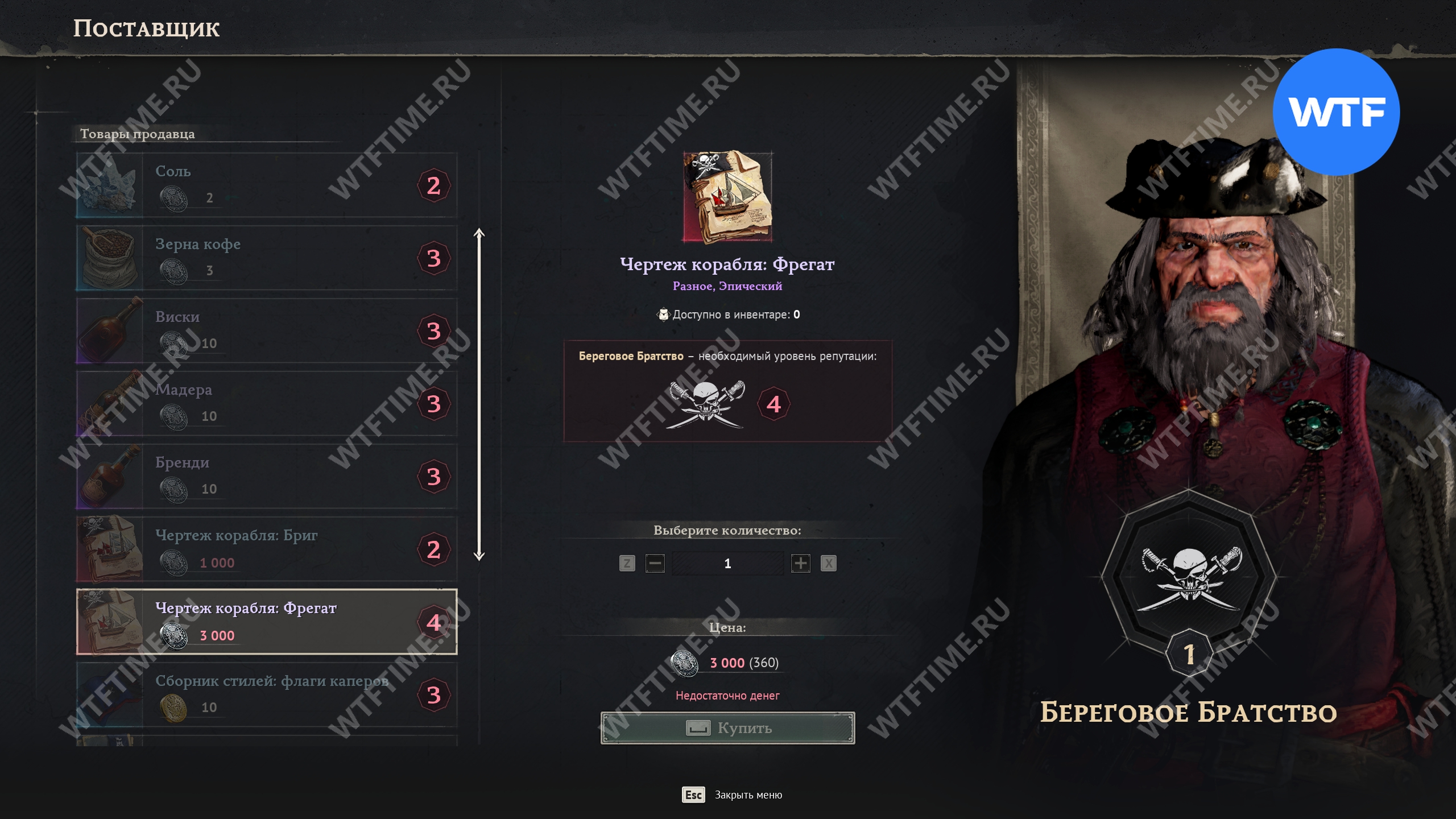 Чертежи фрегатов также покупаются у поставщика Берегового Братства, но при этом вам придется заплатить 3000 пиастров и прокачать репутацию с ними до 4 уровня, что само по себе не мало.