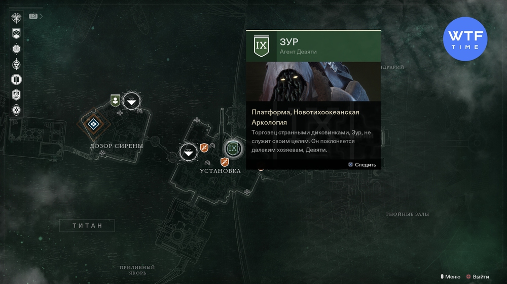 На этот раз Зур обосновался на Титане. Загляните на его любимую каморку в локации Установка. Бежать от быстрого перемещения совсем недалеко. Задержится Агент Девяти здесь на четыре дня и улетит домой за новыми товарами в полдень вторника.