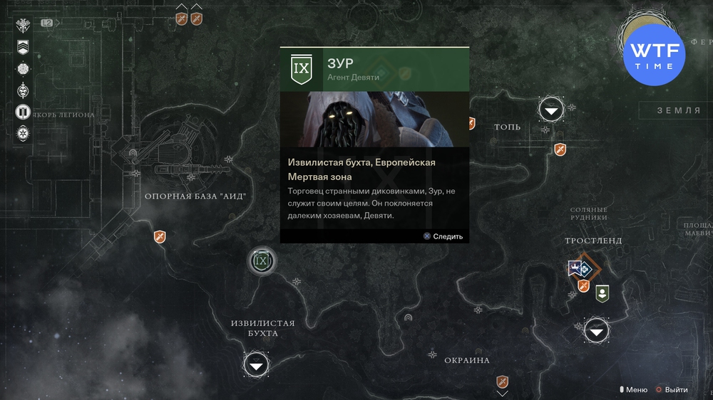 В этот раз Зур обосновался на Земле. Загляните на высокую скалу в локации Извилистая бухта. Бежать от быстрого перемещения совсем недалеко. Задержится Агент Девяти здесь на четыре дня и улетит домой за новыми товарами в полдень вторника.
