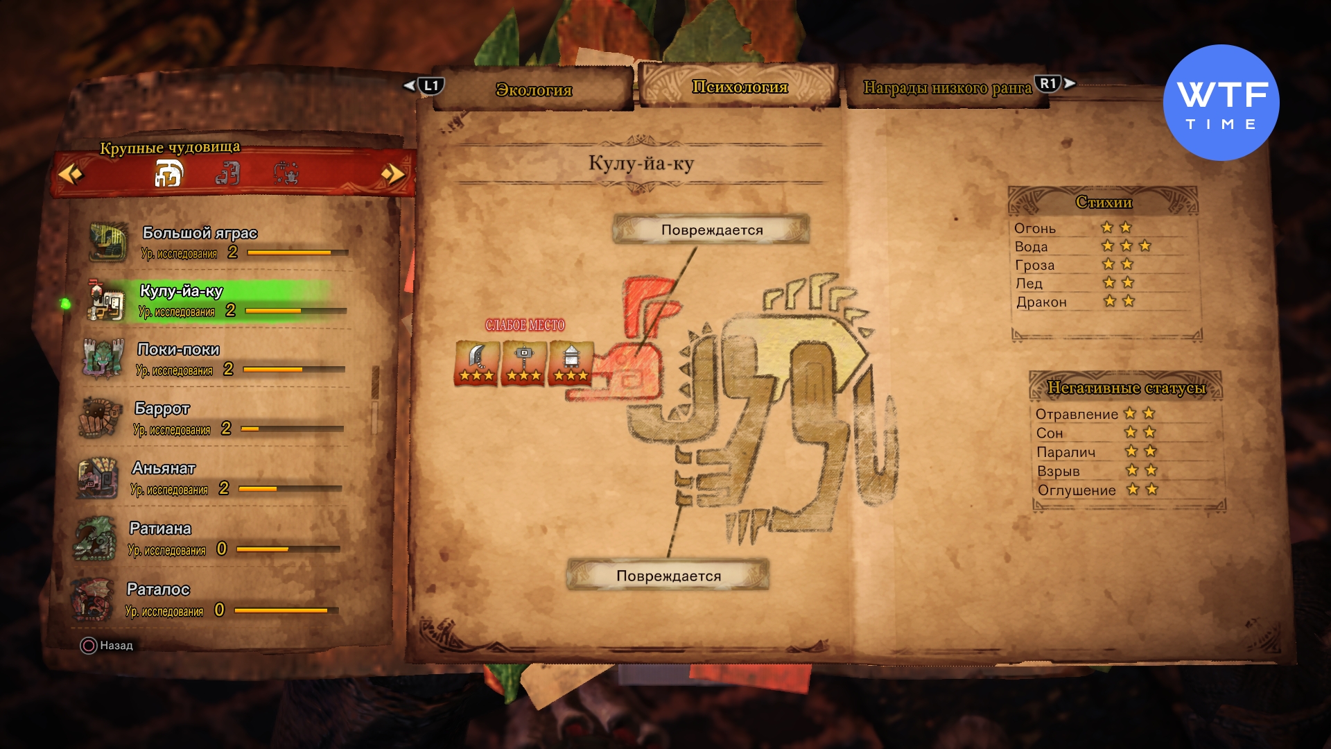 Чудовище использует небольшие камни, чтобы отбиваться ими от врагов. Так что обезоружить виверну из самострела или напугать - хорошая идея. Наиболее уязвимое место Кулу-йа-ку - голова. Чтобы выбить больше перьев, можно повредить еще и лапы. Из стихий это чудовище больше всего не любит воду.