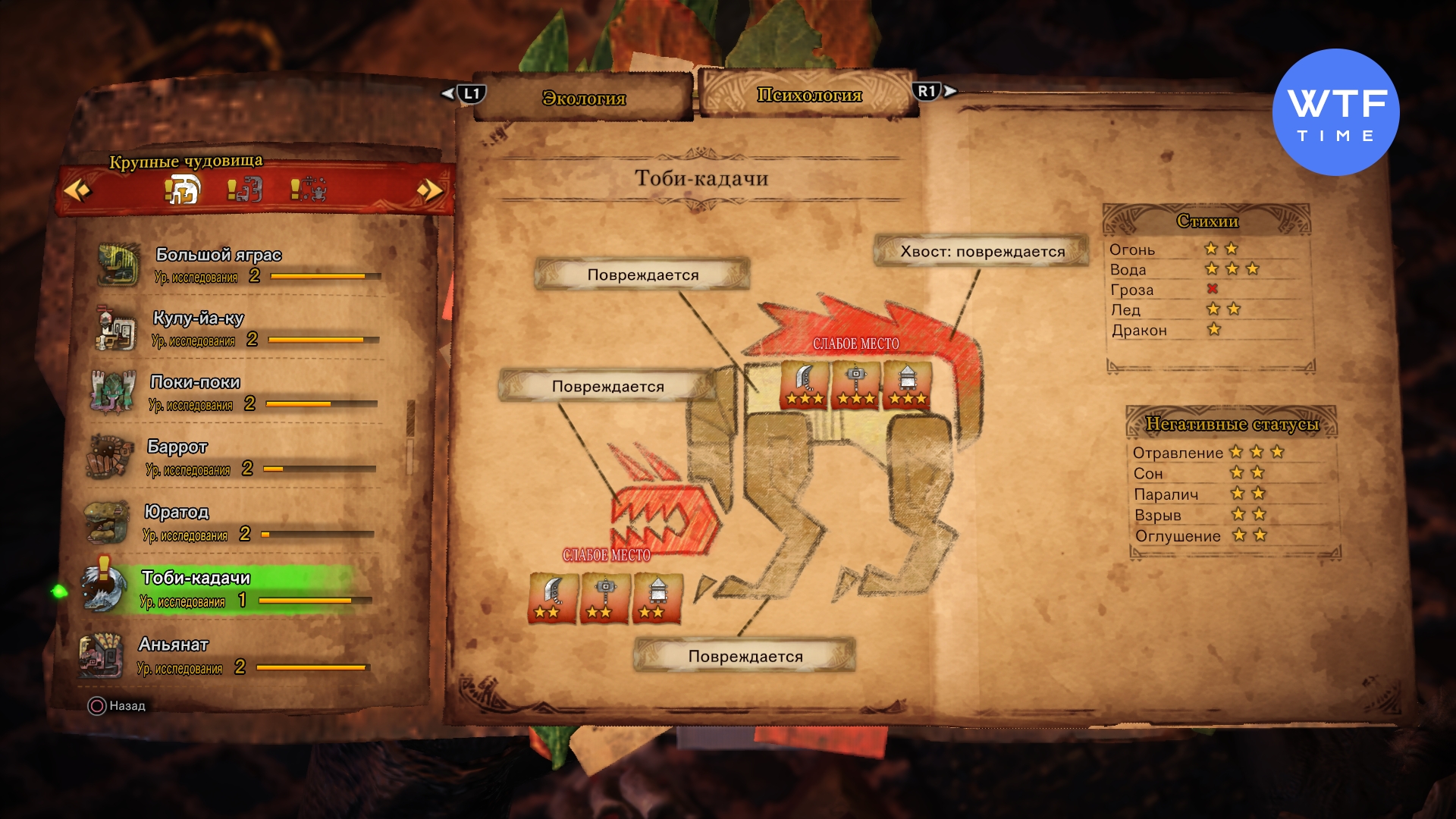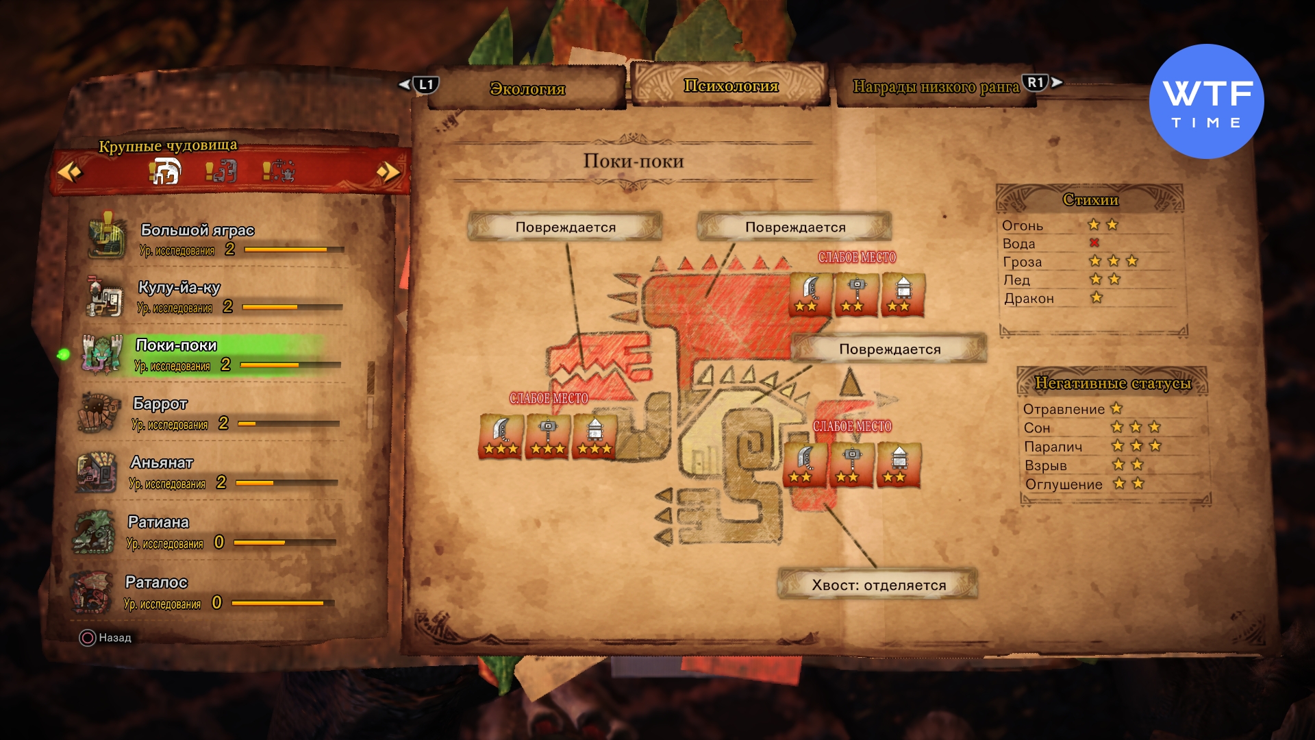 Наиболее уязвимая часть этого чудища - голова. Второе место по получаемому урону делят крылья и хвост. Эта виверна очень любит взмывать ввысь, когда удары становятся критическим. Поэтому держите самострел наготове. Поки-поки уязвимы к эффектам сна и паралича, а также к стихии грозы. Имеют хорошую защиту от воды.