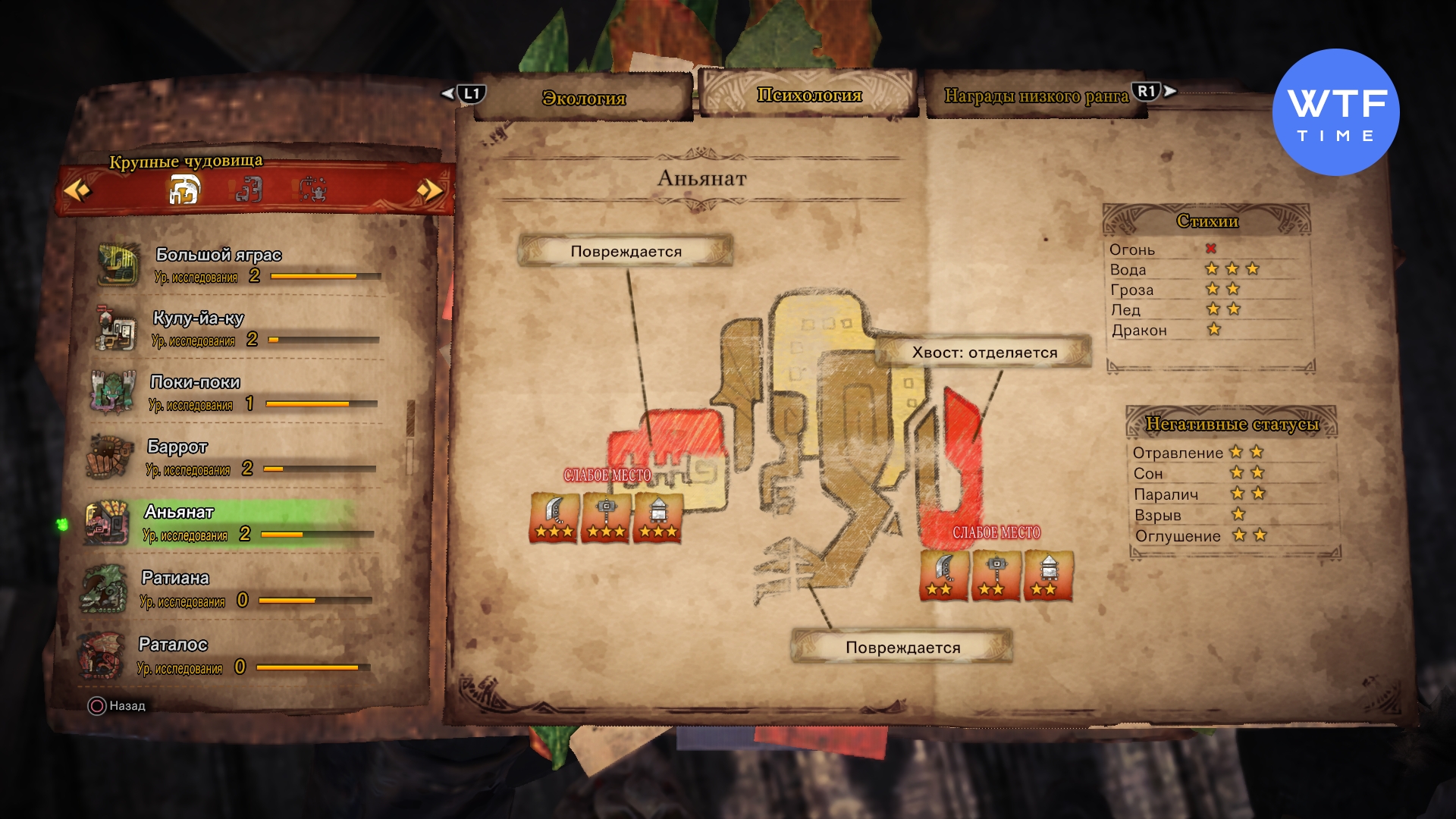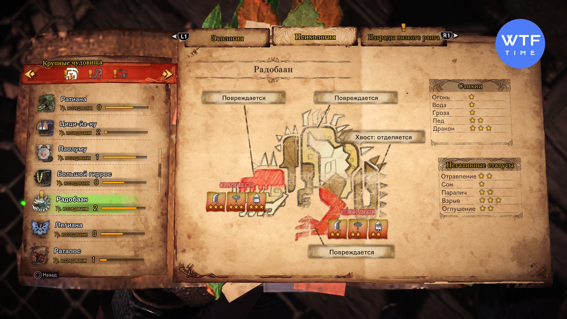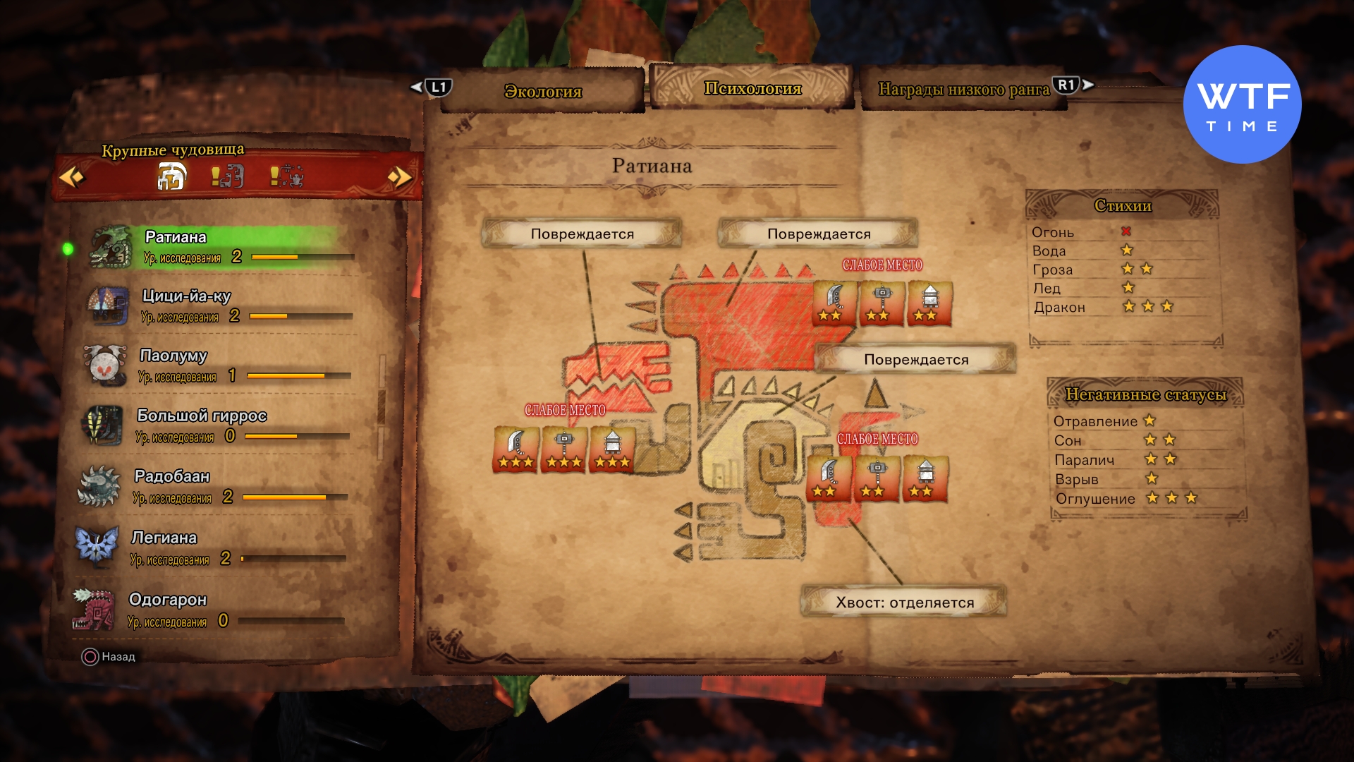 Ратиана уязвима к стихии дракона, поэтому рекомендуем вам выковать оружие с соответствующим эффектом. Еще она хорошо восприимчива к оглушению. Самые слабые места этого монстра - голова и крылья. Хвост можно отрубить, чтобы размах был поменьше. Начать поиски этого чудовища в Дикогорье стоит с 12 сектора, у неё там гнездо. Если там пусто - прогуляйтесь в сторону 3 сектора. В Древнем лесу она гуляет по области.